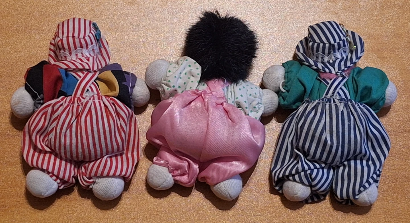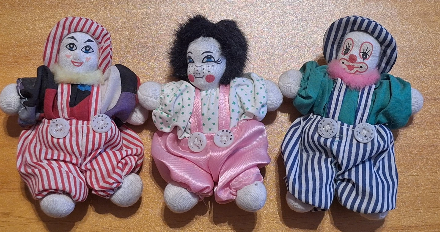 Selling a set of three vintage Hubao clown dolls, sand-filled figurines. They each have unique outfits and features. The dolls are in good condition. A great addition to any collection!