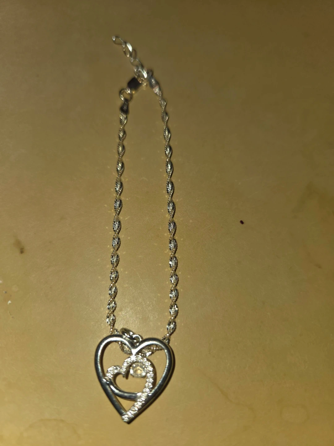 A lovely silver bracelet featuring a heart pendant! The pendant has a smaller heart inside, adding a sweet touch. The chain is delicate and sparkly, perfect for adding a bit of shine to any outfit!