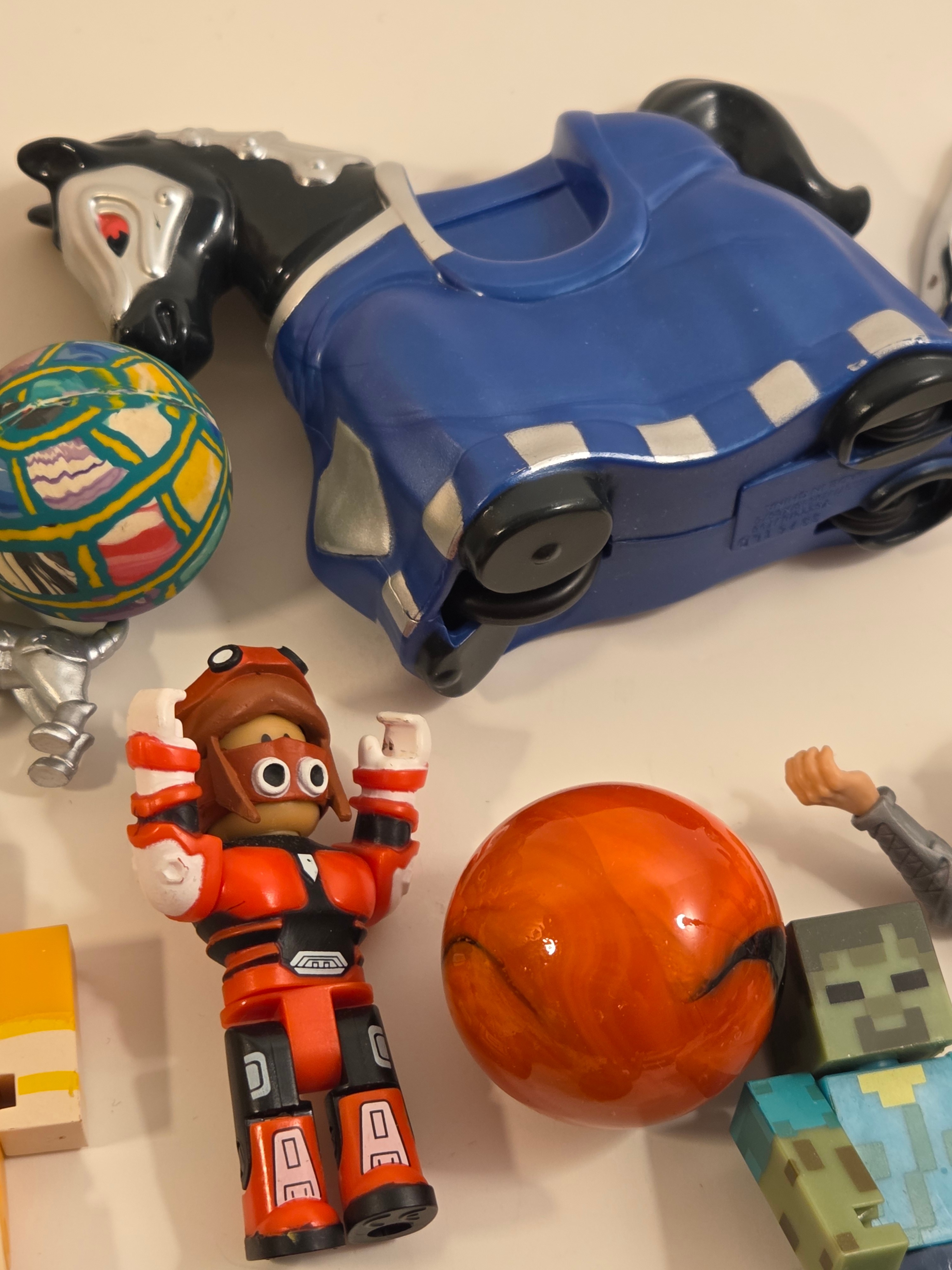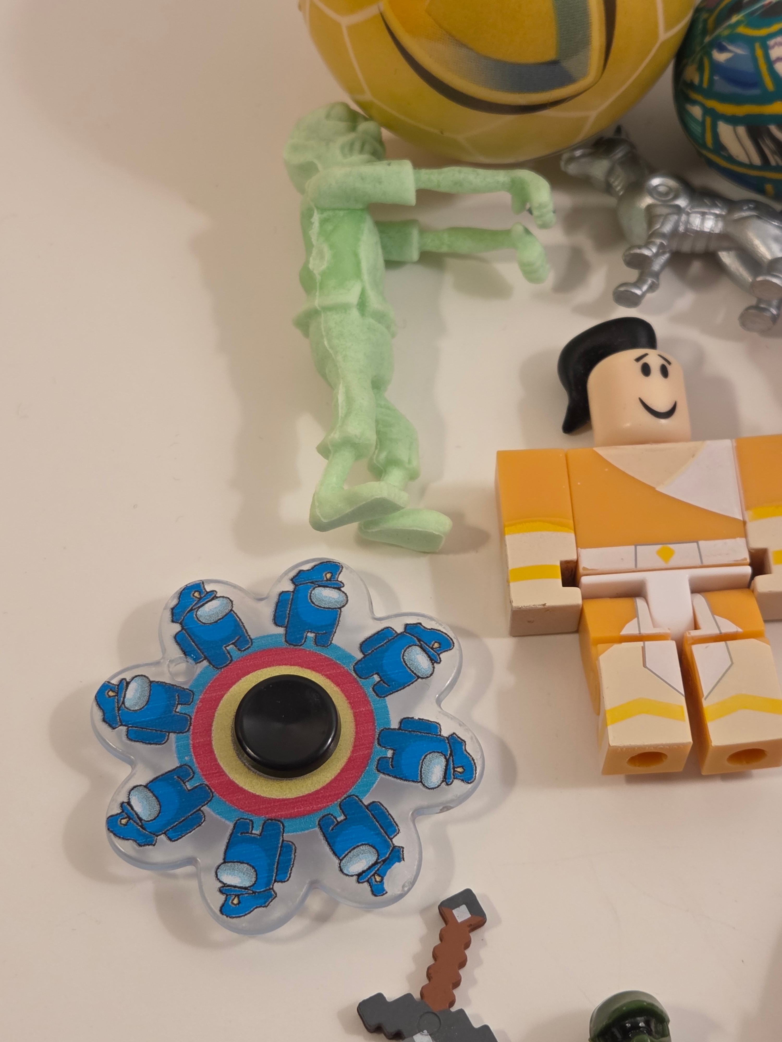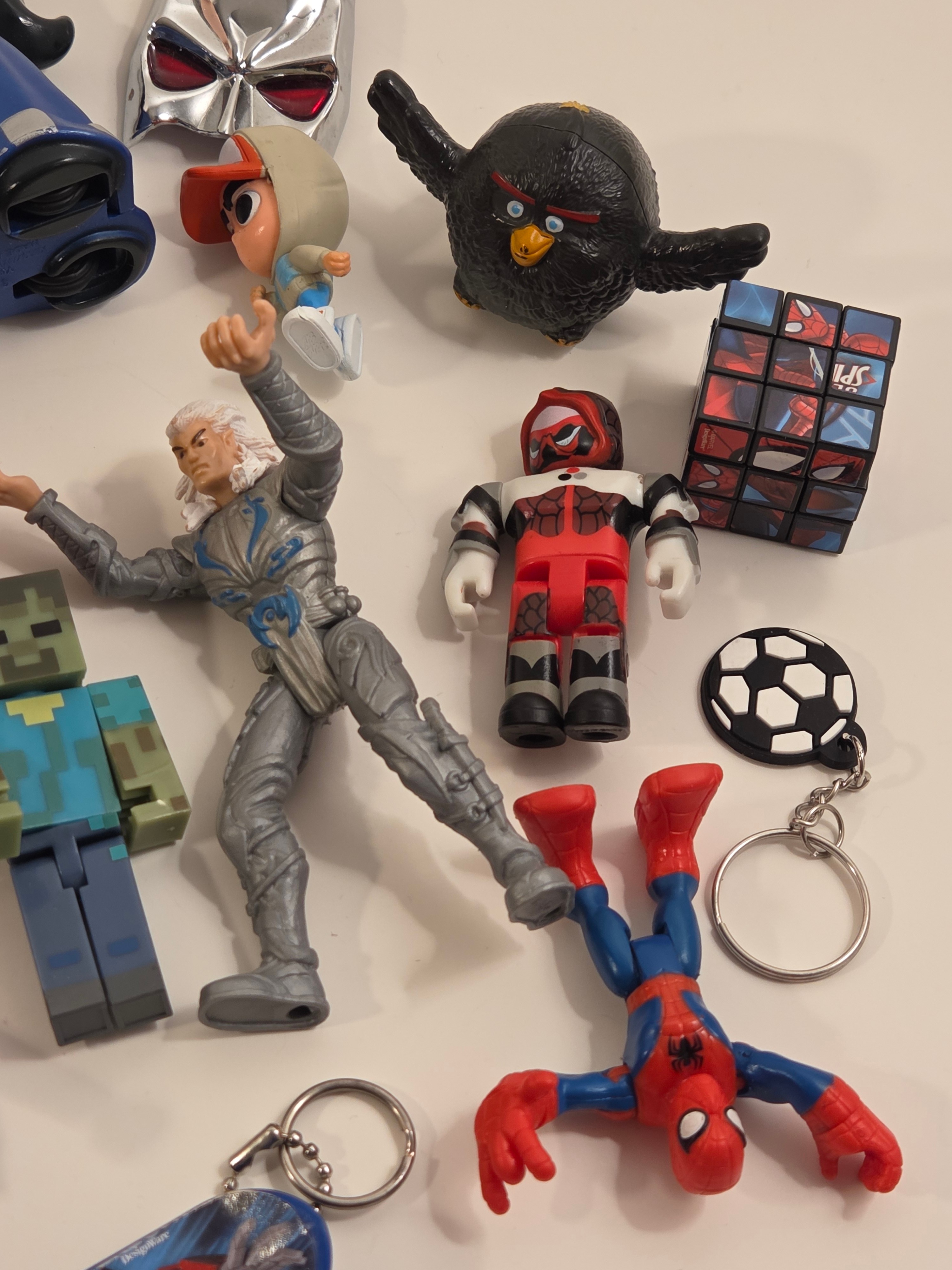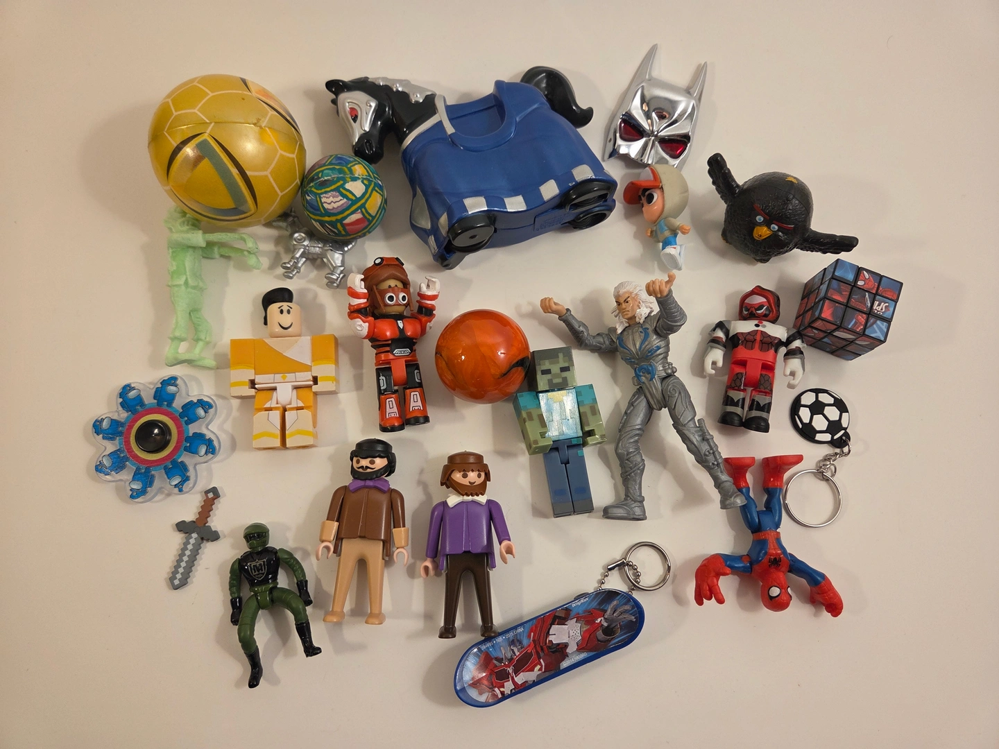 Fun mixed bundle of 23 small toys – great for party favors, goodie bags, desk toys or a rainy-day play bin. Highlights include: 2 Playmobil figures, Roblox minifigures, Minecraft zombie + pixel sword, Angry Birds black bird, Spider-Man keychain and mini cube puzzle, Among Us fidget spinner, mini fingerboard, bouncy balls, mask piece and more.
