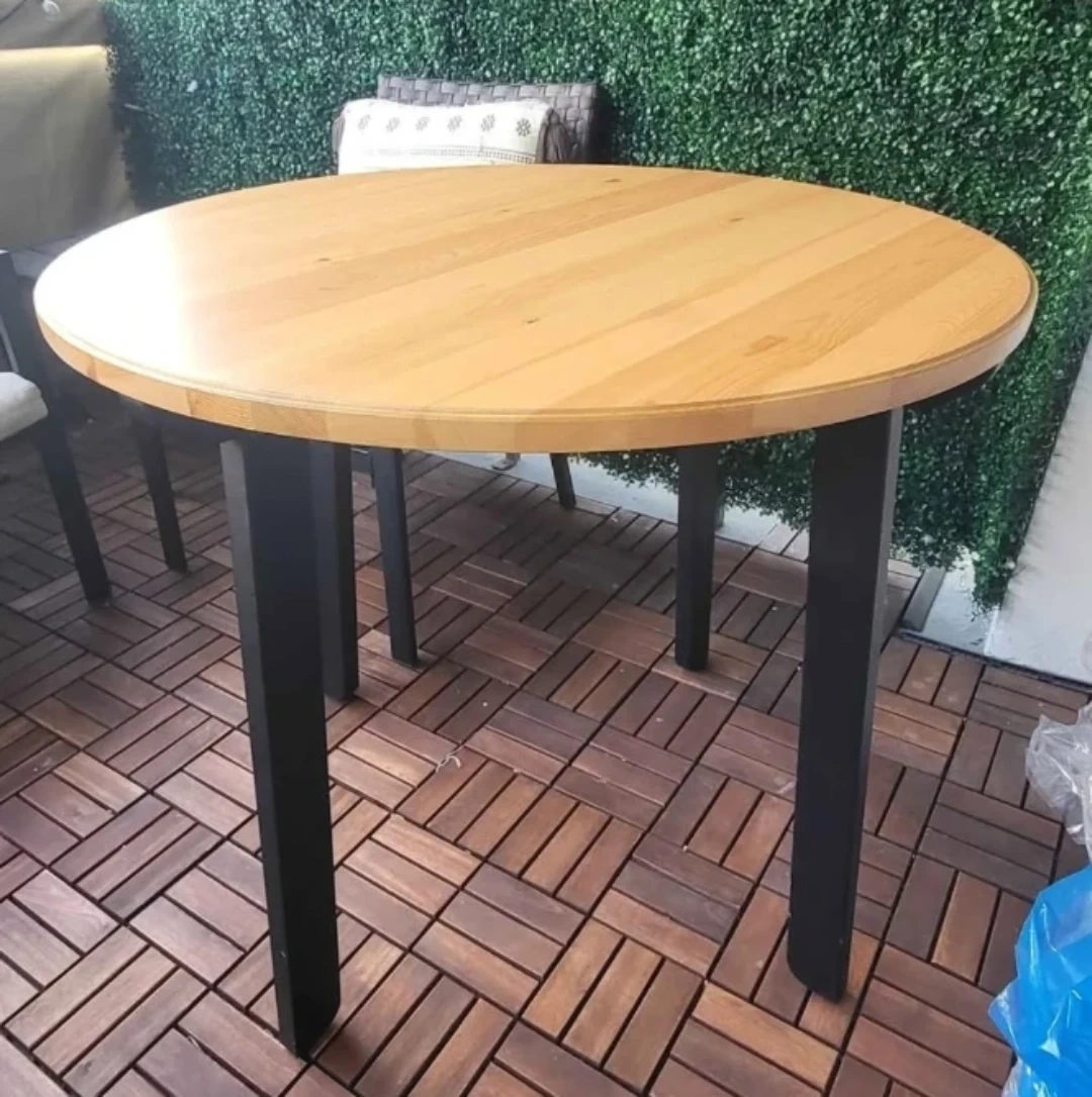 Selling a round wooden dining table with black legs. It measures approximately 33 inches in diameter and 30 inches in height. Great for a small dining area or balcony!