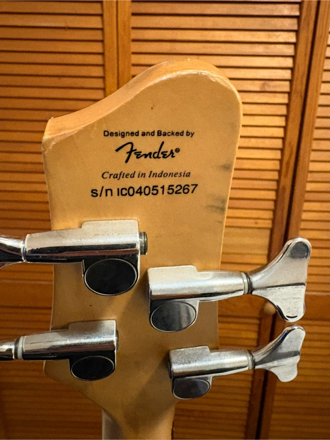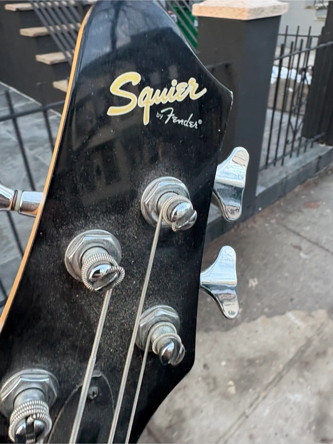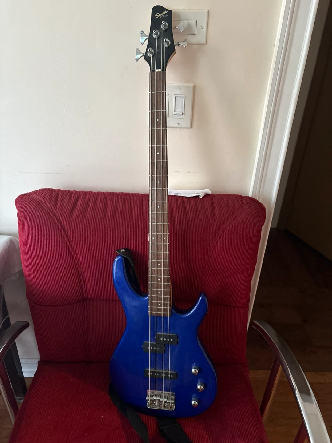 Selling a Squier by Fender bass guitar in blue. It's in good condition and ready for a new musician. Crafted in Indonesia.