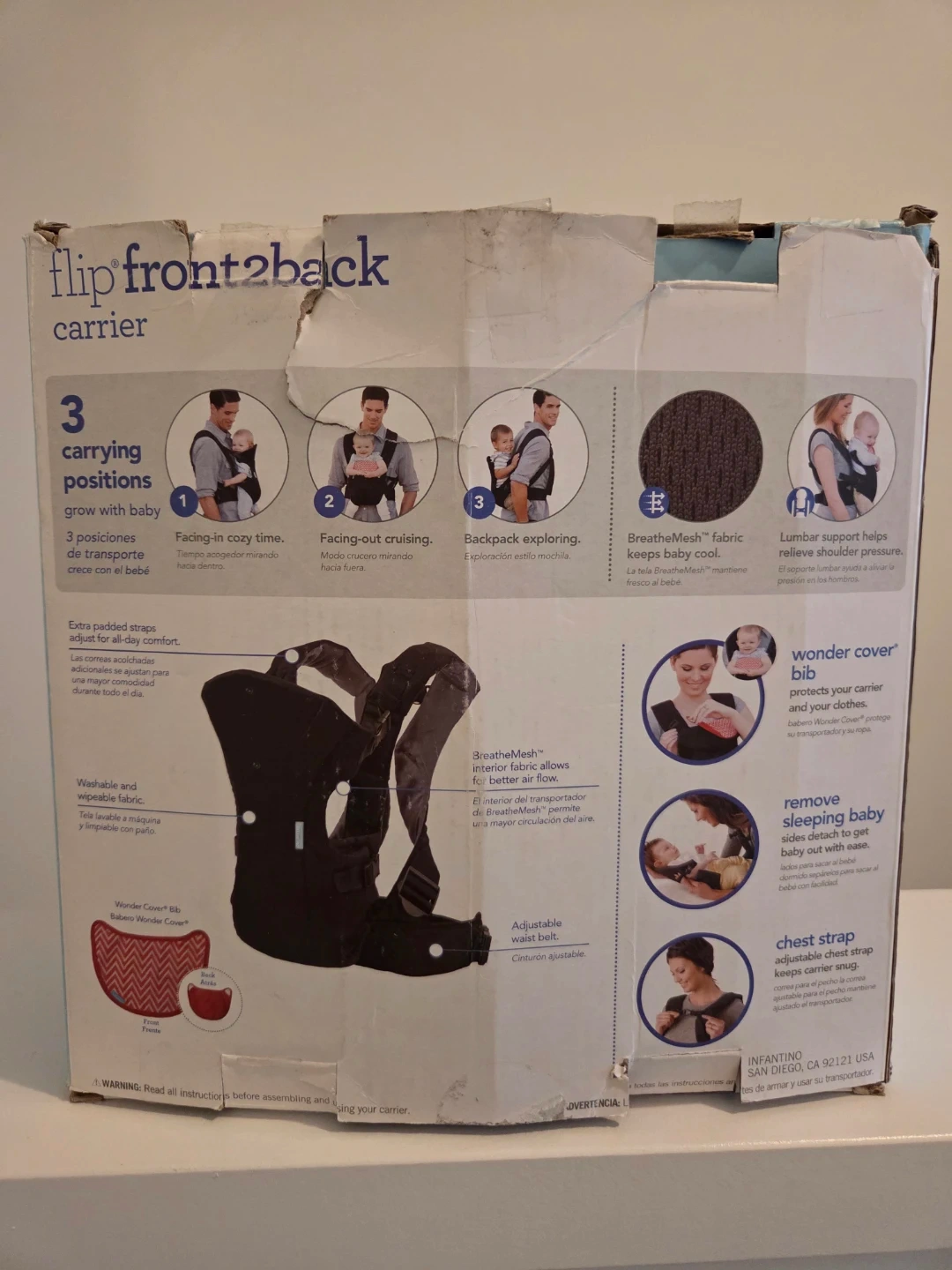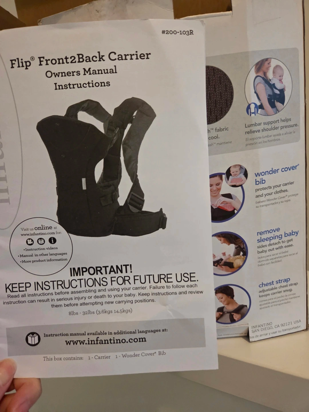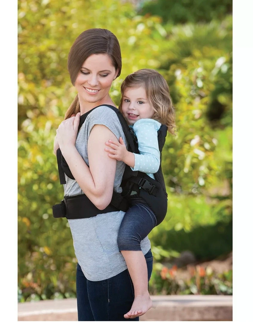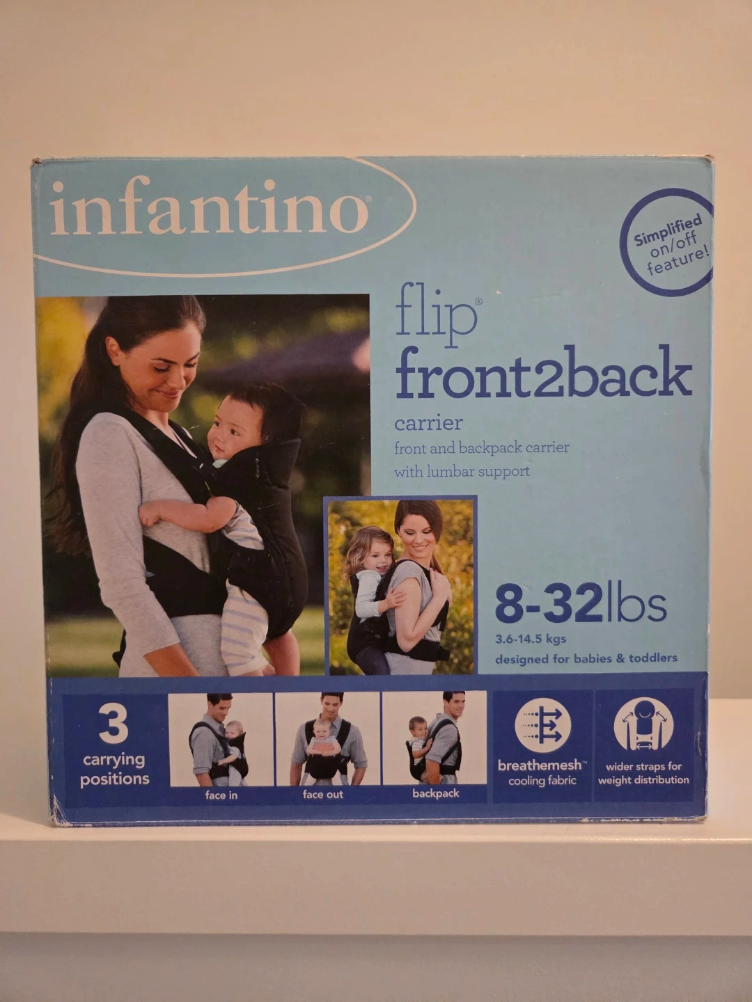 This carrier supports babies and toddlers from 8-32lbs (3.6-14.5kgs). It features 3 carrying positions: face in, face out, and backpack. The BreatheMesh fabric keeps baby cool and comfortable.