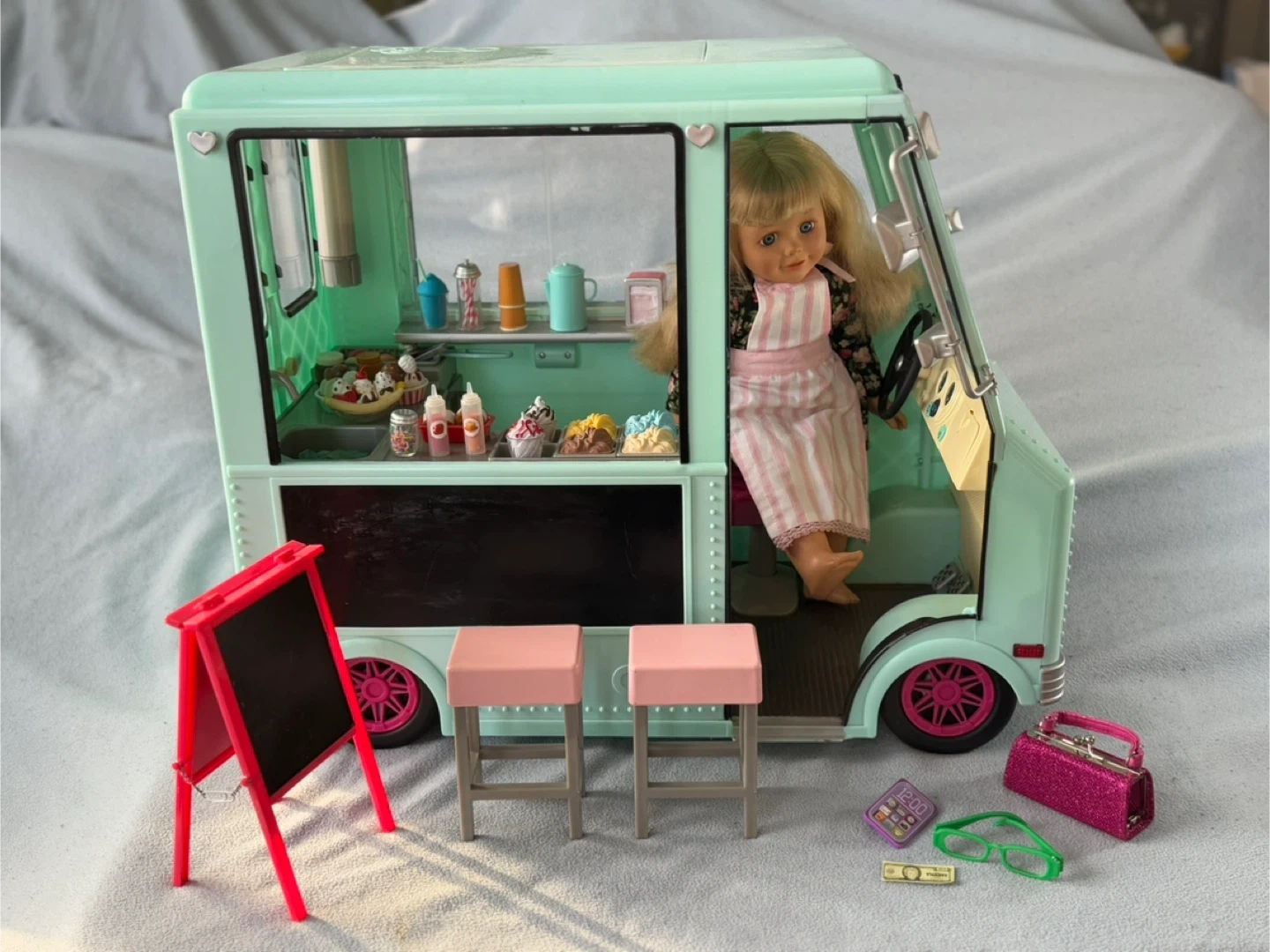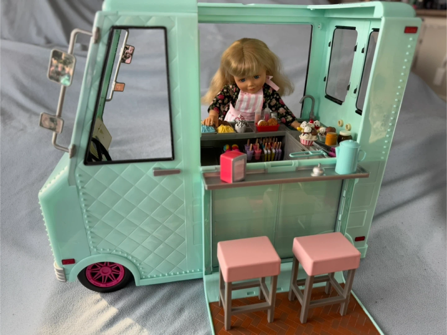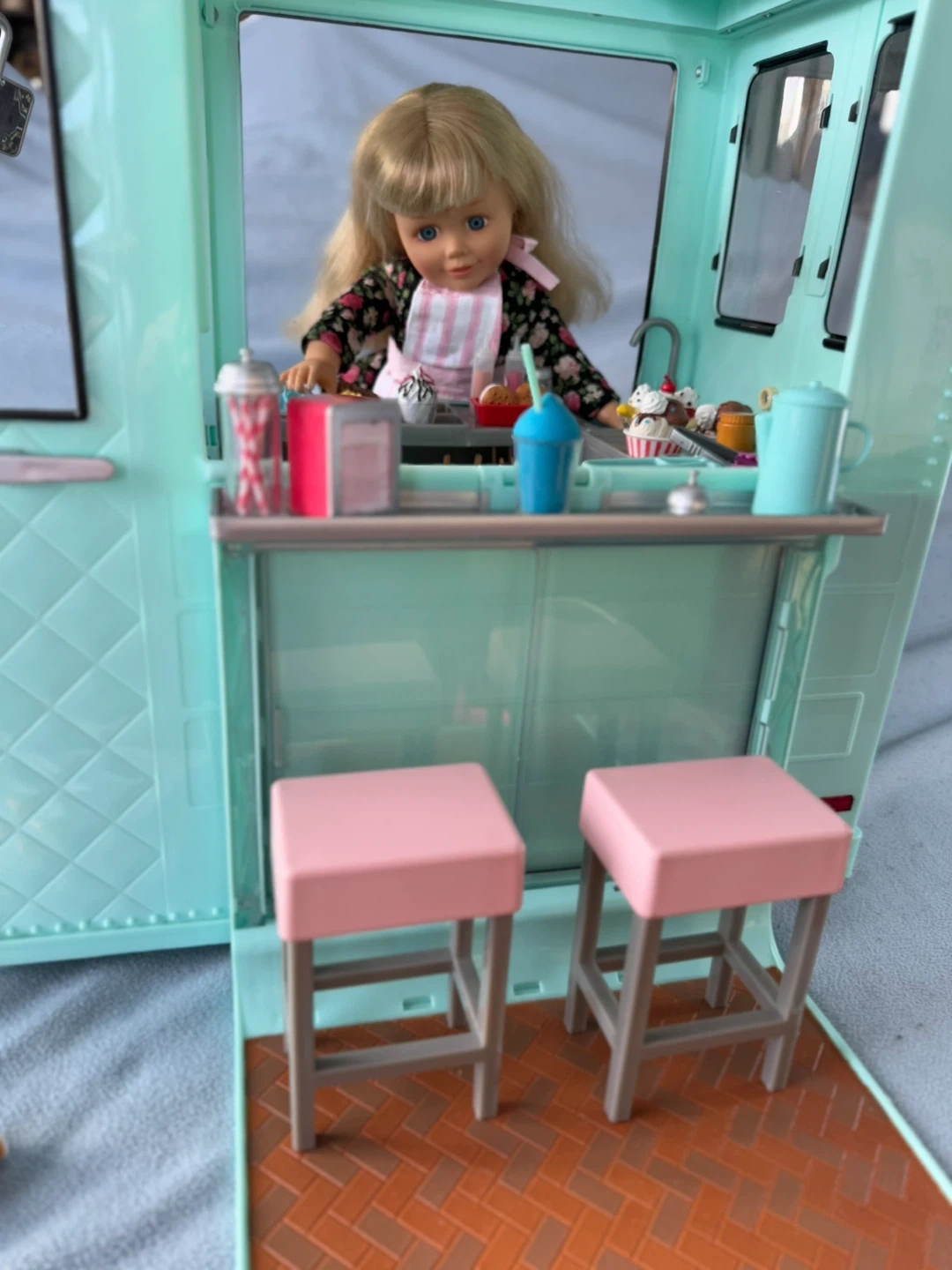 Step right up to Ivy’s ice cream truck! She loves seeing the joy of others as they enjoy her ice cream. Comes with truck, Ivy, stools, and lots of accessoires! Check out my other listings. Open to offers.