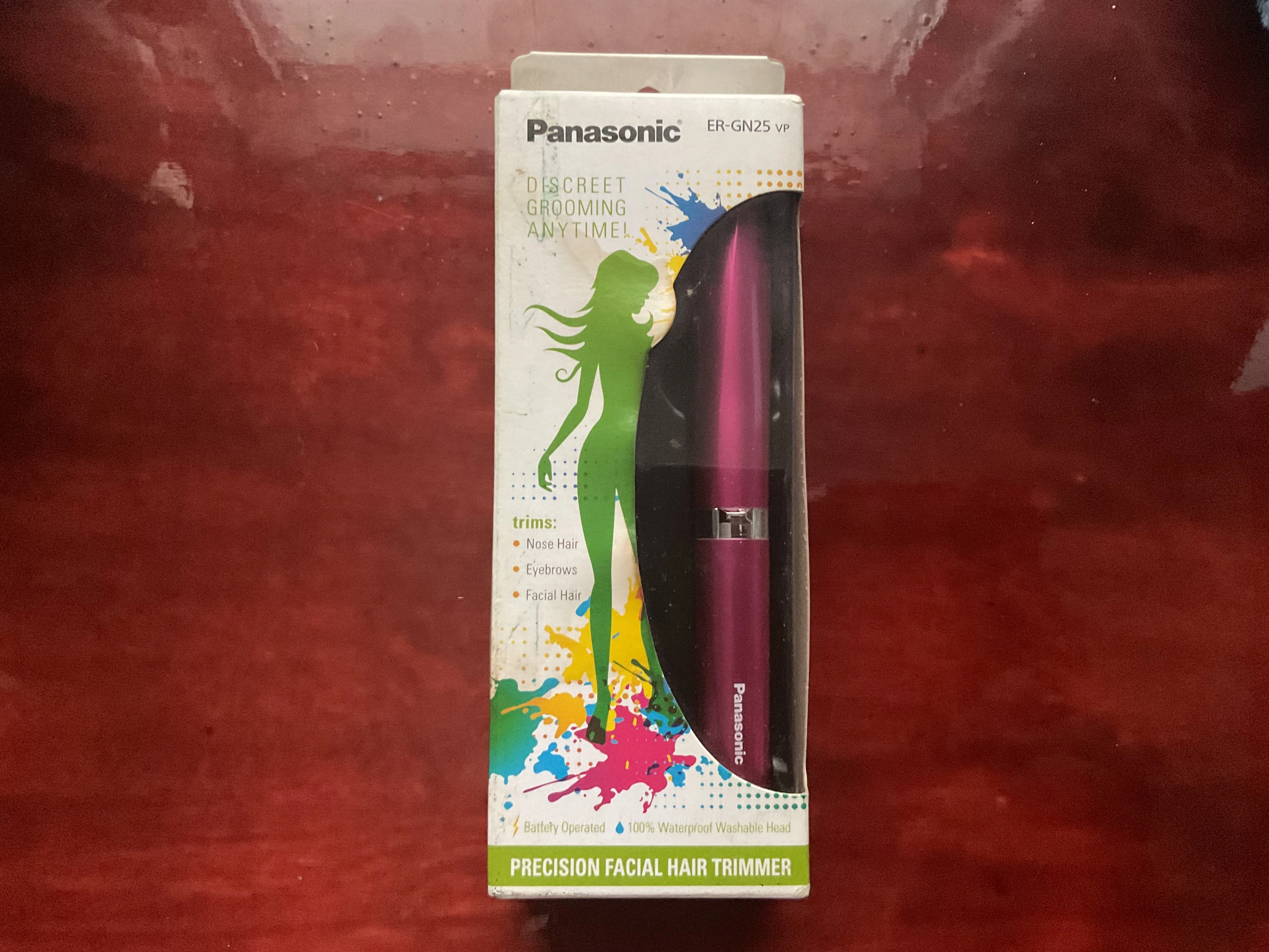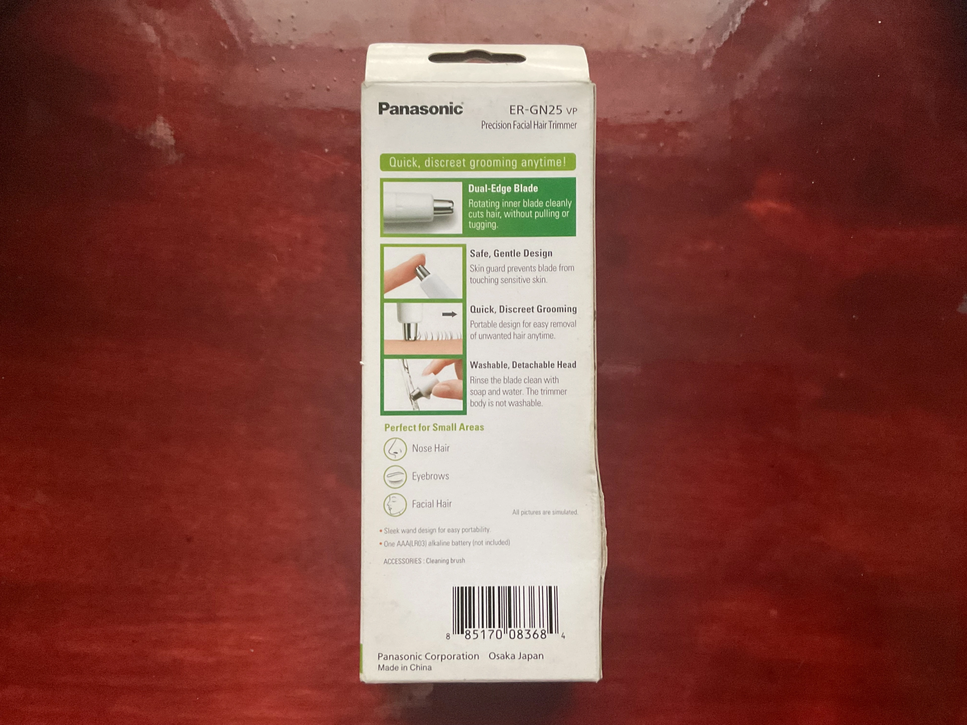 I'm selling a Panasonic ER-GN25VP Precision Facial Hair Trimmer. It's perfect for small areas like nose hair, eyebrows, and facial hair. It features a dual-edge blade and a safe, gentle design. The head is detachable and washable, making it easy to clean. It's battery operated and the cleaning brush accessory is included!