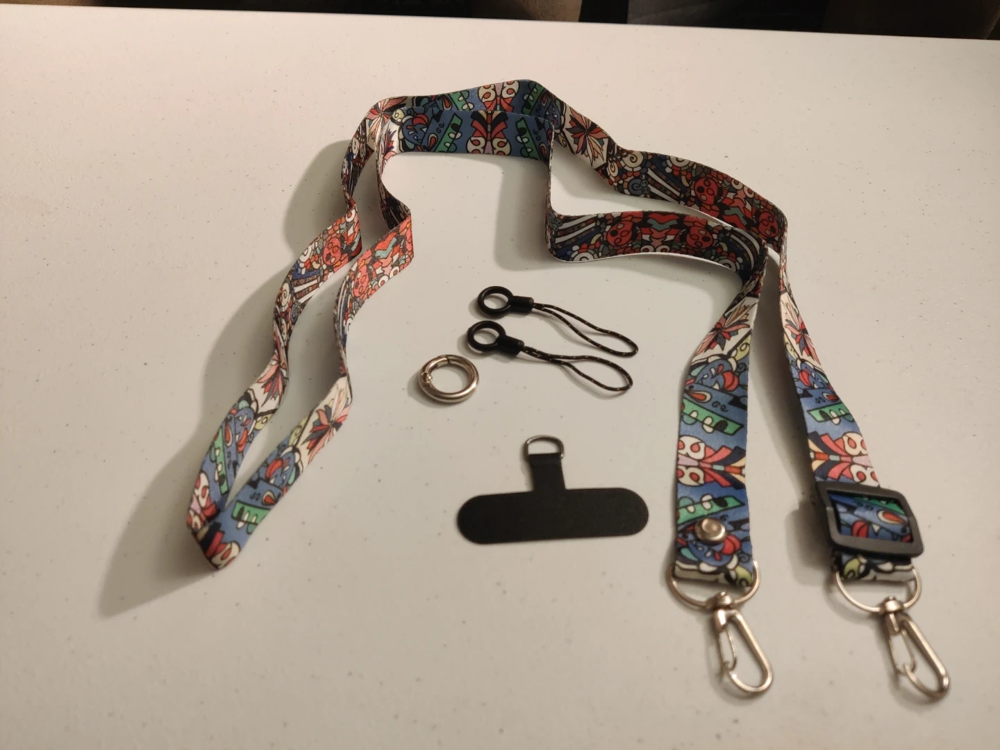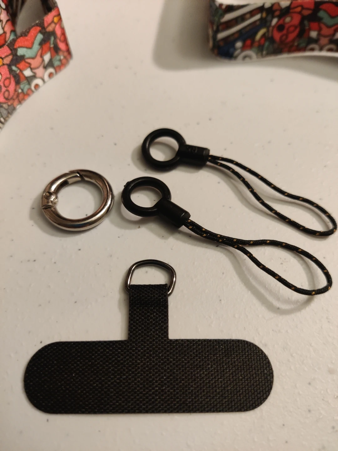 Selling a brand new patterned cell phone lanyard that comes with a few accessories! It includes two small black connectors, a silver ring, and a black phone connector. Perfect for keeping your phone secure and adding a bit of style.