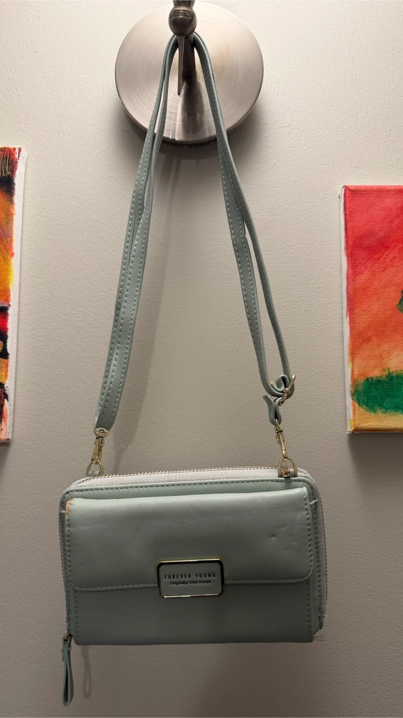FREE!!! cute mint green crossbody bag from Forever Young! It's perfect for carrying your essentials and has a convenient strap. There are some signs of wear.