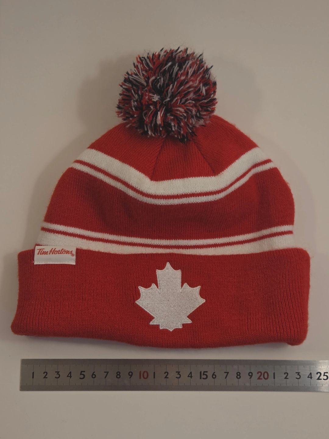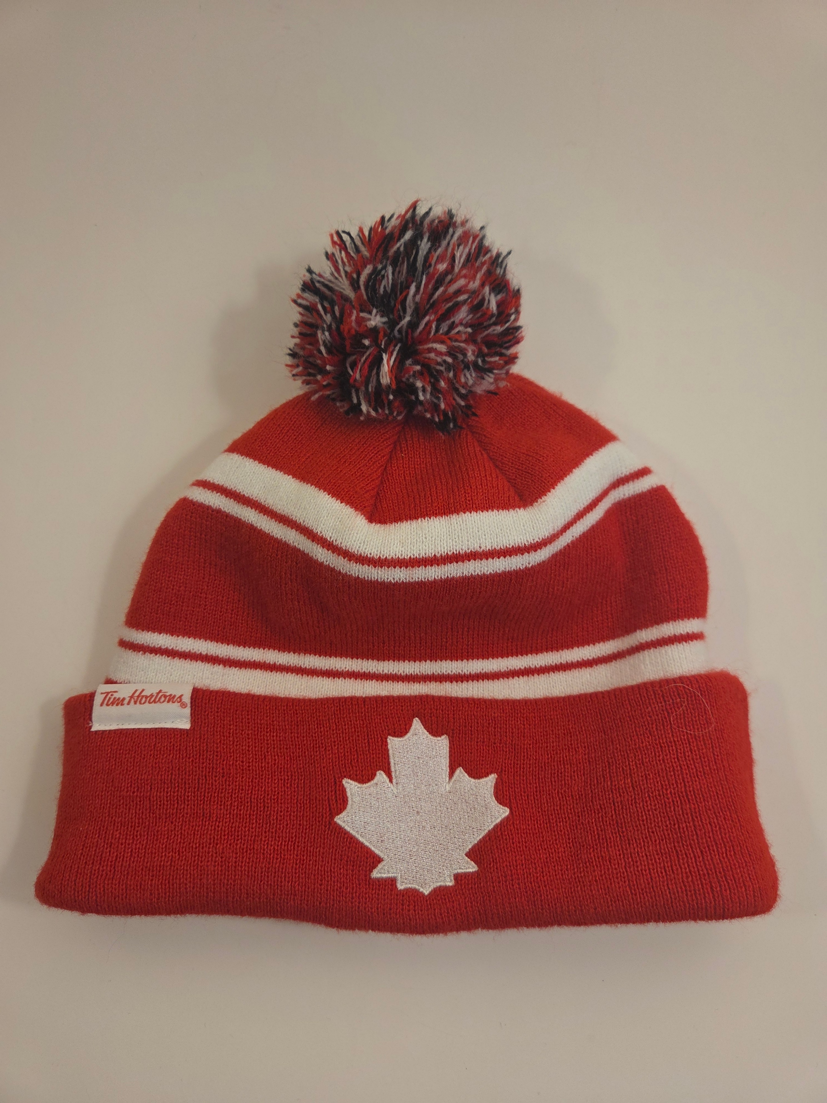 Cozy Tim Hortons pom toque in classic Canada colours. Red knit with white stripes, fold-over cuff and a white maple leaf patch. Unisex adult fit.