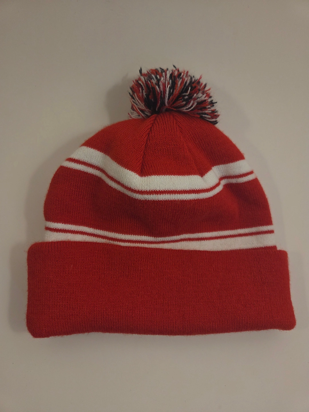 – Size (flat, approximate): width across cuff 21–22 cm (8.3–8.7 in); height without pom 21 cm (8.3 in); height with pom ~27–28 cm (10.6–11 in); cuff height ~7.5 cm (3 in).
