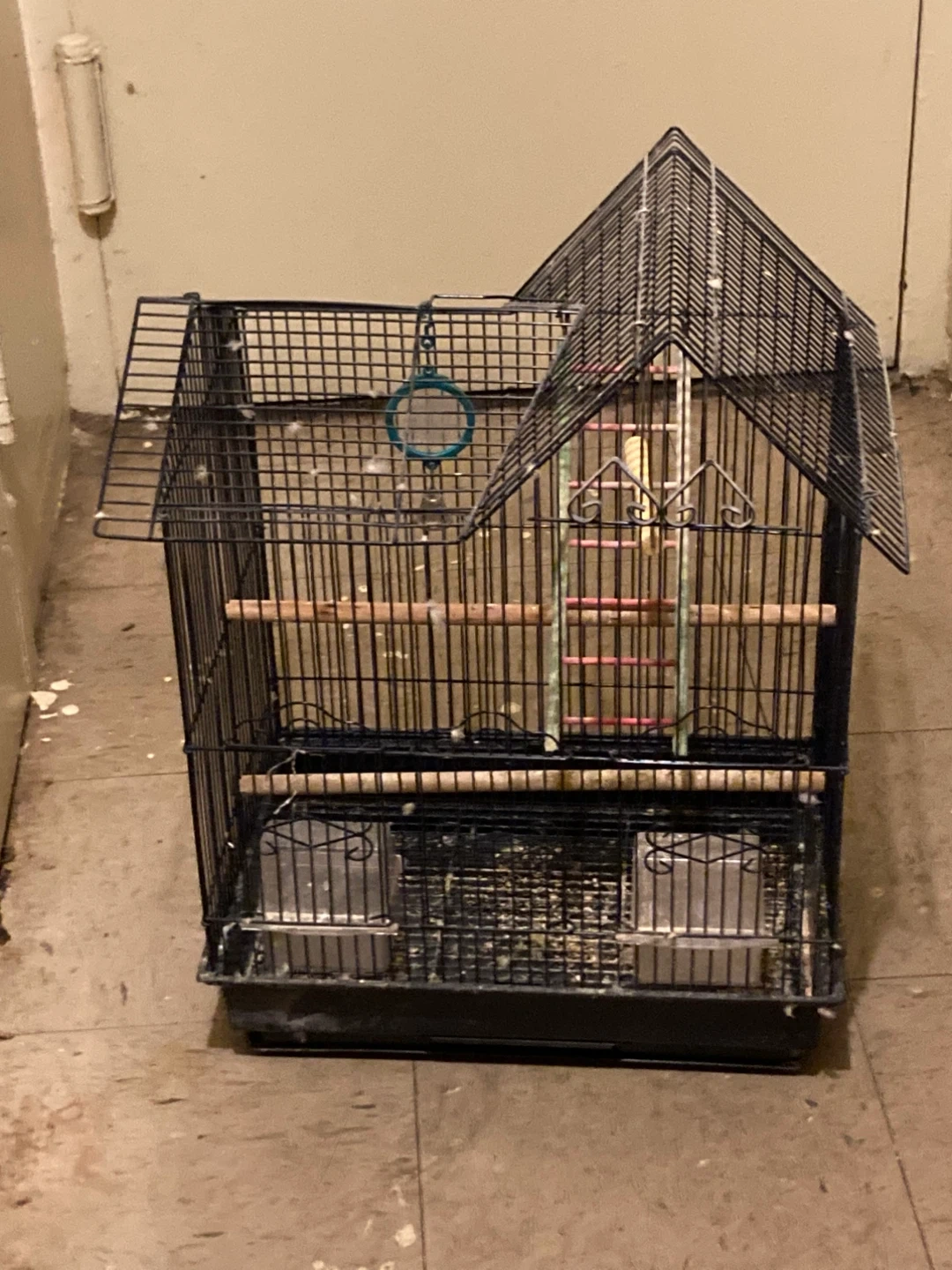 Giving away for free exactly how it is a bird cage in black. It has a house-shaped roof and includes perches and food/water containers.