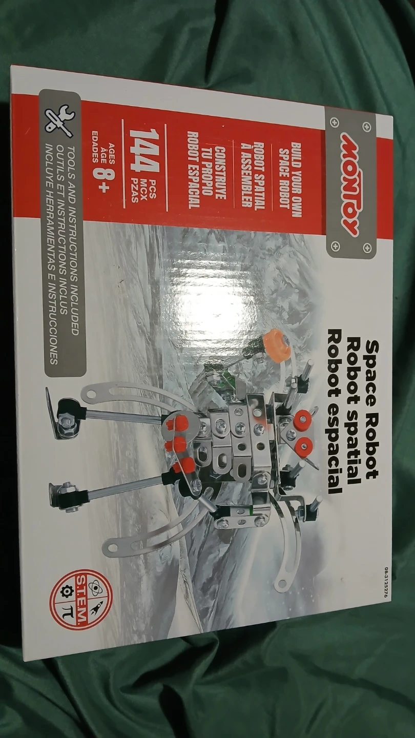 Build your own space robot with this Montoy robot spatial kit! It includes 144 pieces and tools and instructions. Recommended for ages 8 and up