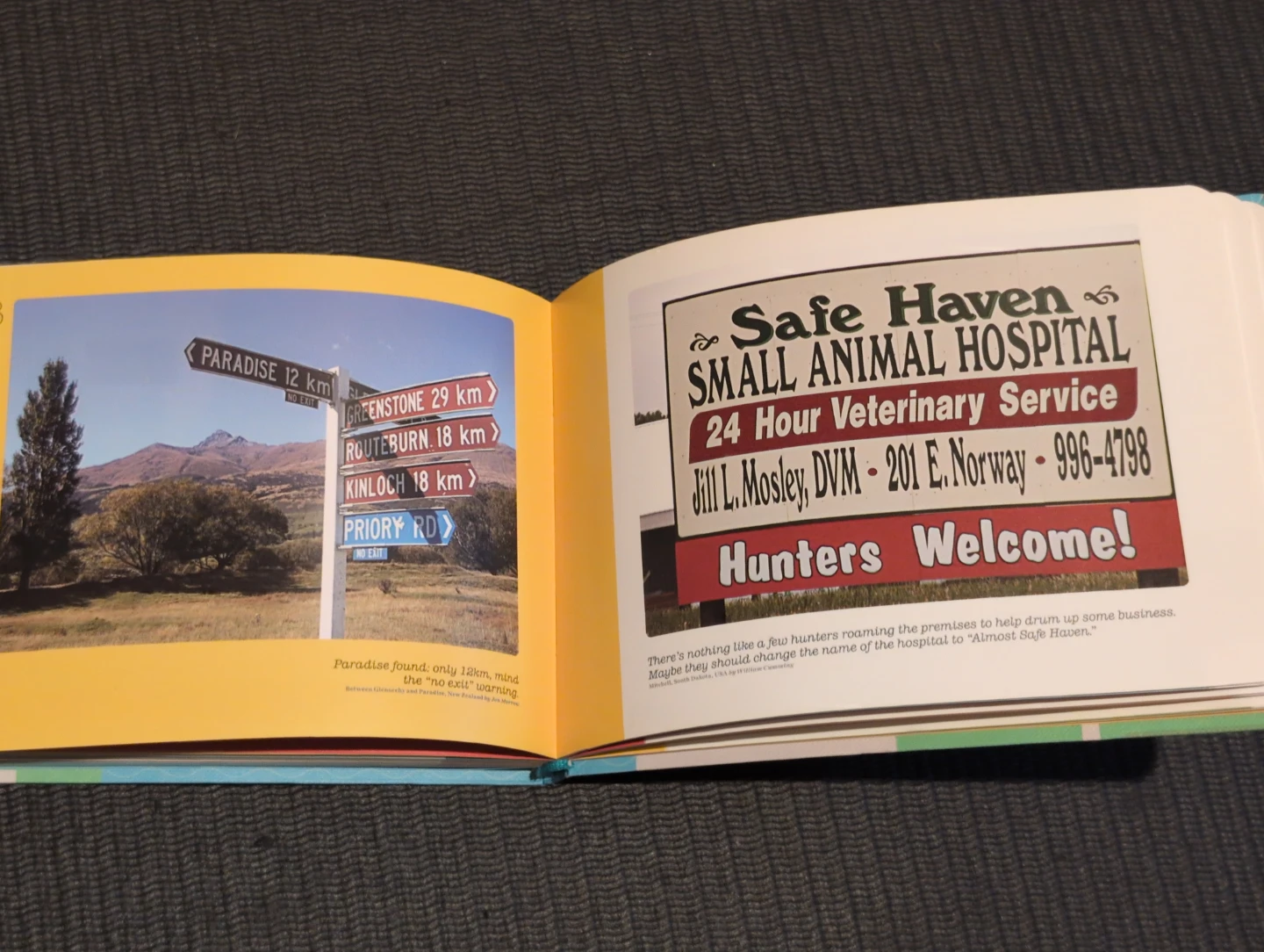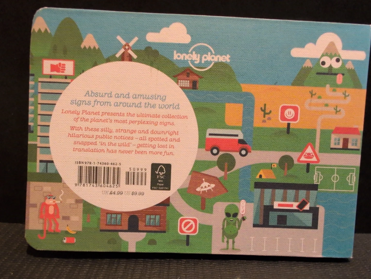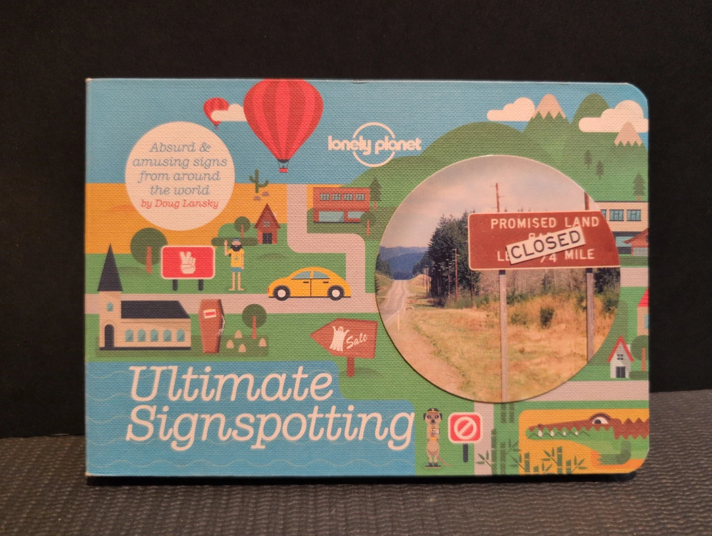 Selling a hilarious softcover Lonely Planet book called Ultimate Signspotting! It's filled with over 150 pages of absurd and amusing signs from around the world, collected by Doug Lansky. It's a fun collection of the planet's most perplexing signs.
