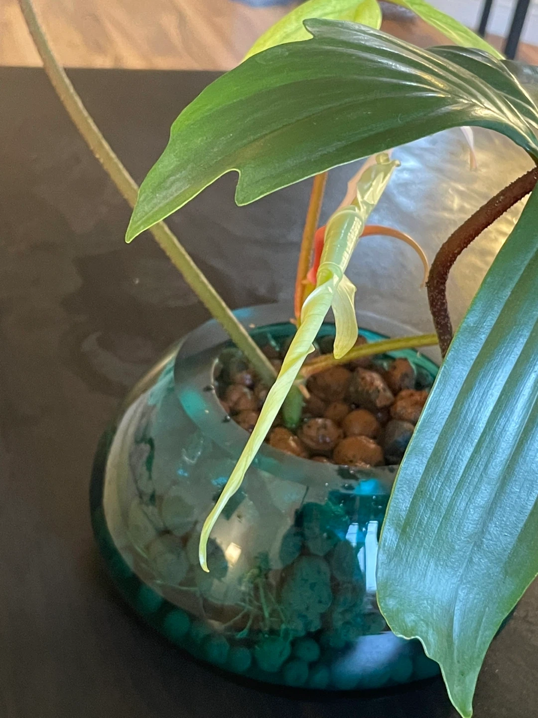 Selling a beautiful Philodendron Florida Ghost plant! It's in a lovely glass pot with pebbles. This plant is known for its unique foliage that starts out white and matures to a vibrant green. It would make a great addition to any plant collection!