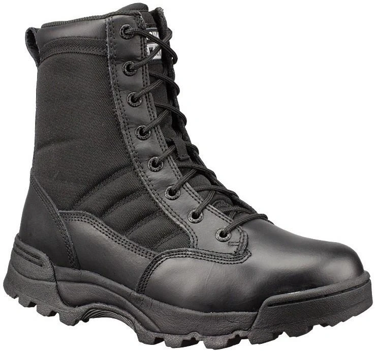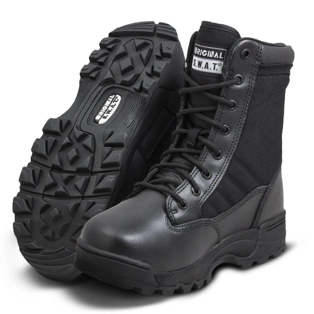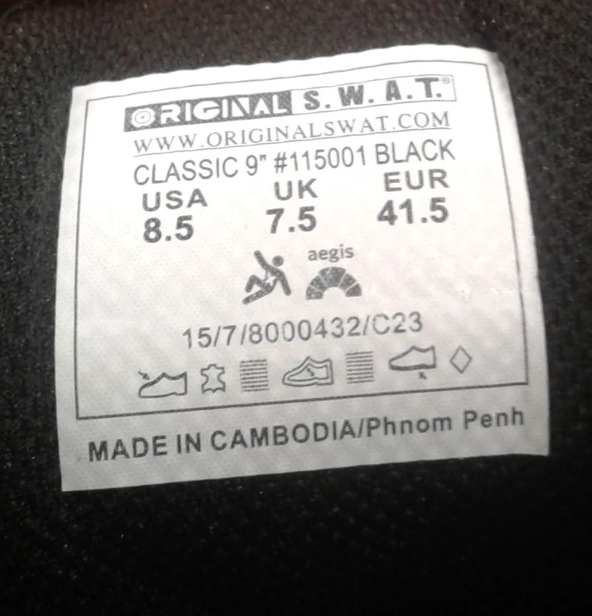 Selling a pair of Original S.W.A.T. Classic 9" boots in black #115001. They are a US size 8.5, UK size 7.5, and EUR size 41.5. These boots are made in Cambodia/Phnom Penh and are brand new! Rugged 9″ tactical boot combining full-grain leather and 1000D Cordura® for durability and comfort Slip- and oil-resistant rubber outsole (non-marking) exceeds ASTM F2913-2011 slip standards Features include foam-padded collar & tongue, gusseted tongue, AEGIS antimicrobial lining, and removable EVA insole Reinforced with steel shank, Texon stability platform, and molded heel/toe counters for support Ideal for law enforcement, security, patrol, and tactical duty use Specifications Upper: full-grain leather + 1000 denier Cordura® nylon Midsole: phylon EVA + Texon stability platform Support: steel shank for rigidity and torsional control Outsole: slip- and oil-resistant rubber, non-marking, stitched at toe/heel Lining: moisture-wicking with AEGIS antimicrobial protection Insole: removable custom-fit EVA footbed