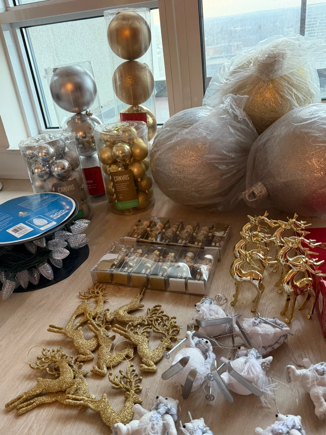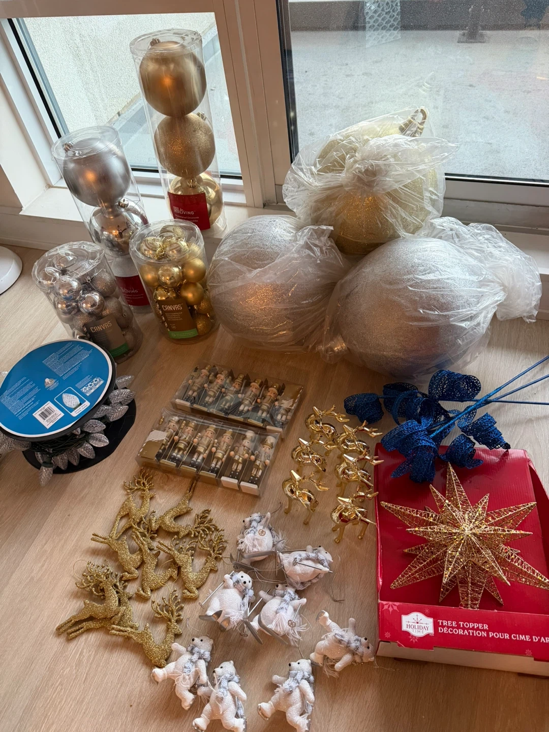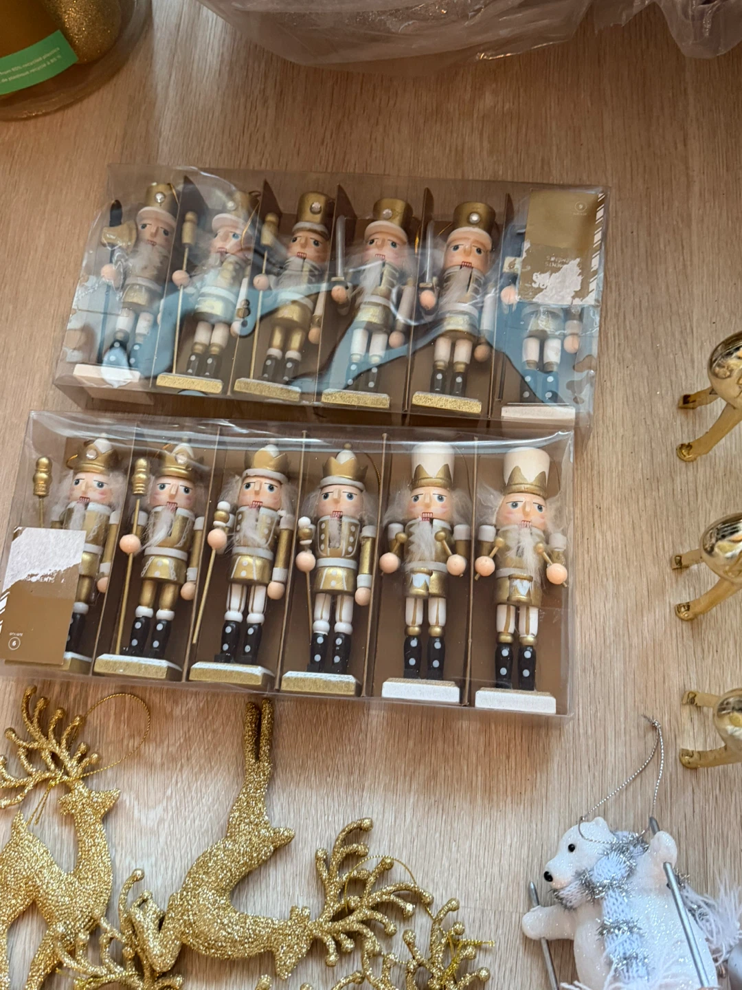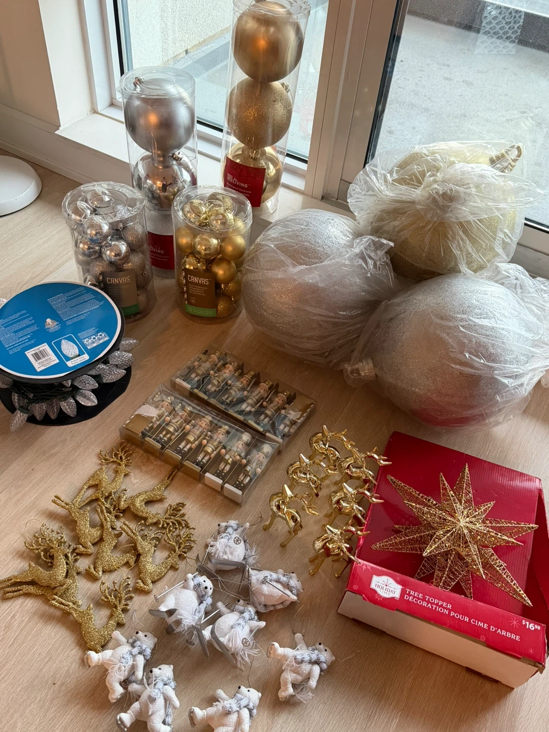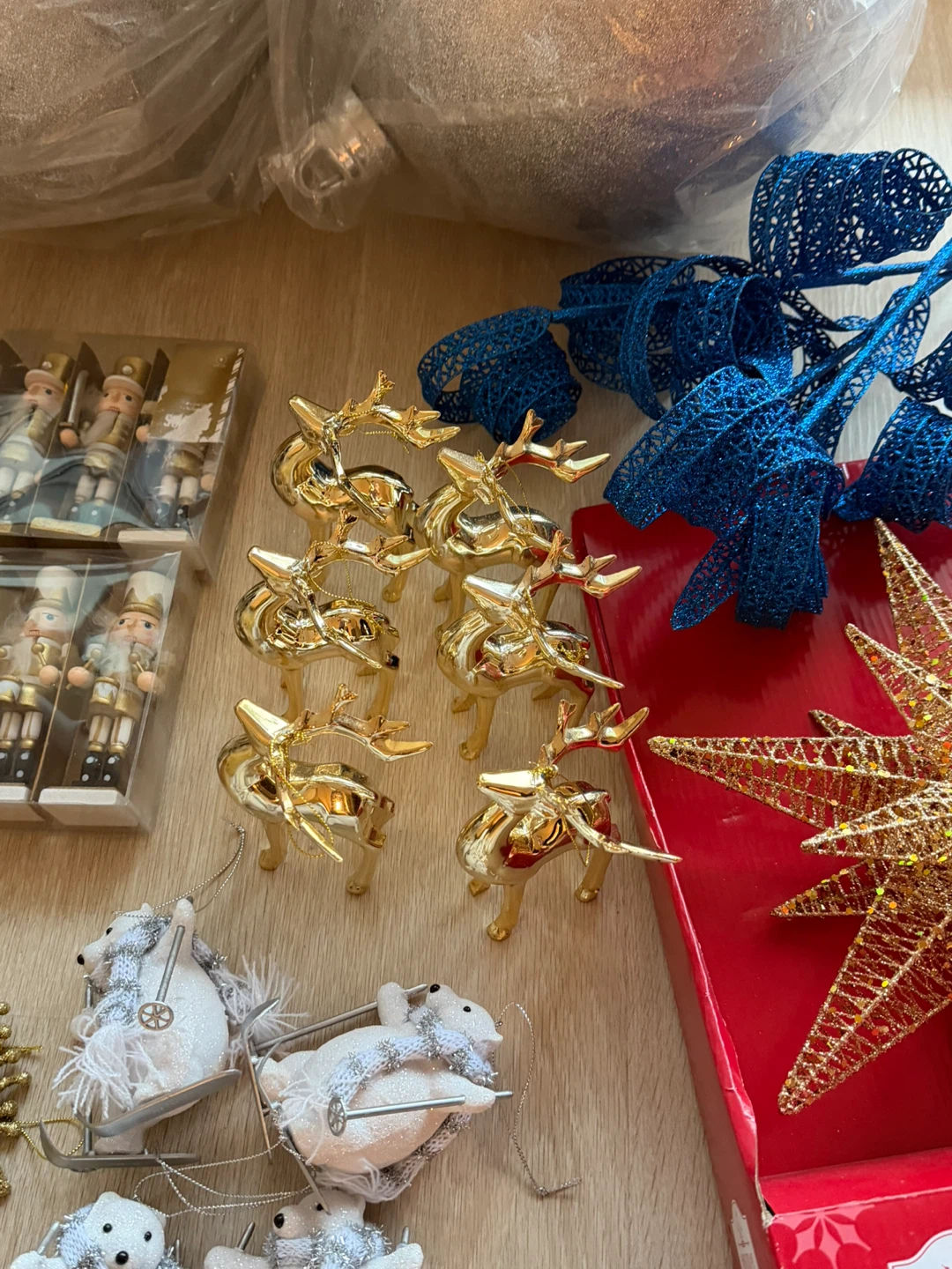 Price firm ****Selling a collection of Christmas ornaments and a tree topper! There are gold and silver ornaments, reindeer, nutcrackers, and cute polar bear ornaments. Also included is a gold star tree topper. Get ready to decorate!