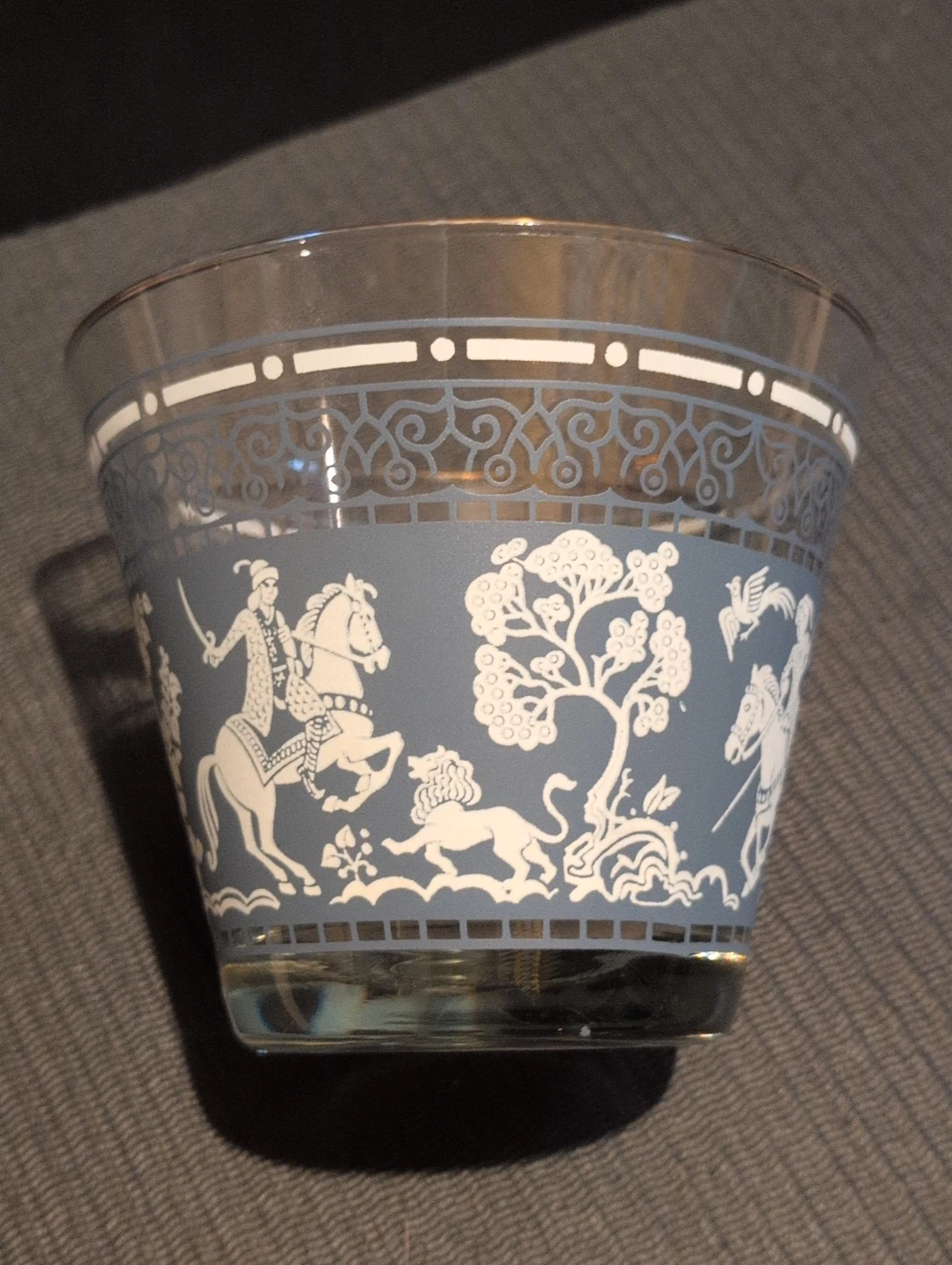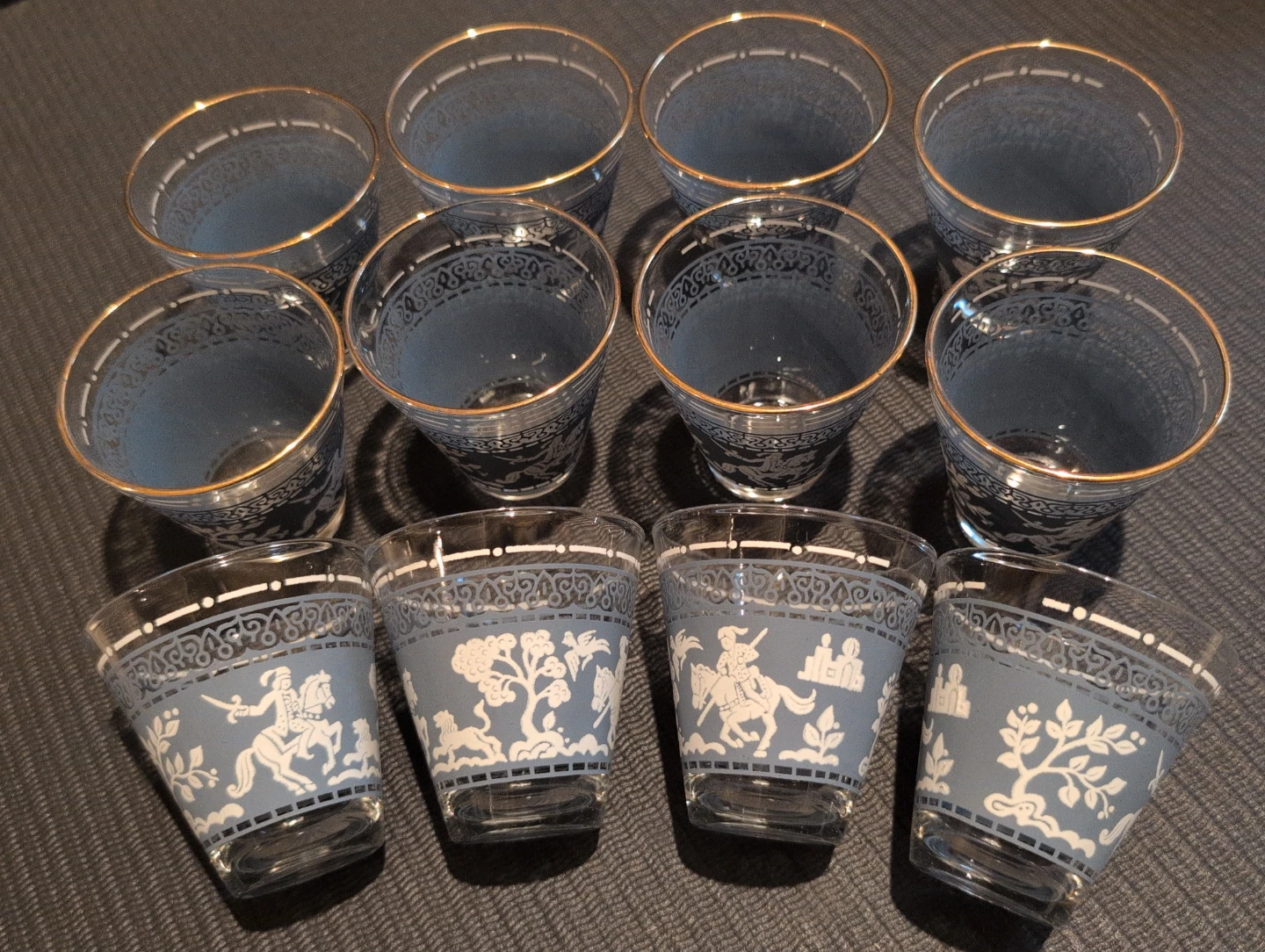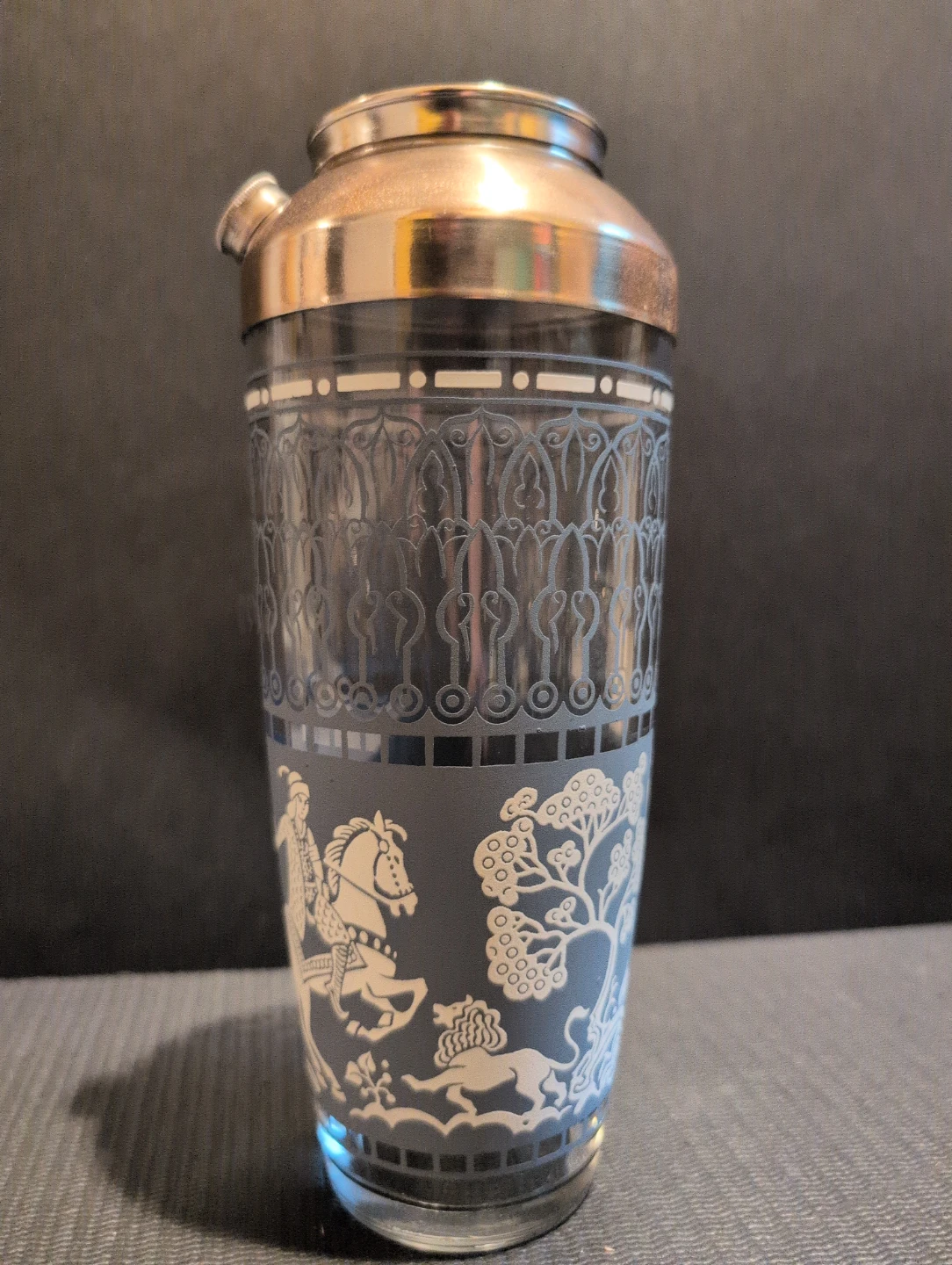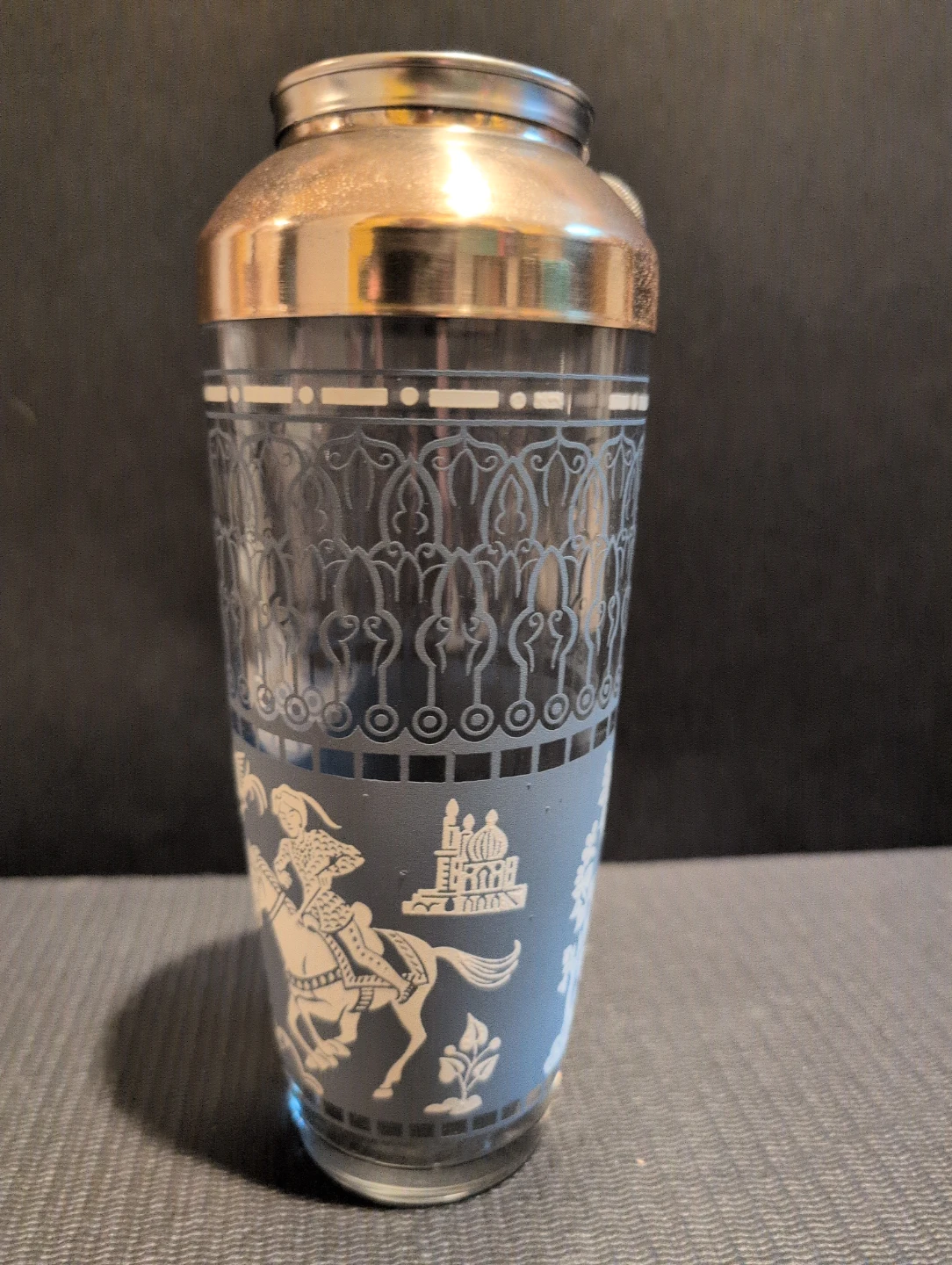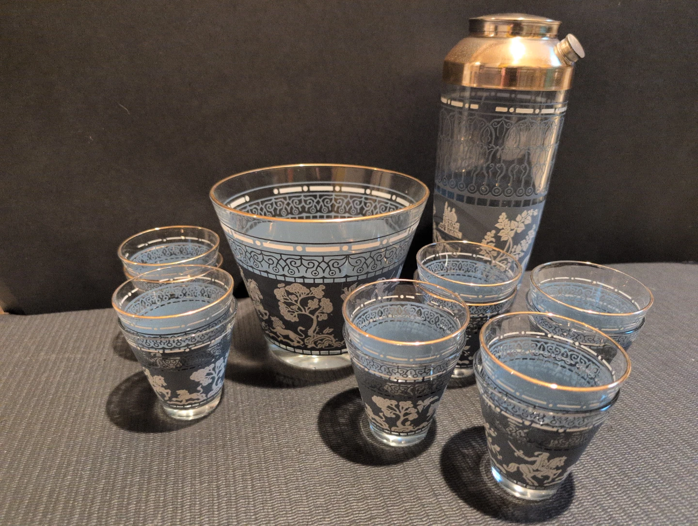 Selling a vintage cocktail shaker, 12 matching glasses and ice bucket. The set features a unique eastern inspired design with figures on horseback and other motifs in white against a blue background. The shaker has a metallic top. No chips, no cracks, in great shape, a great addition to any home bar!