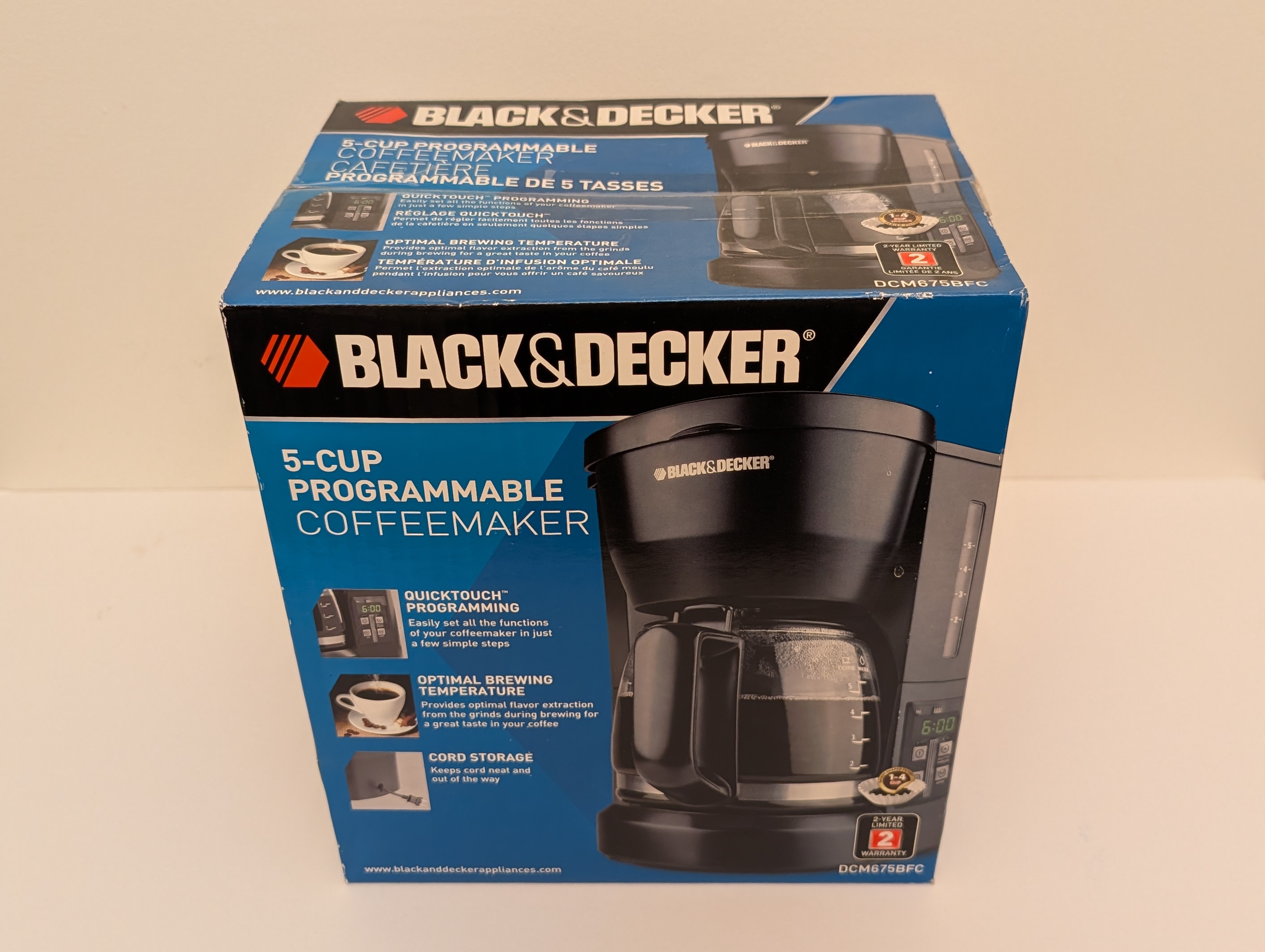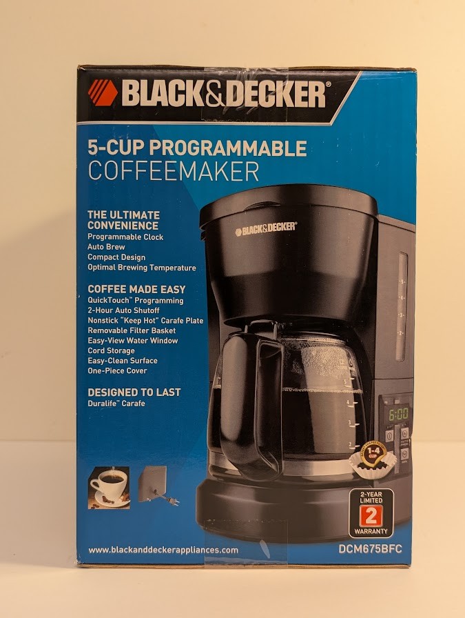Selling a brand new Black & Decker 5-Cup Programmable Coffeemaker! It features QuickTouch programming, optimal brewing temperature, and cord storage. The coffeemaker is designed with a Durallife carafe for lasting use. It also includes a nonstick 'keep hot' carafe plate and a removable filter basket.