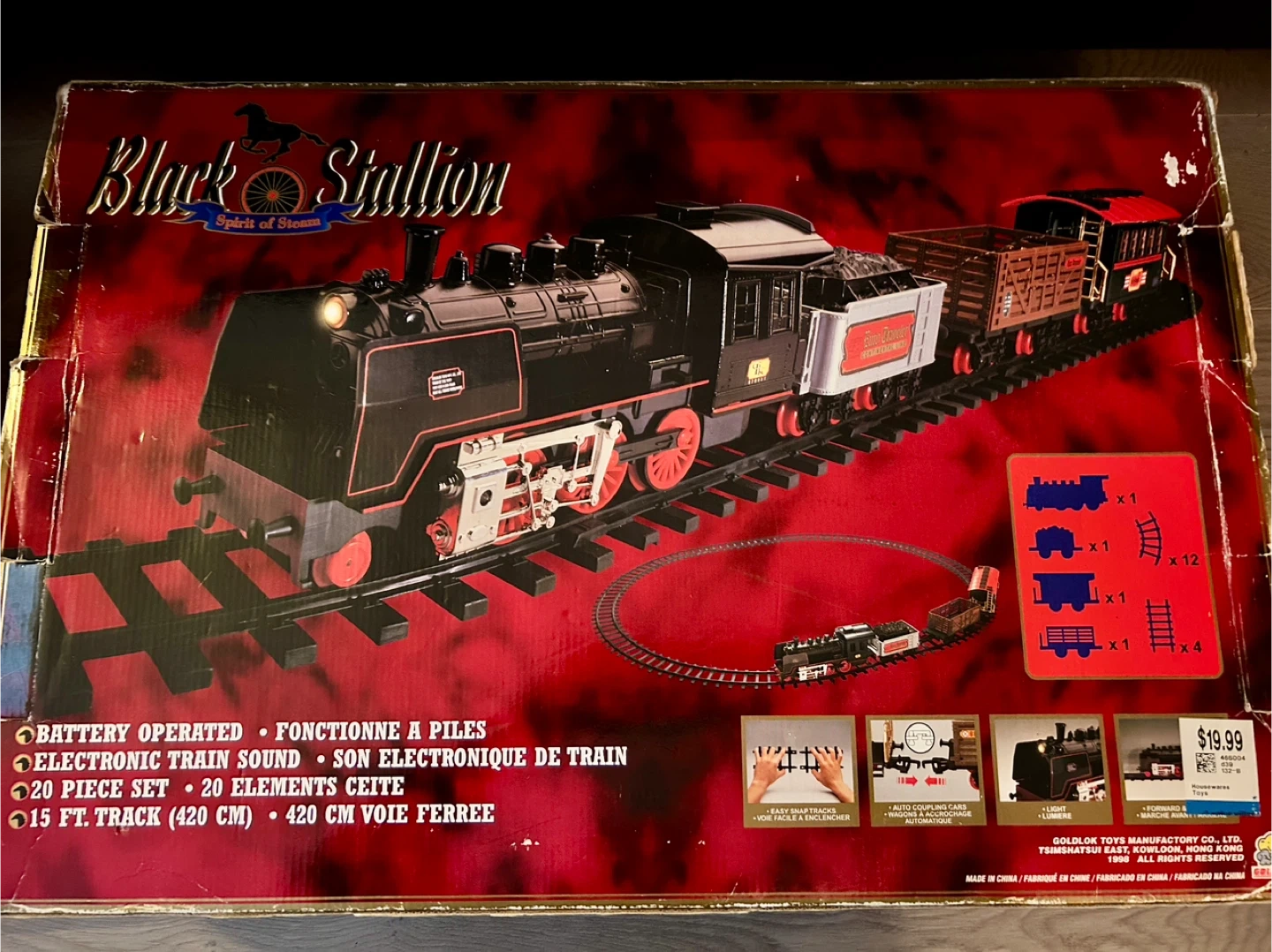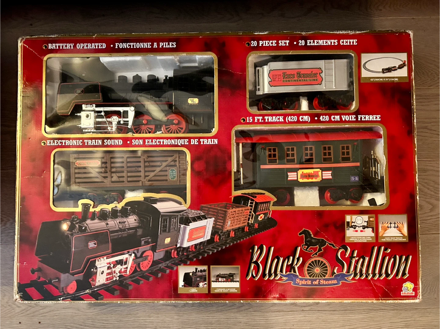 Selling a Black Stallion Spirit of Steam train set. It's a 20-piece set that includes 15 ft of track. It's battery operated and has an electronic train sound. Comes in the original box!
