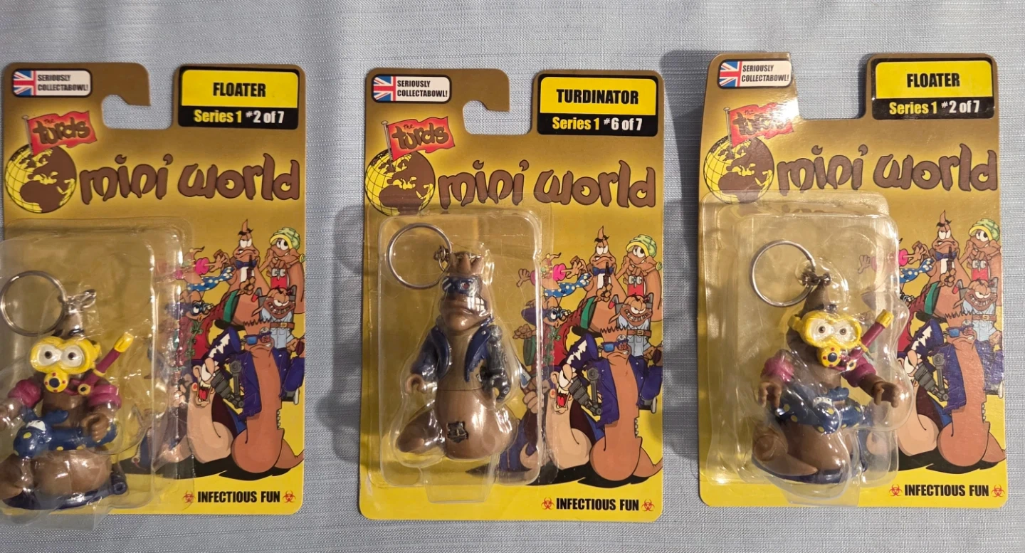 Lot 2# 3 of The Turds Mini World keychains from Series 1! There's Floater (2 of 7) and Turdinator (6 of 7). They're all still sealed in their original packaging, ready to add some quirky fun to your keys or collection