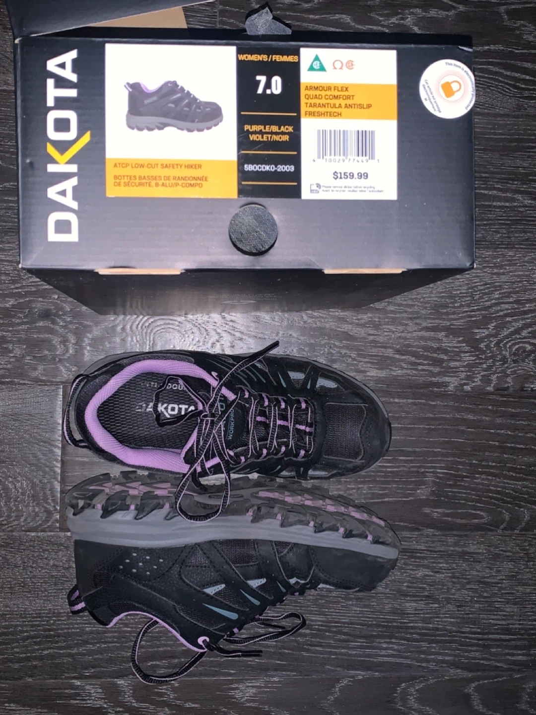 Selling a pair of Dakota Safety Shoes in size 7. They're in great condition and come with the original box. The shoes are purple and black, and feature Armour Flex technology for added comfort and an anti-slip sole. Originally bought for $159.99!