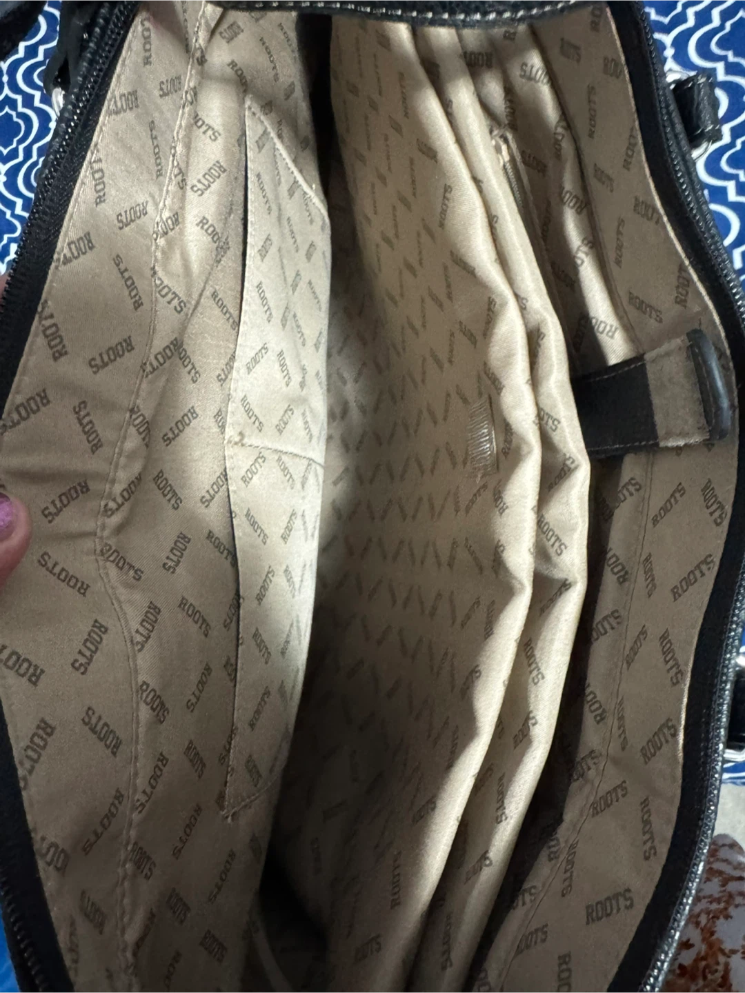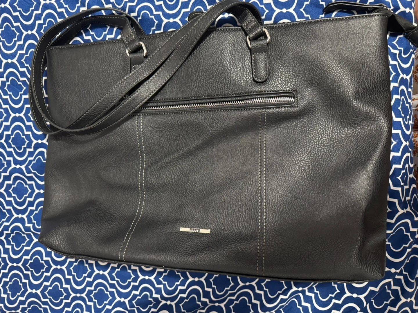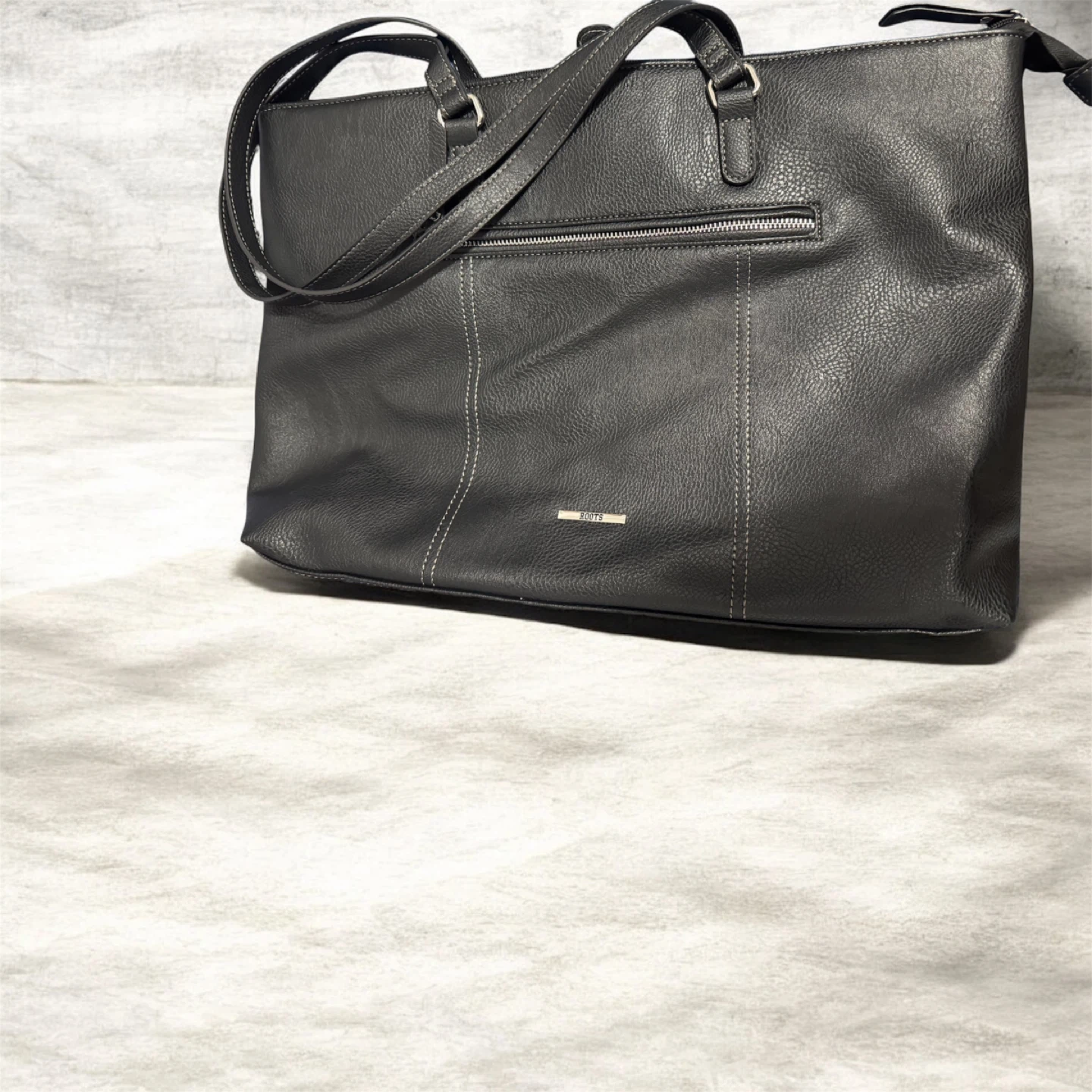 A stylish Roots office bag in black faux leather! This bag is in great condition and ready for a new owner. Perfect for carrying your essentials with a touch of Canadian flair. Can fit 17 inch laptop