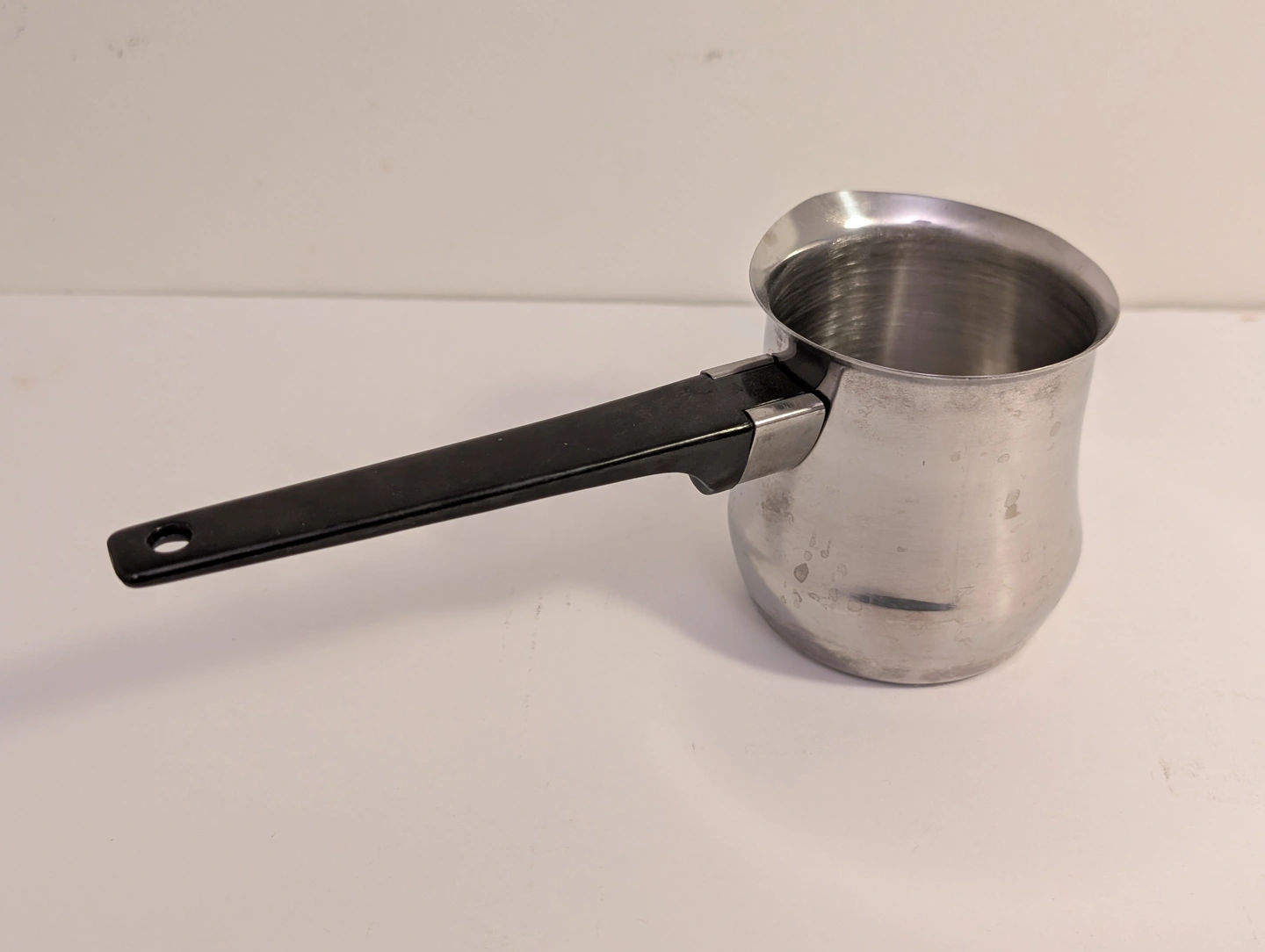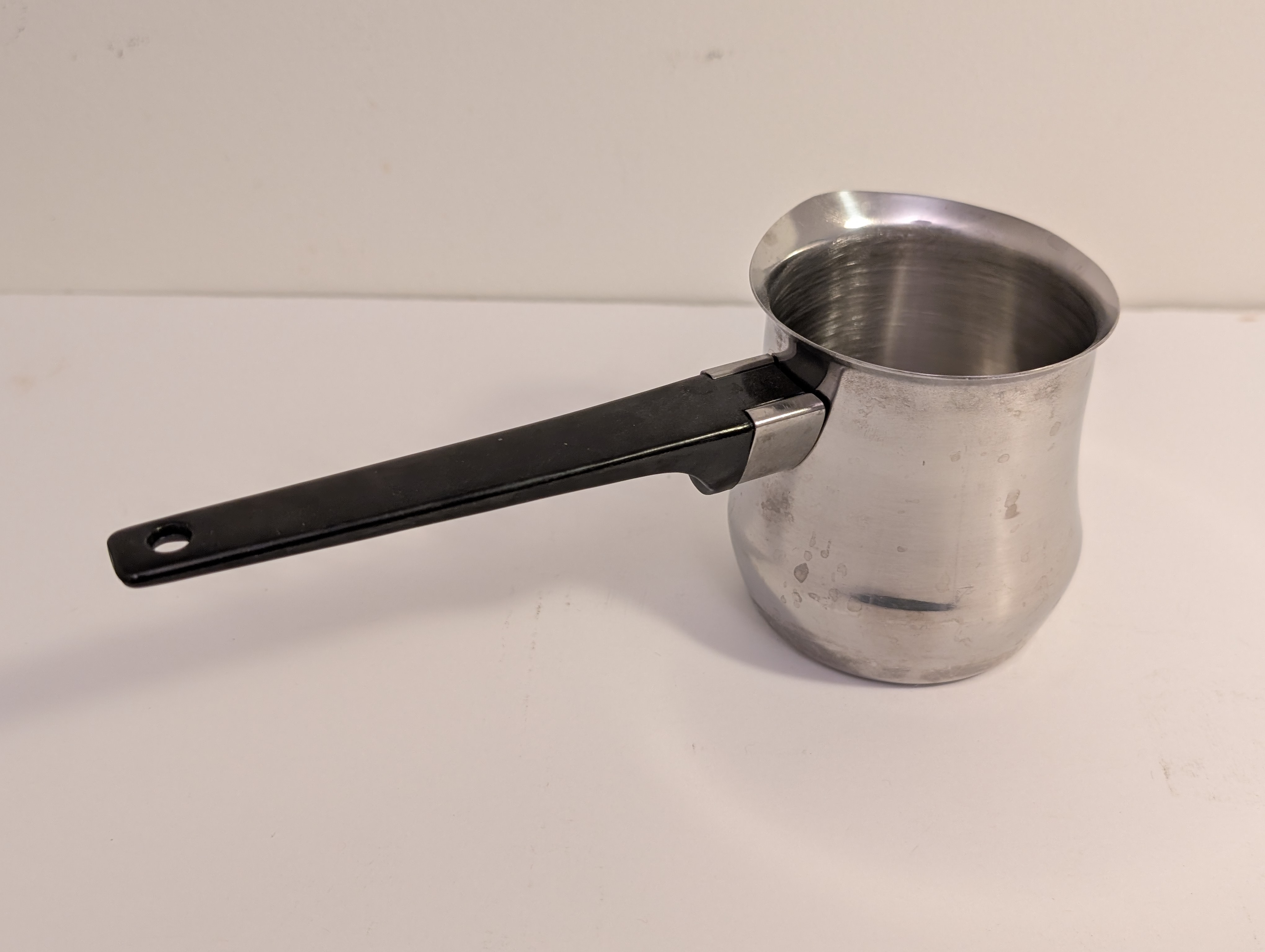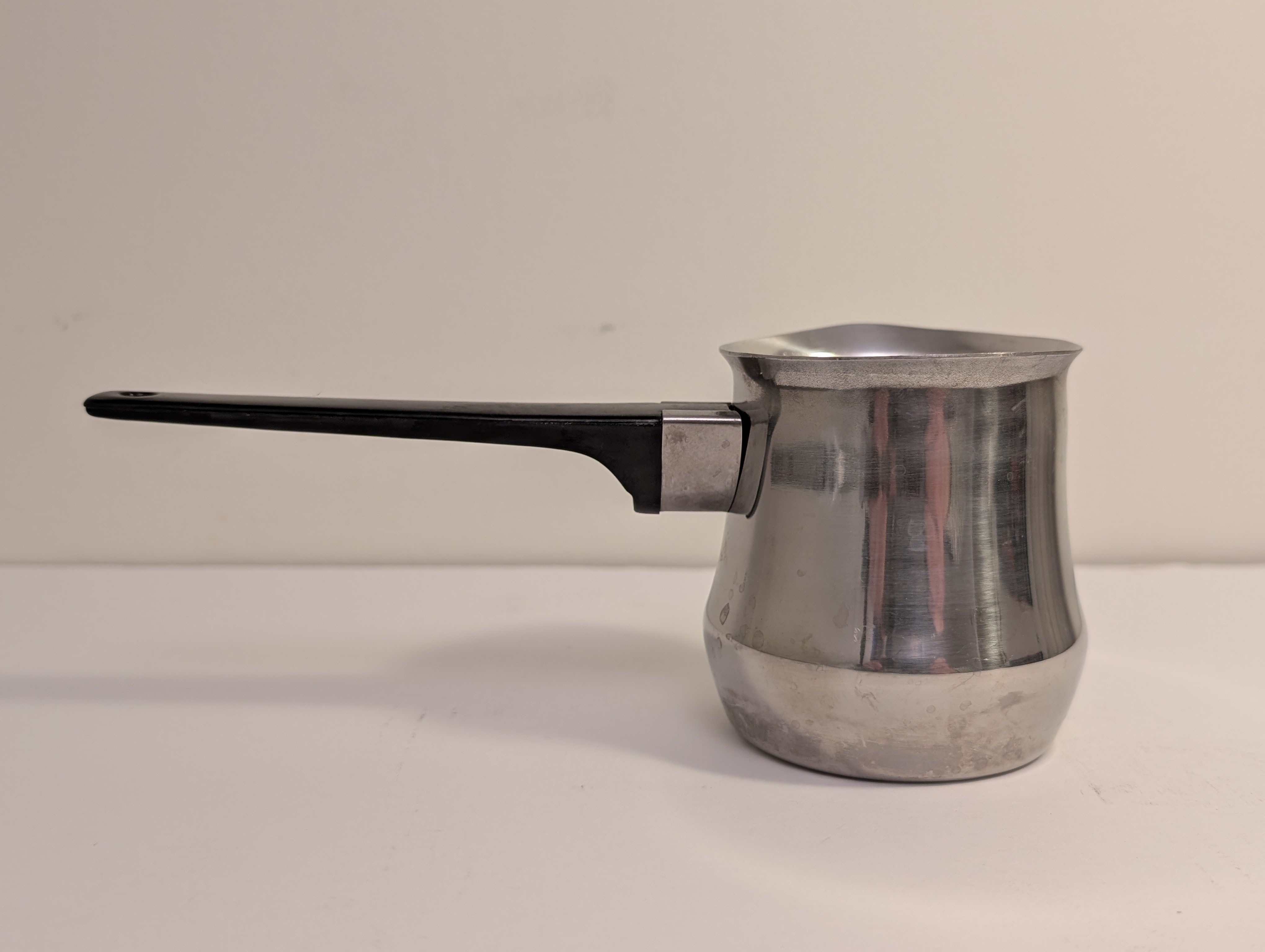 Selling a stainless steel Turkish coffee pot. It's in good condition and ready for a new home. Perfect for making authentic Turkish coffee or heating small amounts of liquid. The handle is black and heat-resistant.