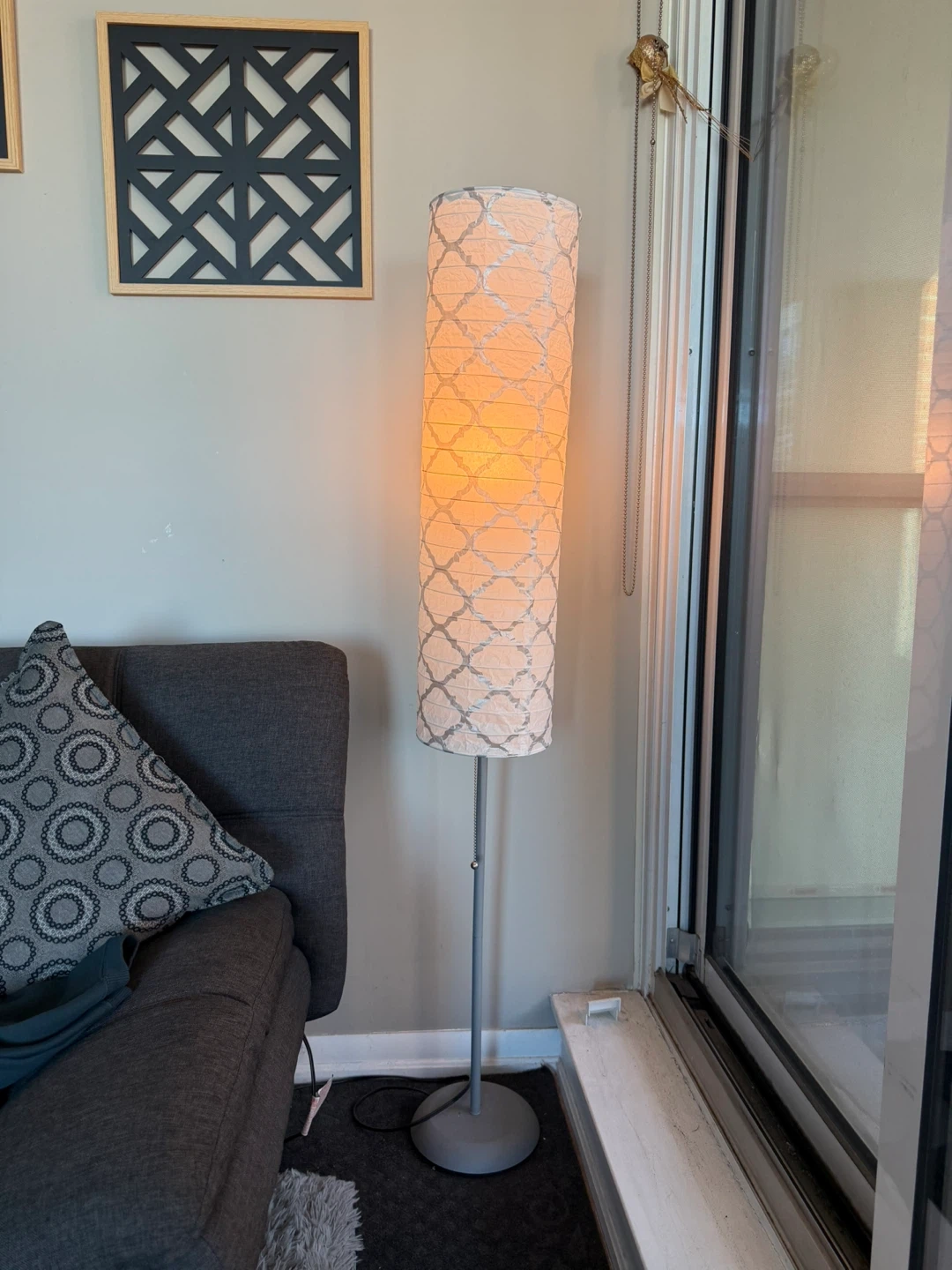 Here are 2 floor lamps with a white patterned shade! It has a simple, modern design that would look great in any room. The lamps are in good condition and provide a nice ambient light!