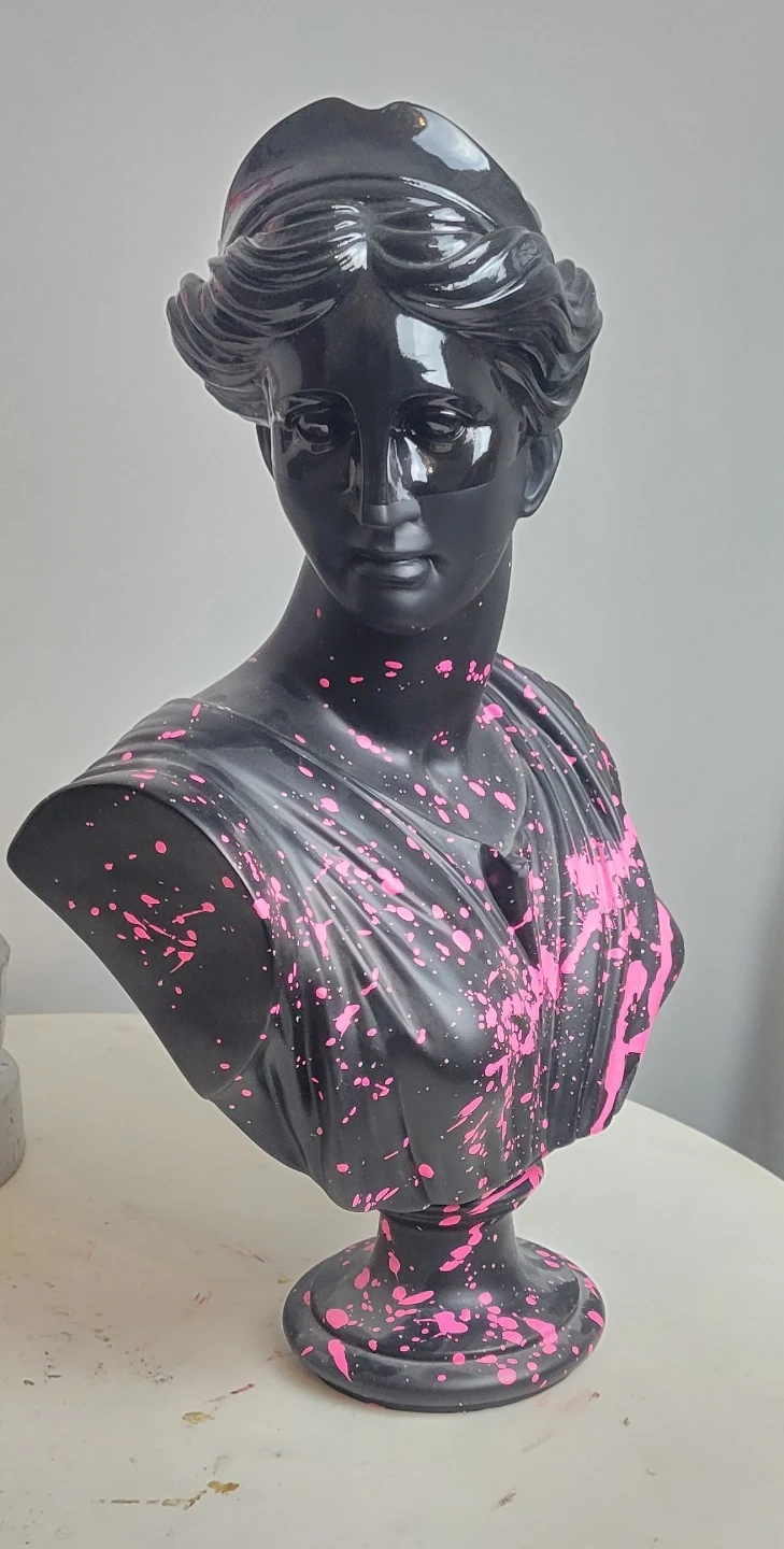 Selling a unique black bust statue with a cool pink splatter design! It's a real statement piece for any room and adds a pop of colour and personality