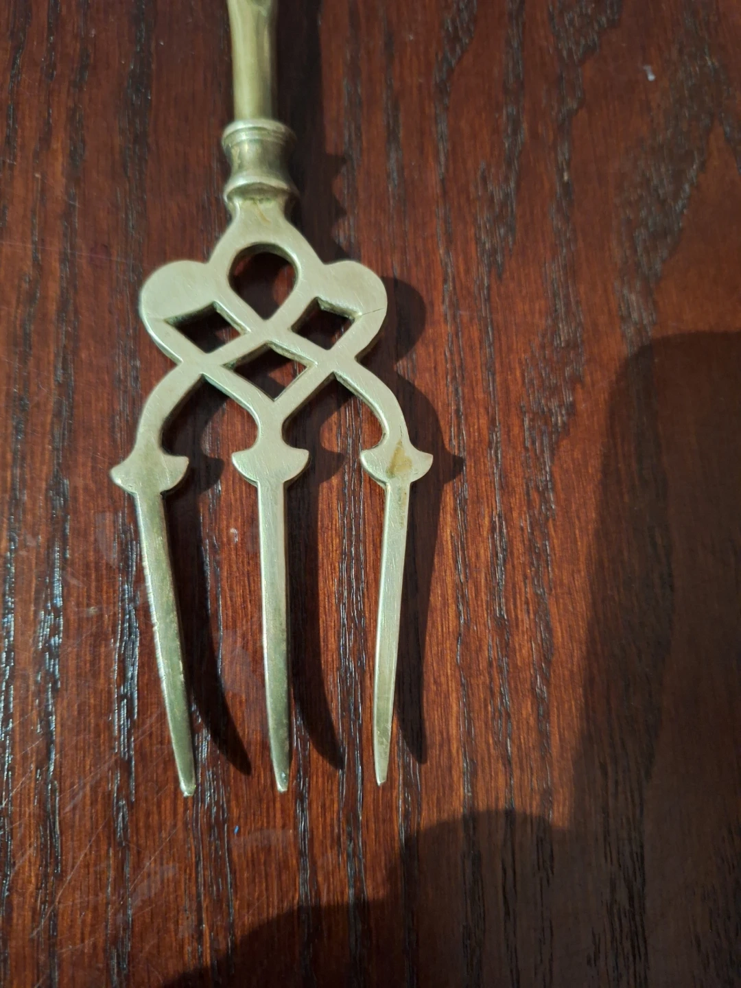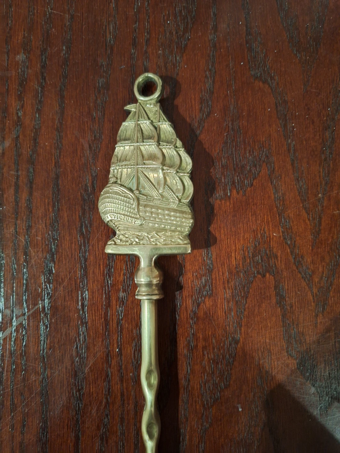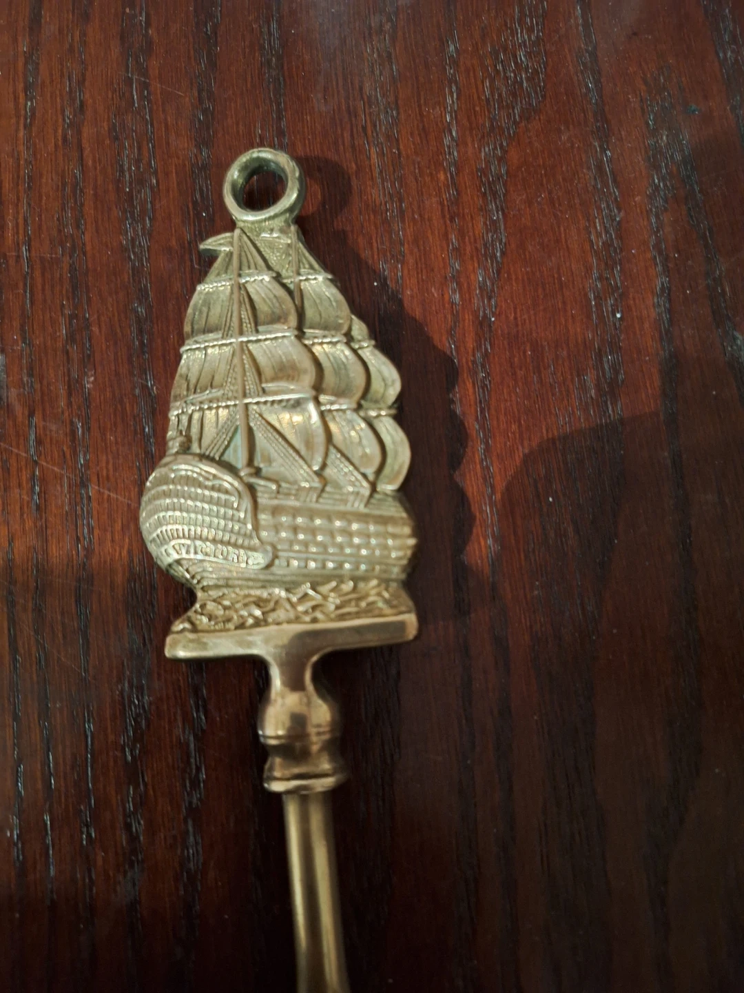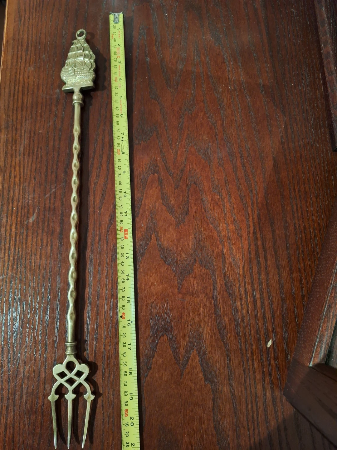 Selling a vintage brass toasting fork! It has a unique ship design at the end and a decorative handle. It is approximately 20 inches in length. It's in good condition for its age, perfect for adding a touch of vintage charm to your kitchen or collection
