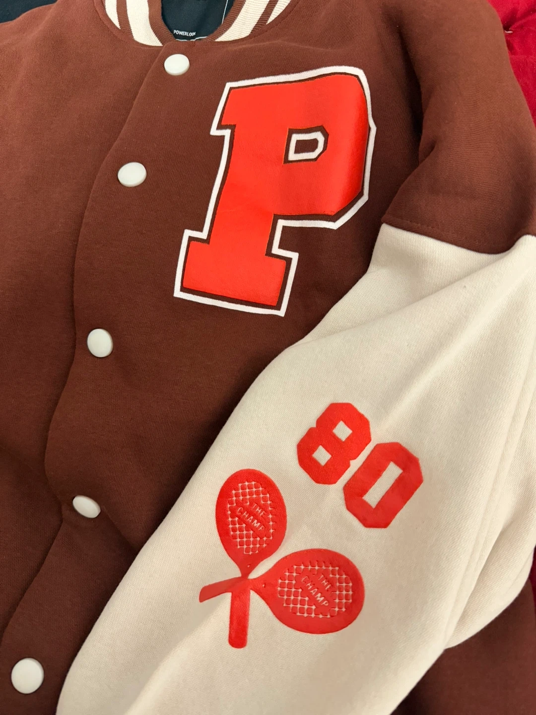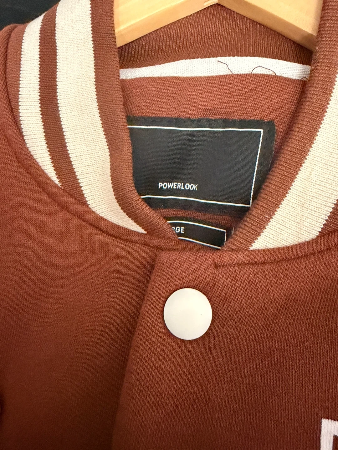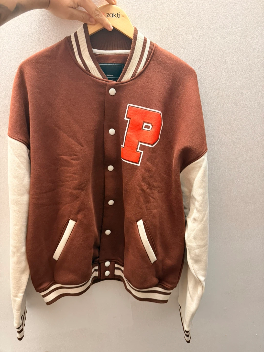Selling a Powerlook letterman Varsity jacket in size large/XL! The jacket is a stylish brown colour with white sleeves and striped detailing. It has a large 'P' on the front. A great piece to add to your wardrobe!