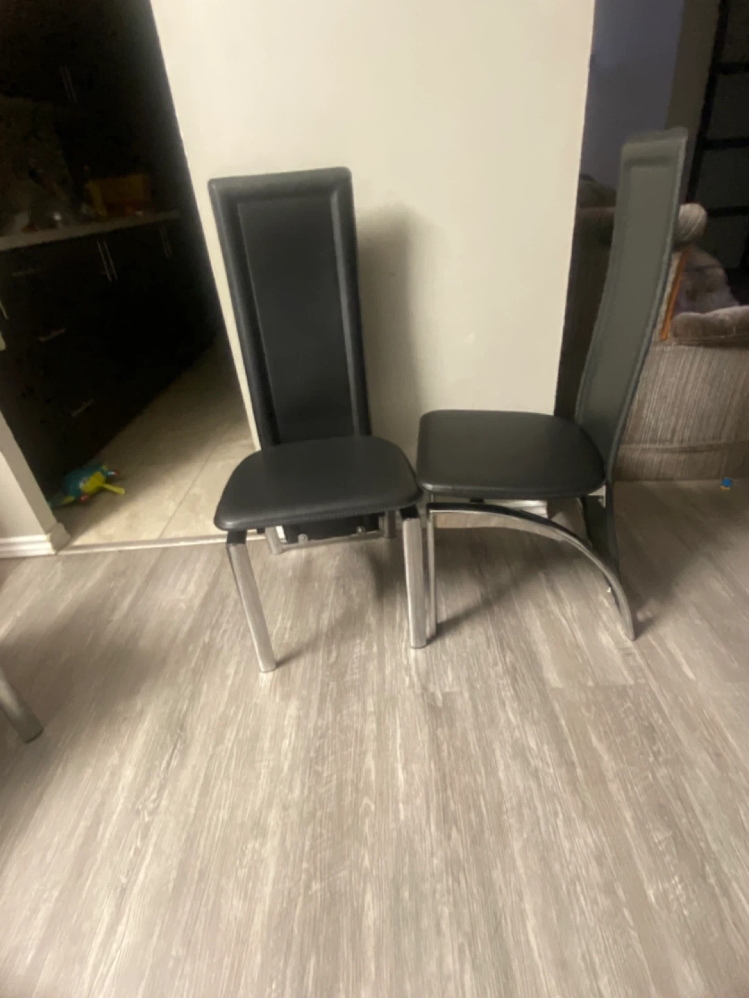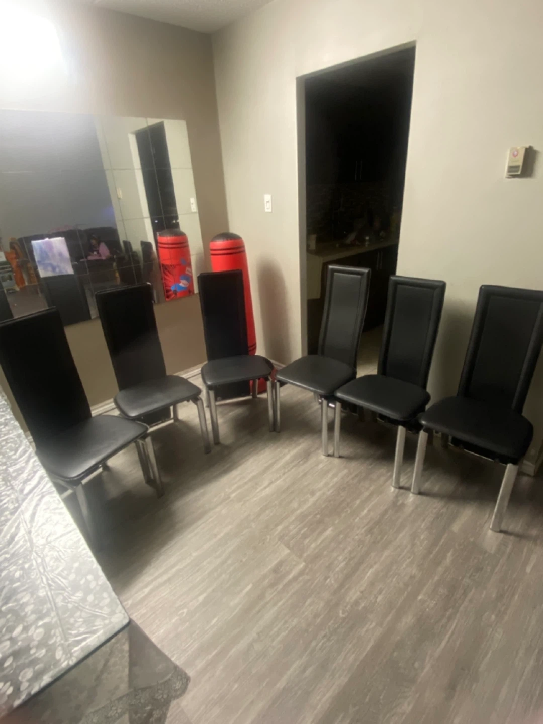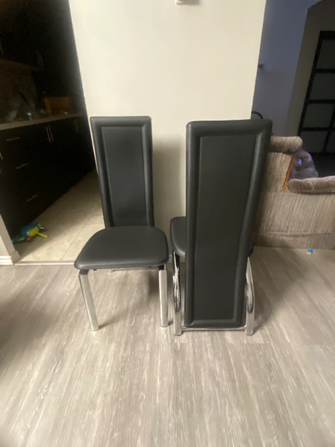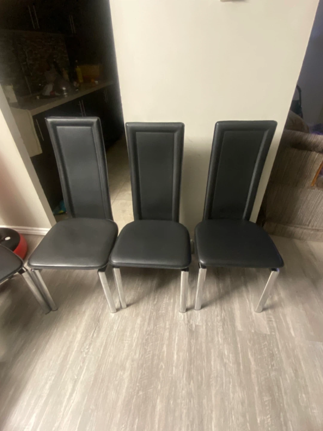 Selling a set of 6 dining chairs. They are black with silver legs. They are in great condition and would look great in any dining room!