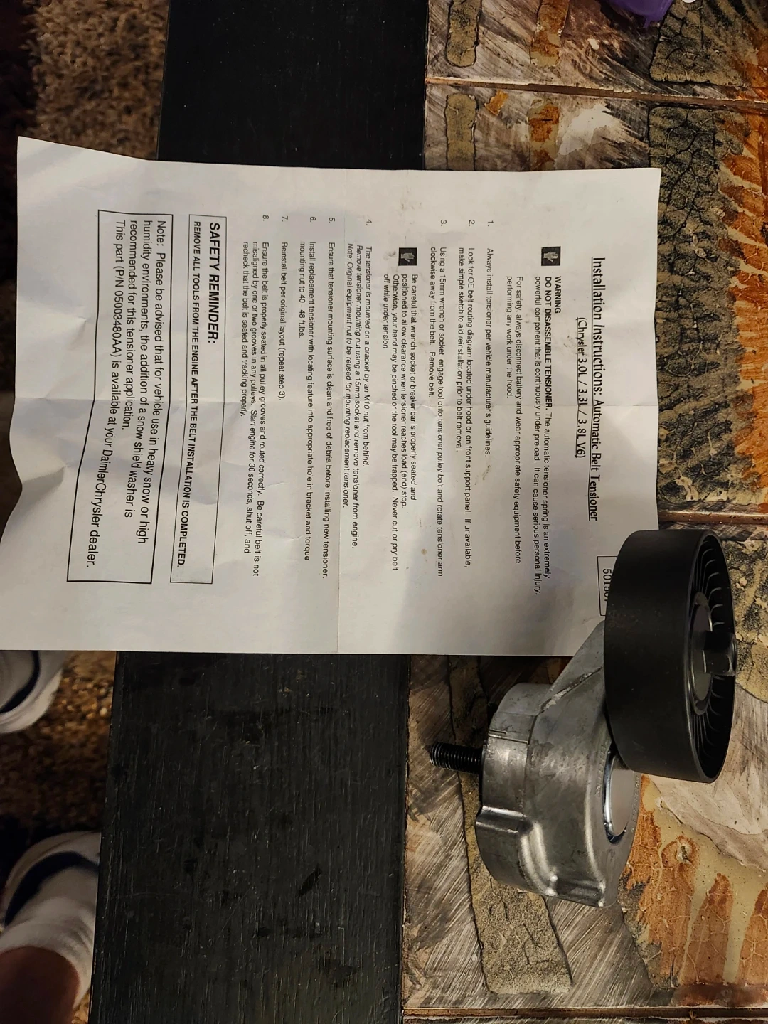 Selling an automatic belt tensioner compatible with Chrysler 3.0L, 3.3L, and 3.8L V6 engines. The tensioner is an extremely component that is continuously under pre-load. Please review the provided installation instructions before use.