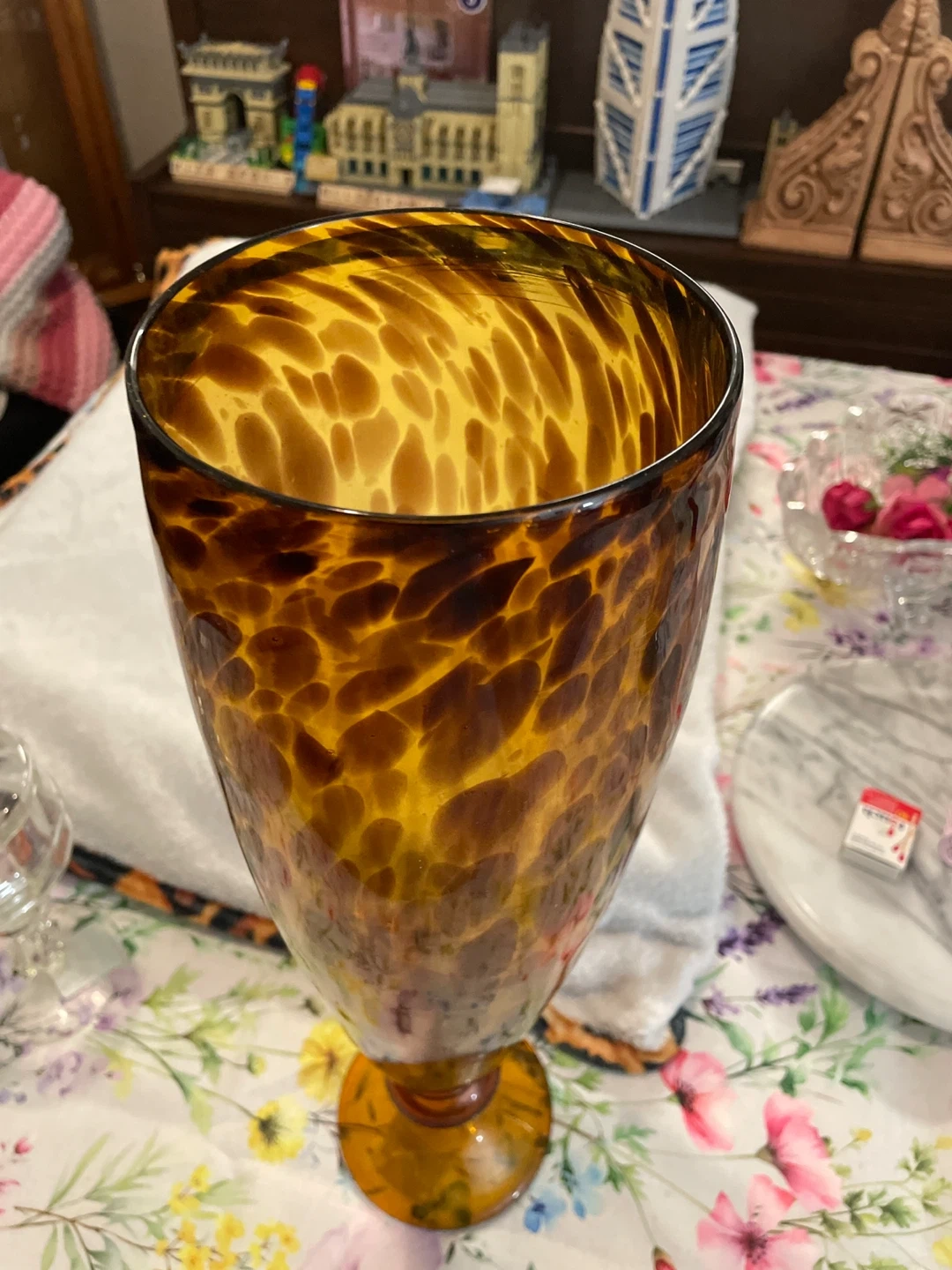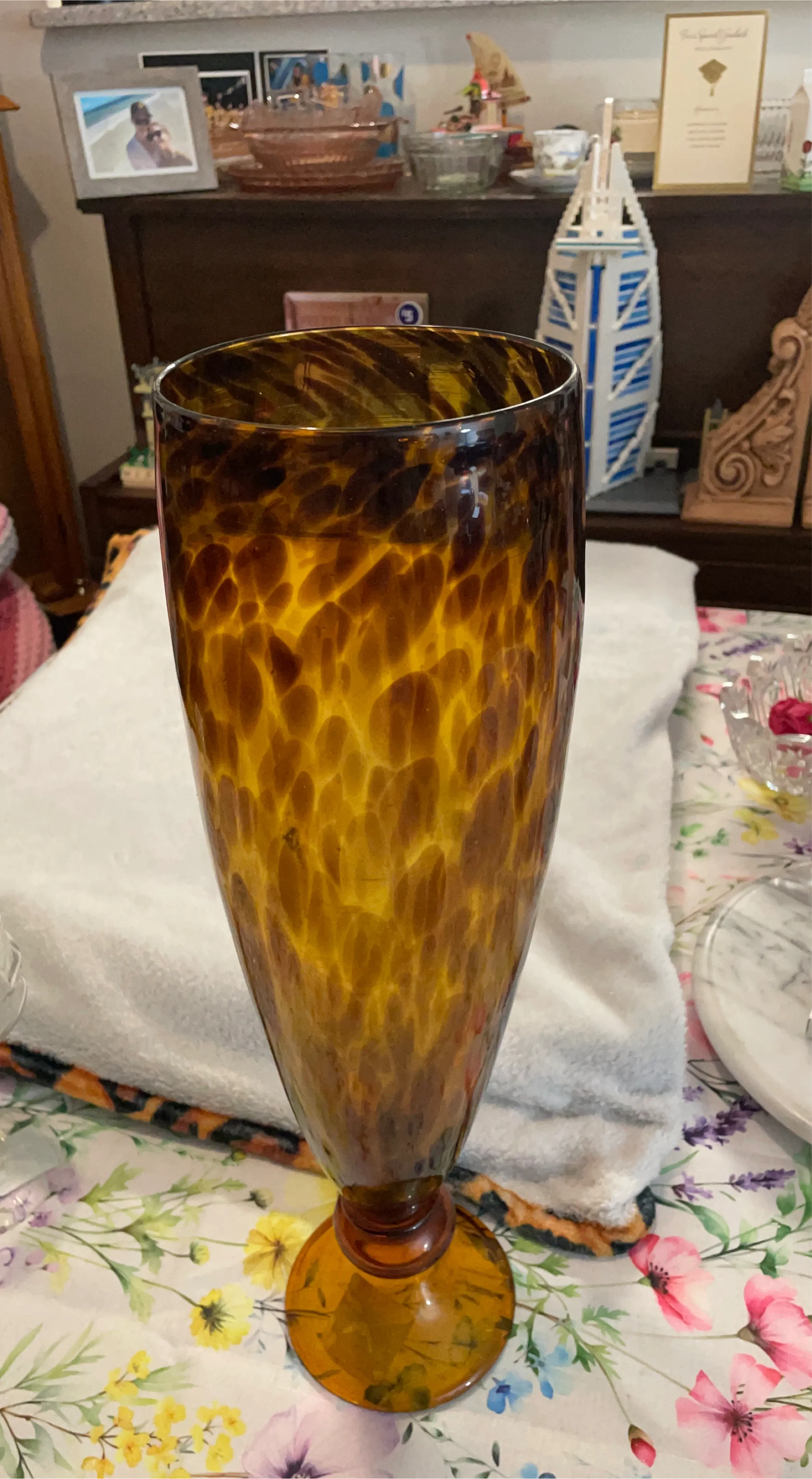 Beautiful vintage art glass vase in amber and brown tones. It has a unique patterned design and would make a lovely addition to any home decor