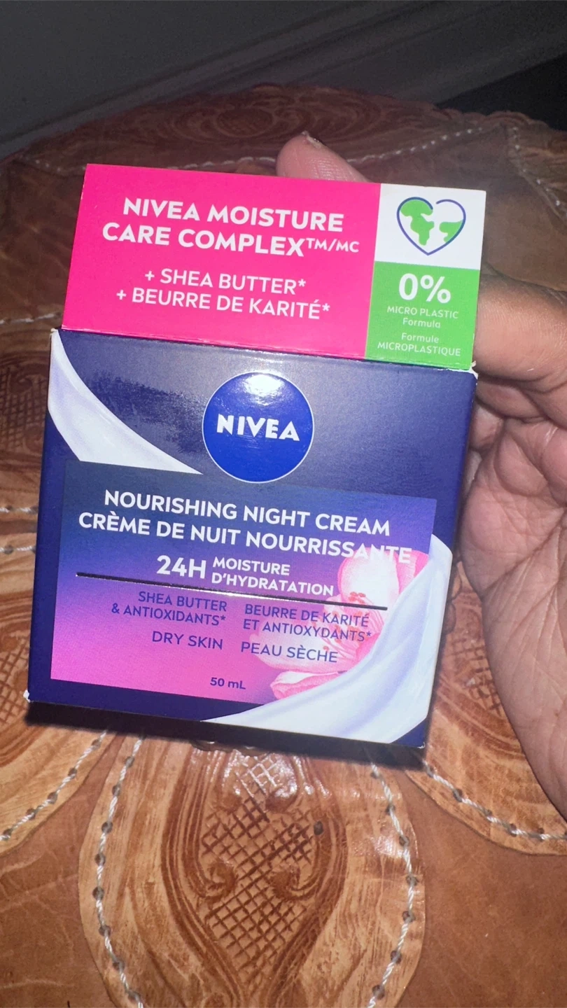 Selling a Nivea Nourishing Night Cream for dry skin. It contains shea butter and antioxidants for 24 hours of moisture. The cream is in a 50mL container and comes in its original box