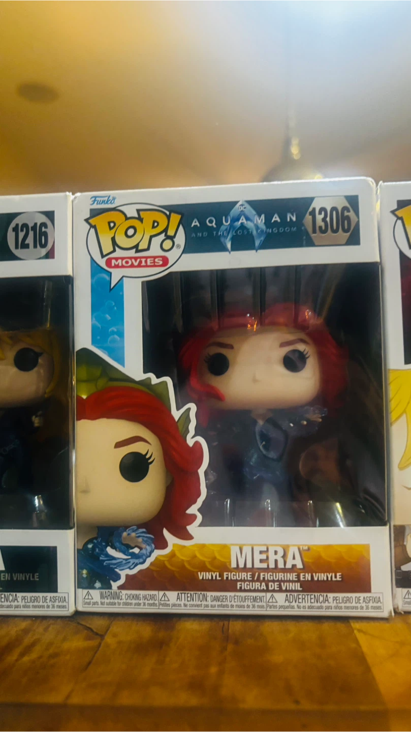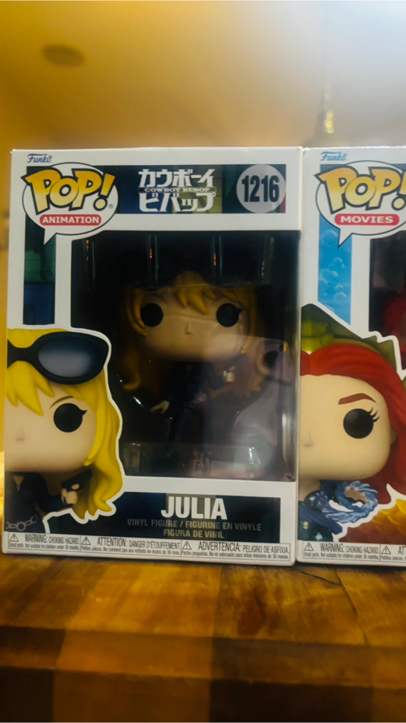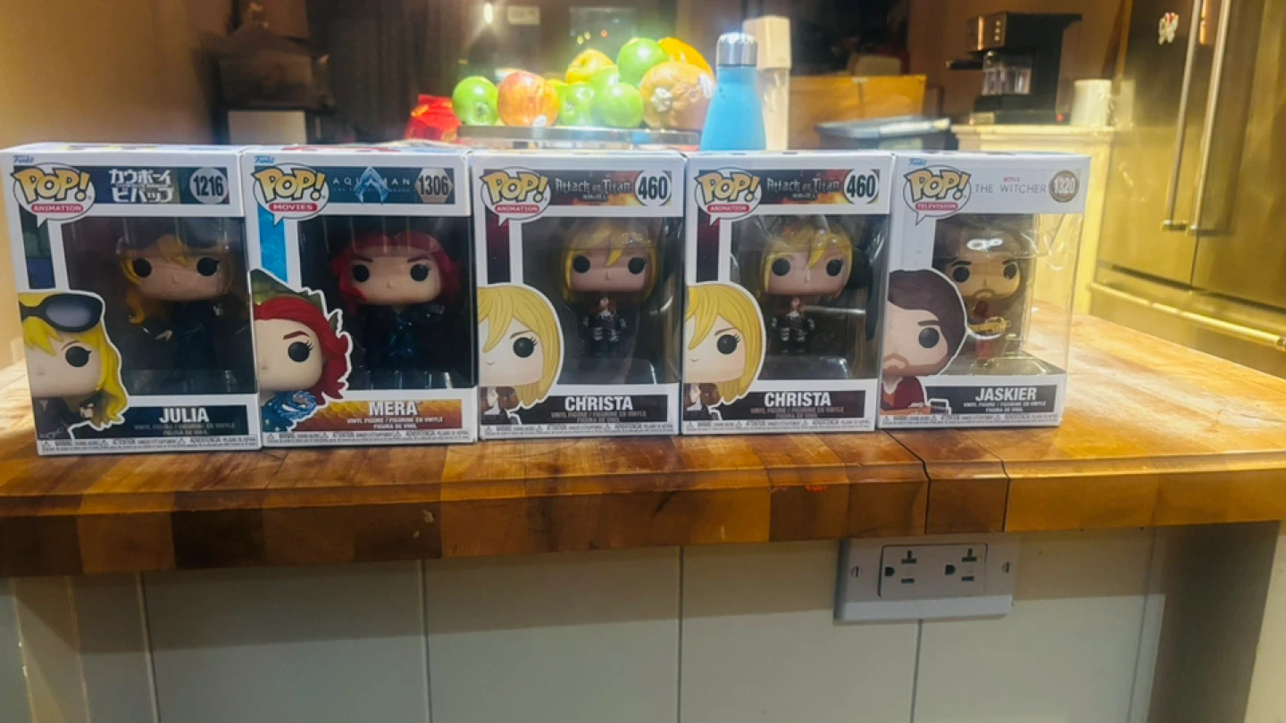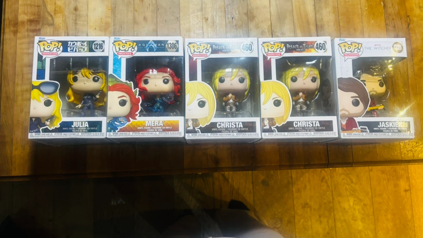 Selling a collection of Funko Pop! vinyl figures, including Julia from Cowboy Bebop (1216), Mera from Aquaman (306), Christa from Attack on Titan (460), and Jaskier from The Witcher (1320)