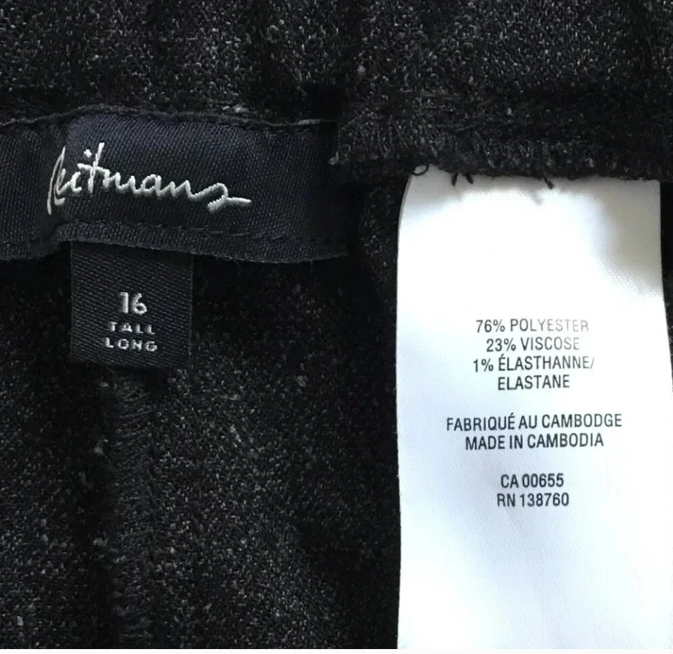 Selling a pair of Kitmans pants. They are a size 16 Tall Long. The pants are made of 76% polyester, 23% viscose, and 1% elastane.