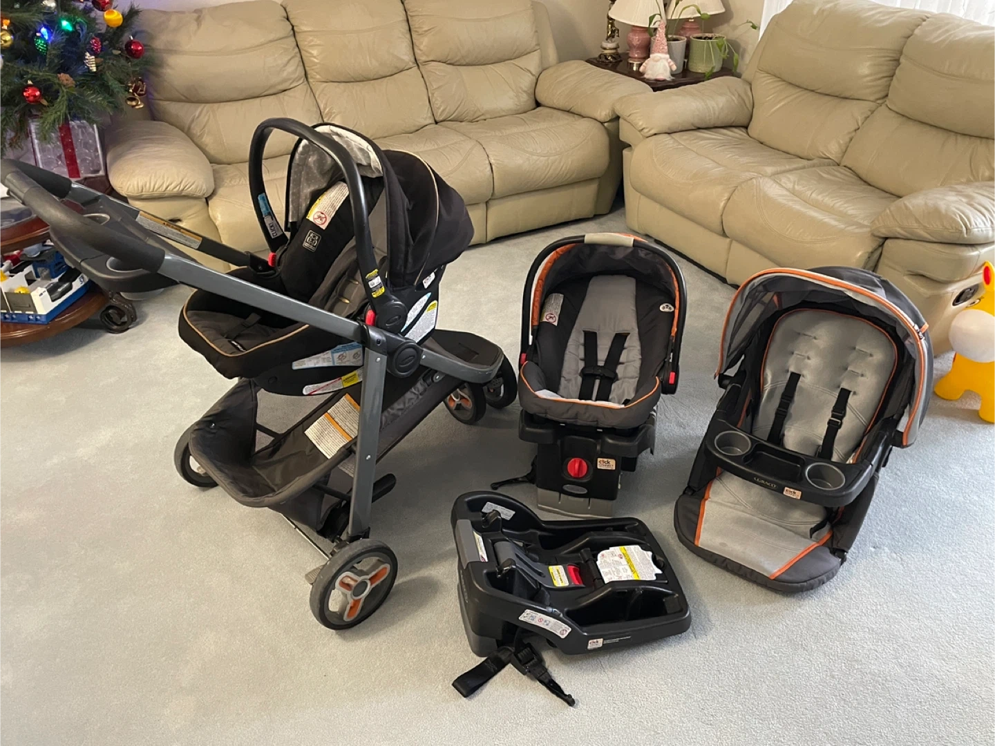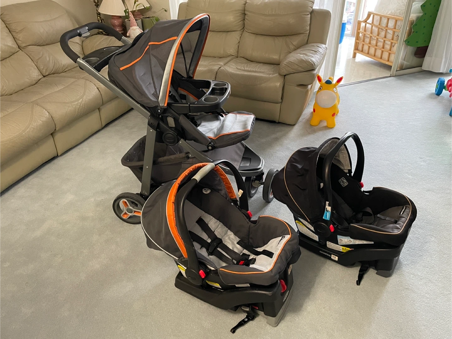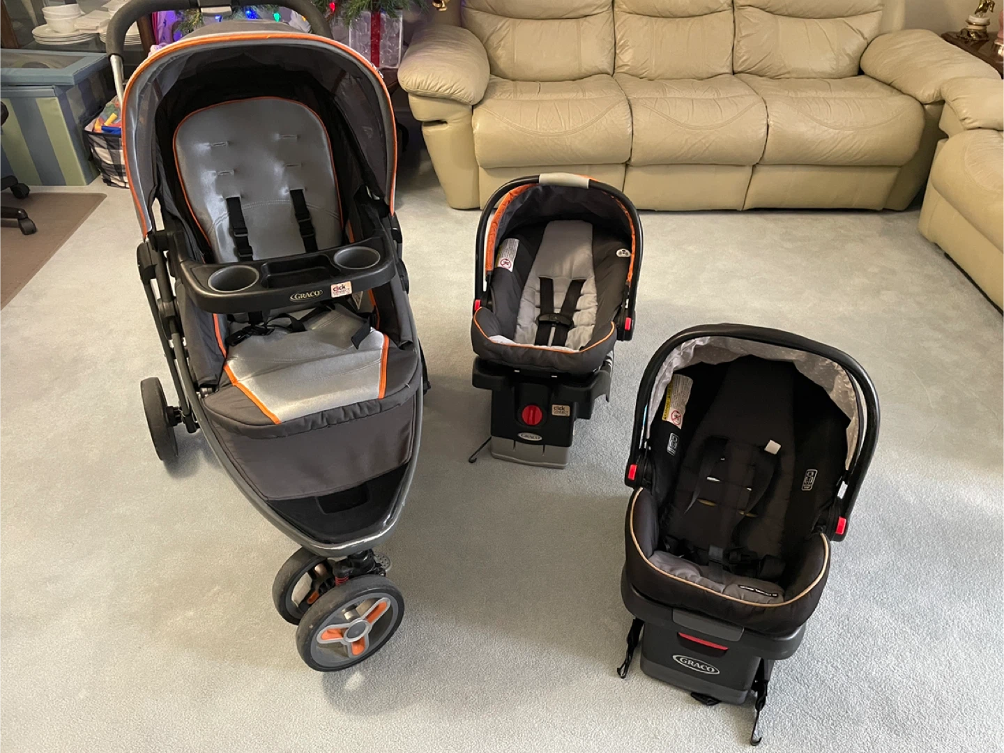 Selling a Graco stroller with Click Connect system and two Graco infant car seats.