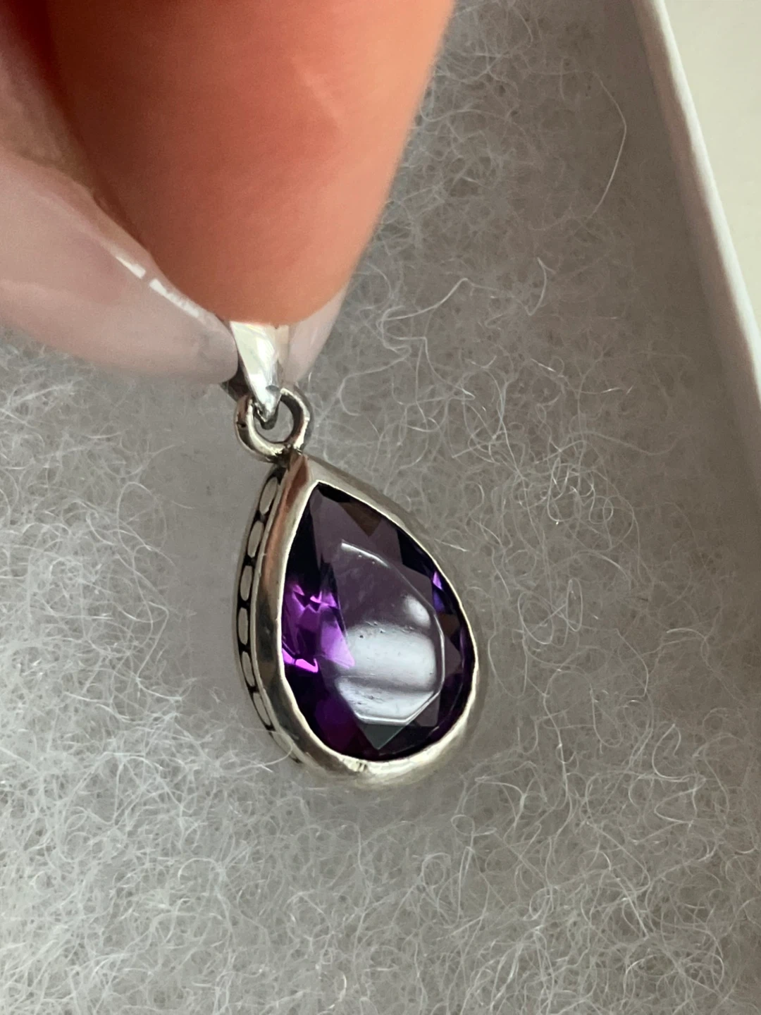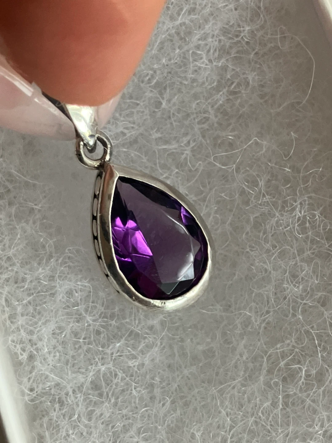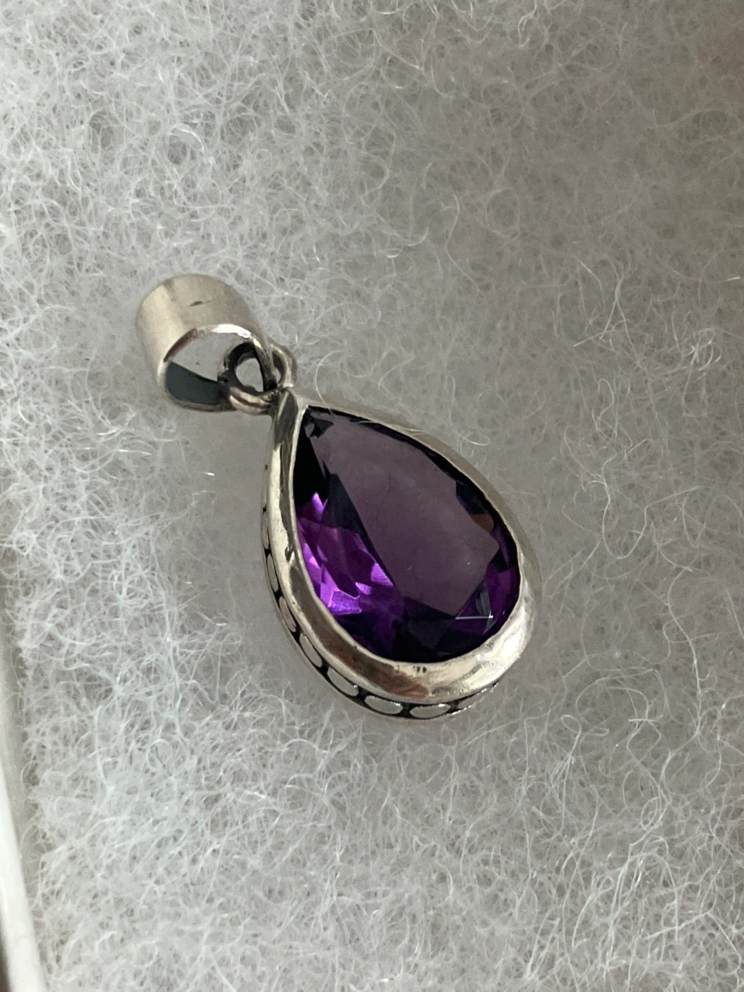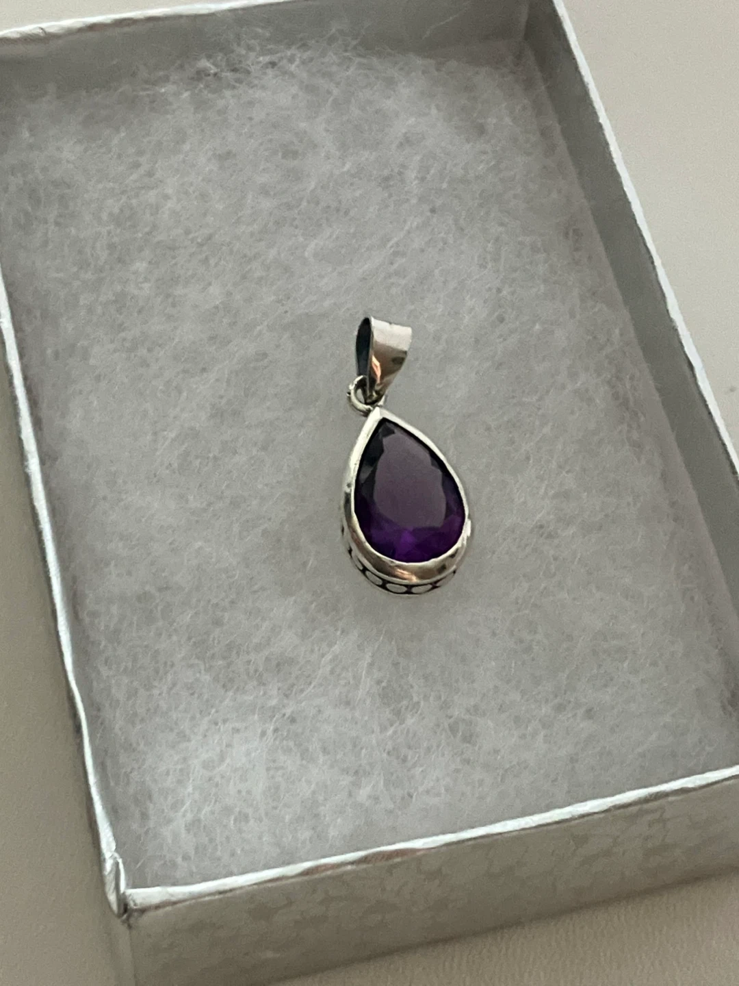 Selling a lovely amethyst pendant set in 925 silver. It's in great condition and comes with a box. The pendant is about 1 inch in length