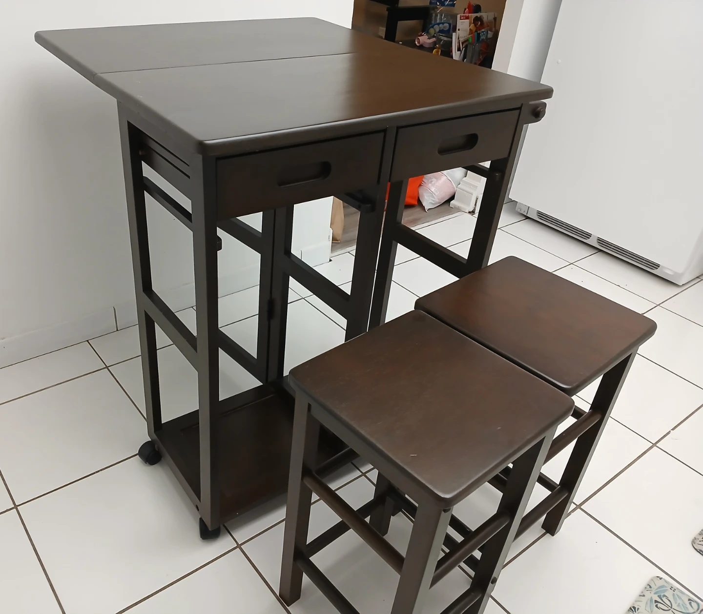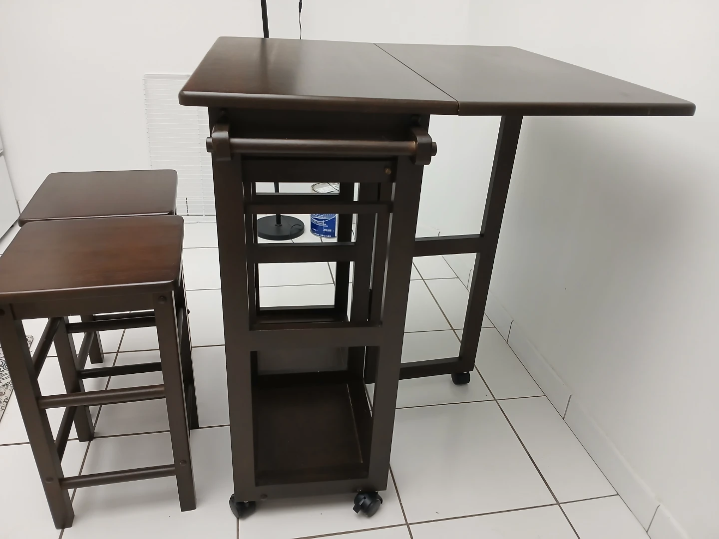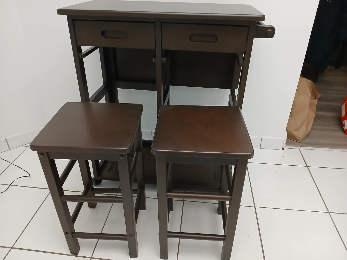 Selling this versatile piece of furniture for your home. Can be used in the kitchen as a kitchen island with two stools expandable table top for additional space. It's in good condition and a nice dark brown colour. There are some minor signs of wear, but it's still a great piece for adding extra counter space and seating to your kitchen or side bar for drinks. Wheels make moving very easy.