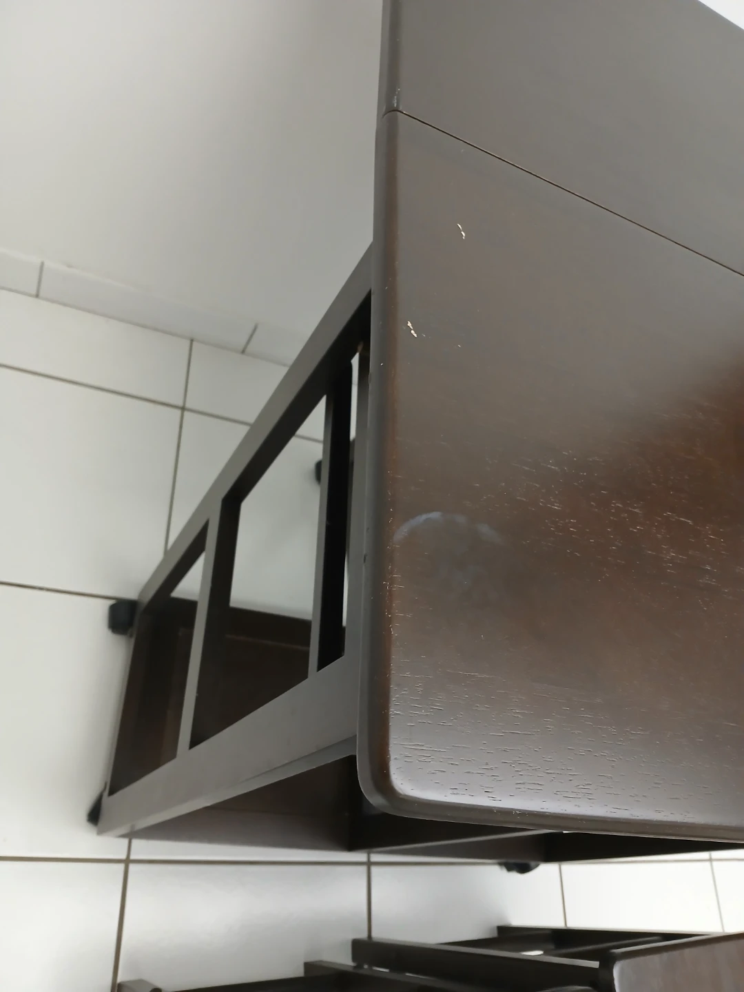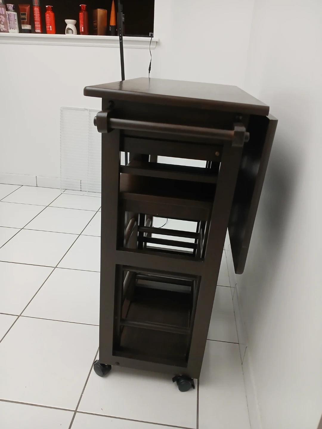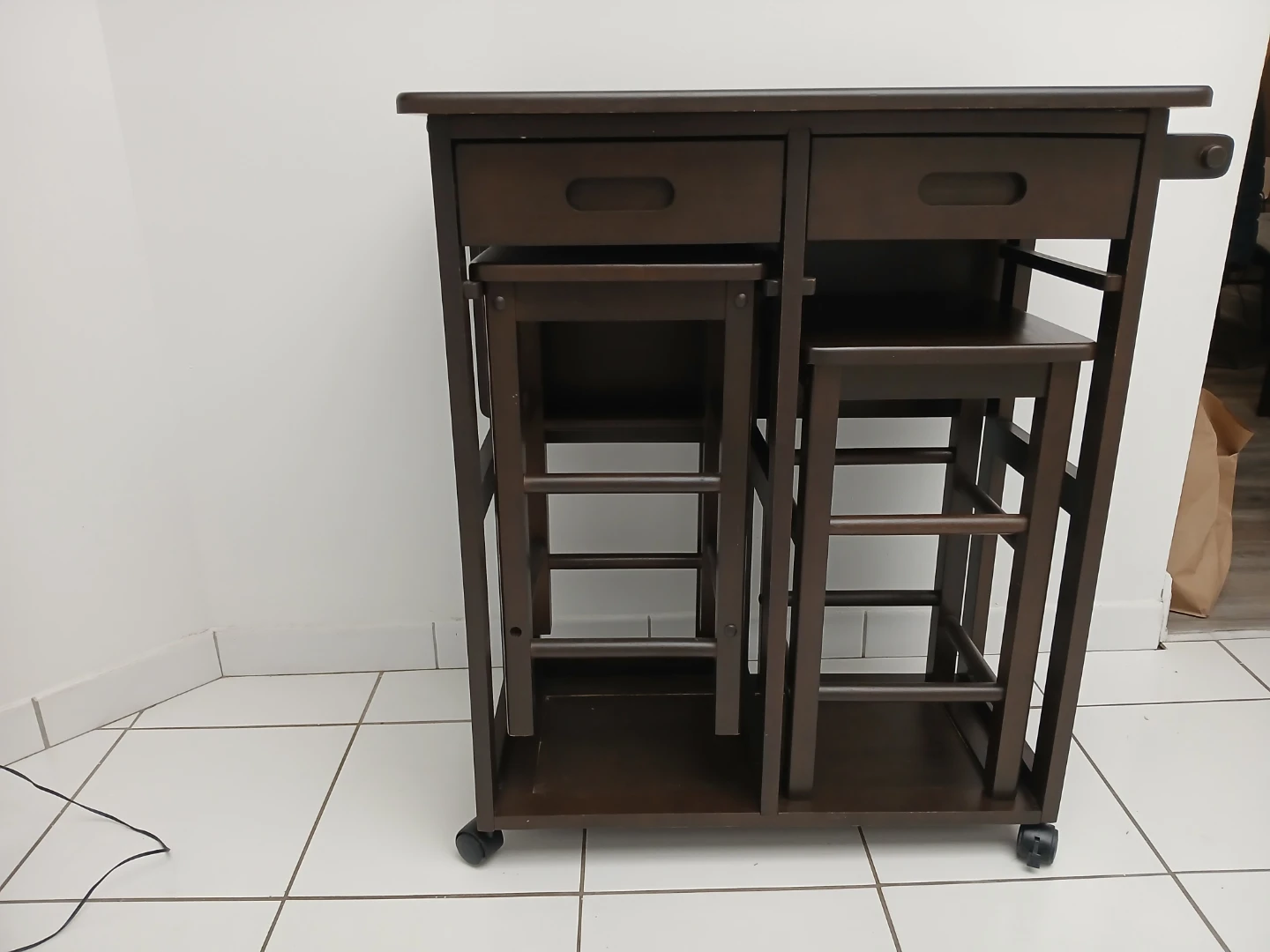 Selling this versatile piece of furniture for your home. Can be used in the kitchen as a kitchen island with two stools expandable table top for additional space. It's in good condition and a nice dark brown colour. There are some minor signs of wear, but it's still a great piece for adding extra counter space and seating to your kitchen or side bar for drinks. Wheels make moving very easy.