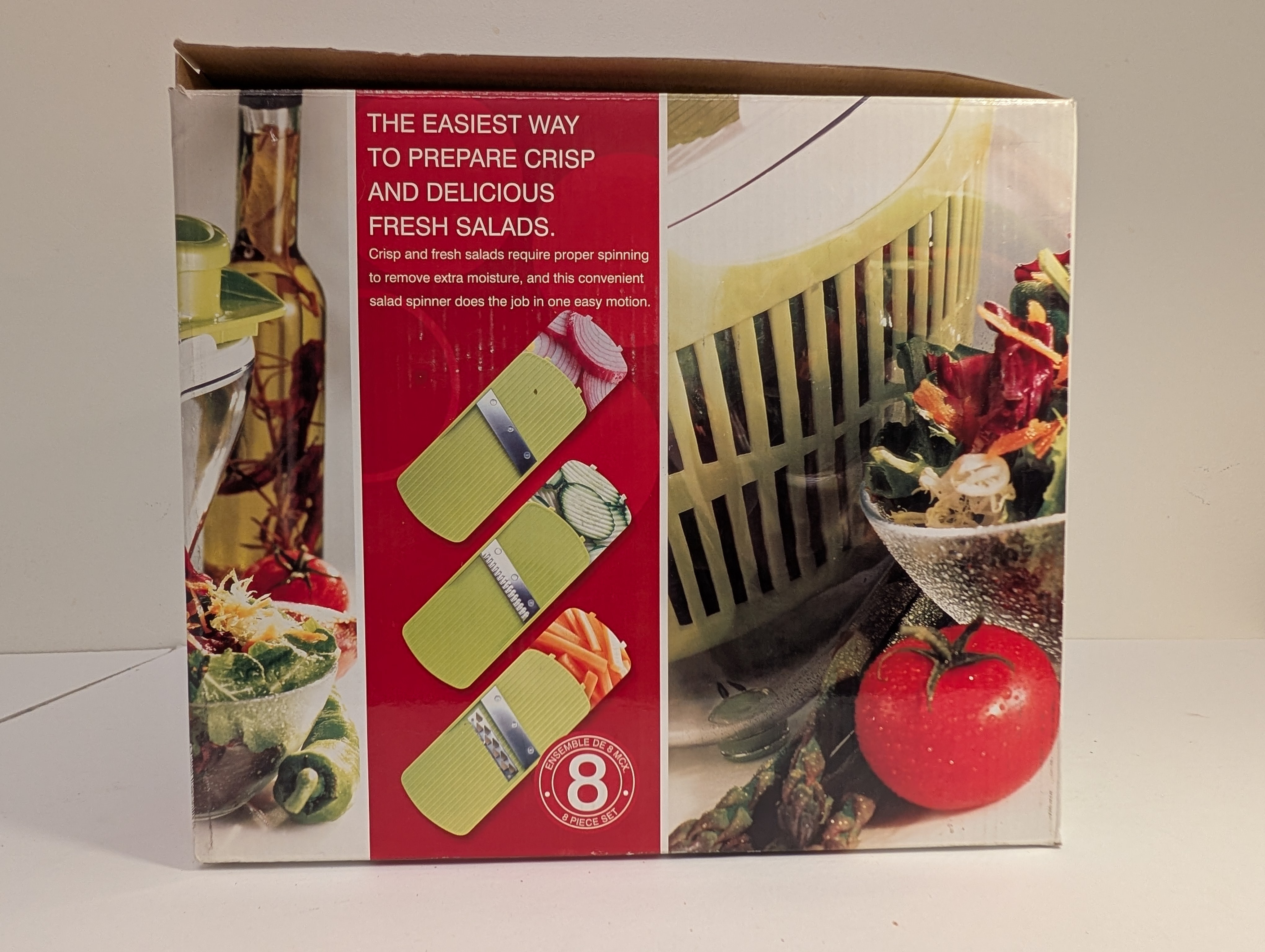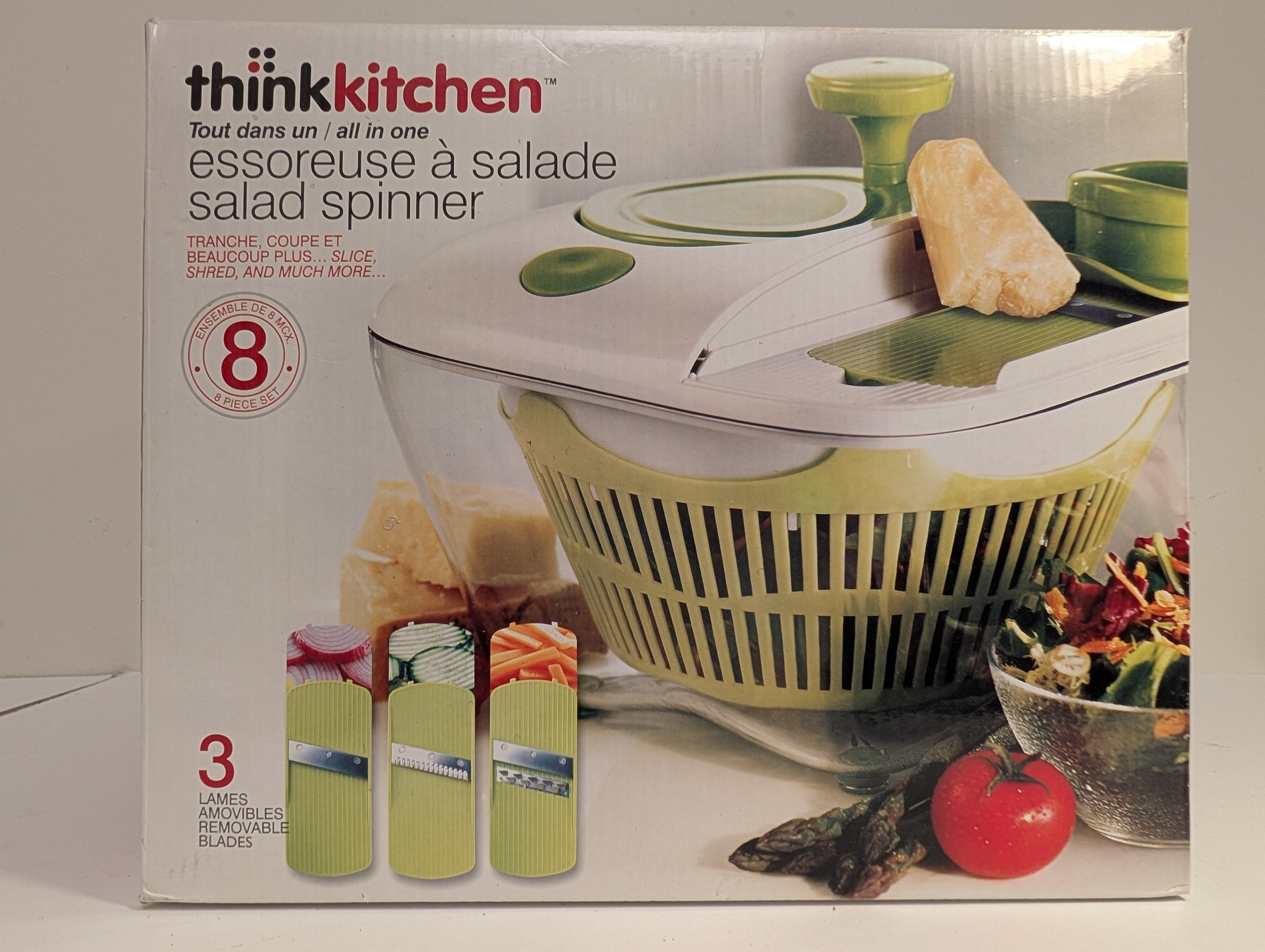 I'm selling a Thinkkitchen salad spinner, brand new in its original box! This all-in-one salad spinner makes it super easy to prepare crisp and delicious salads. It's an 8-piece set, complete with 3 removable blades for slicing, shredding, and more. Get ready to enjoy fresh and perfectly spun salads with this convenient kitchen tool!