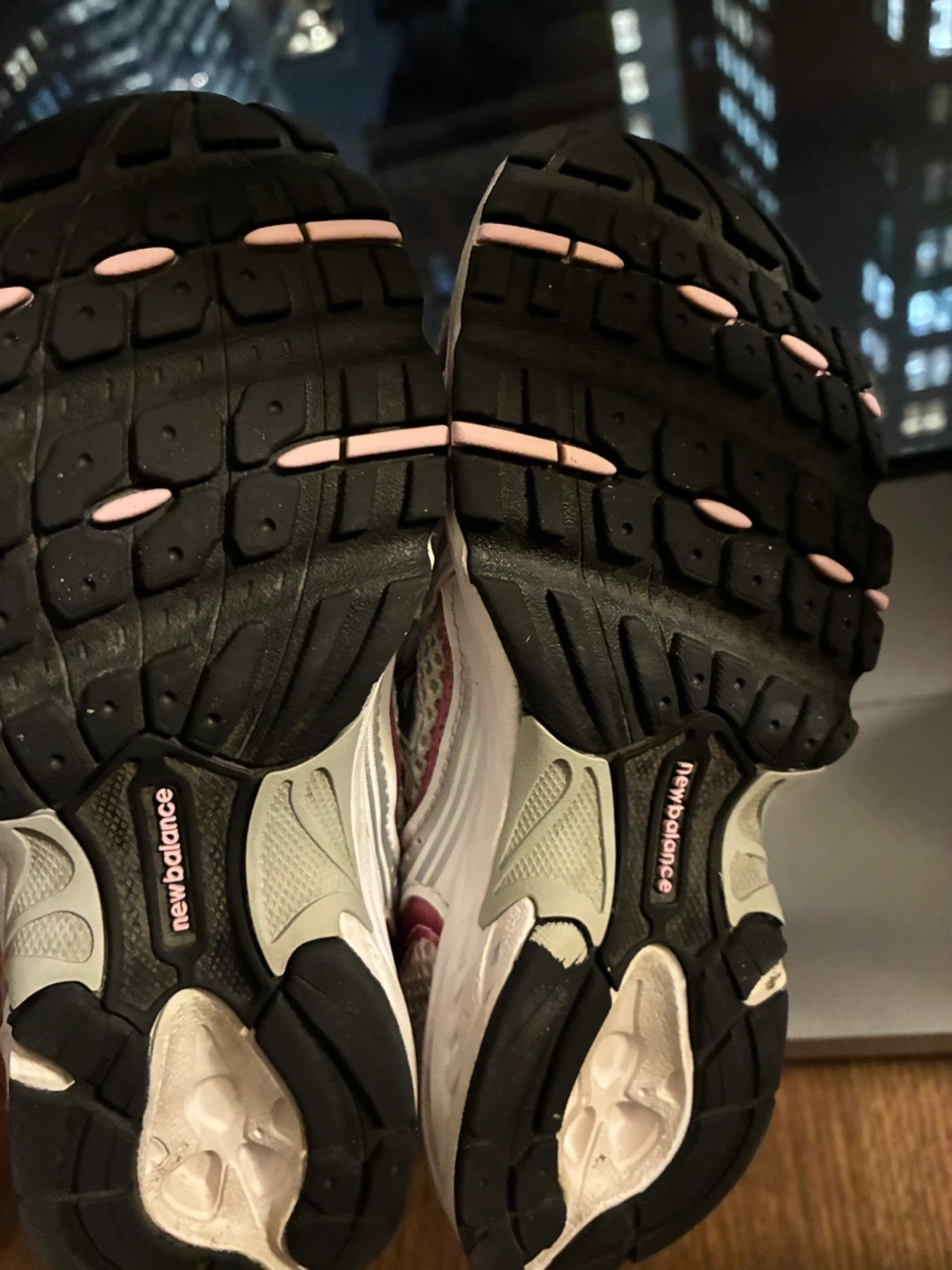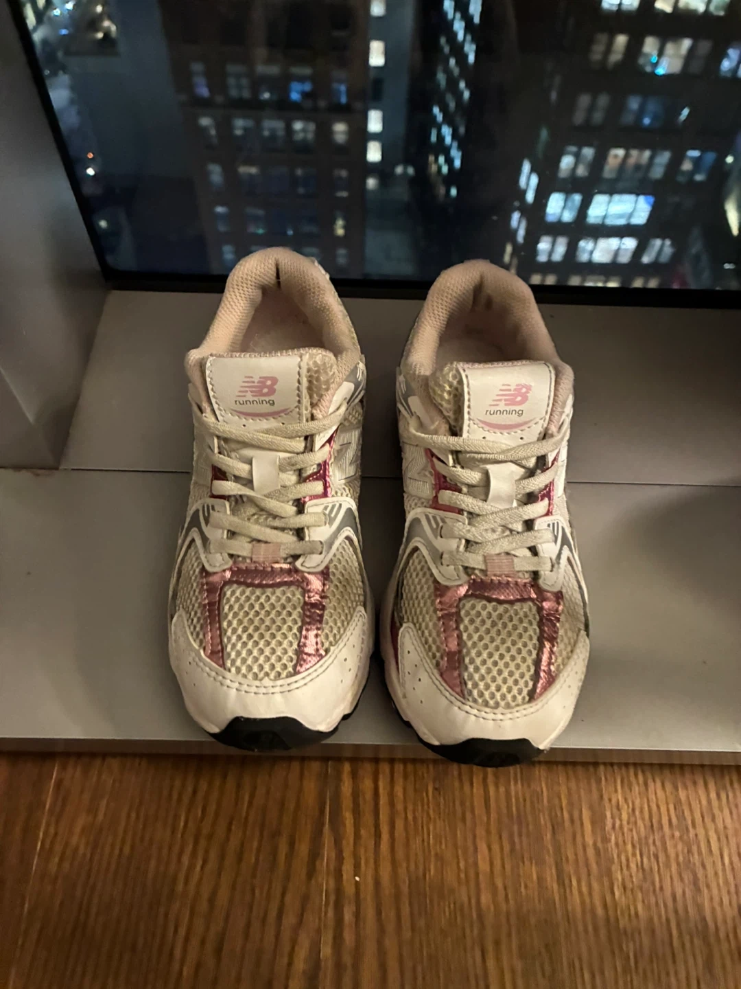 These are a pair of New Balance running shoes, perfect for your little one's active lifestyle! They feature a stylish white and pink color scheme, with the classic New Balance logo prominently displayed. Ready for a new adventure!
