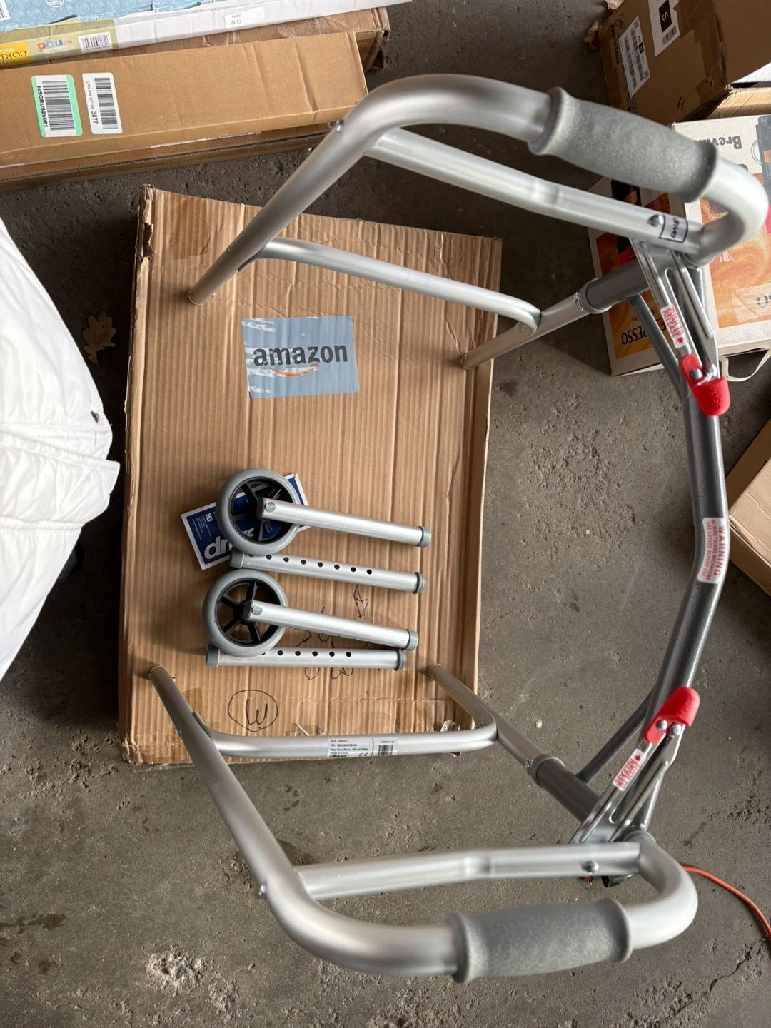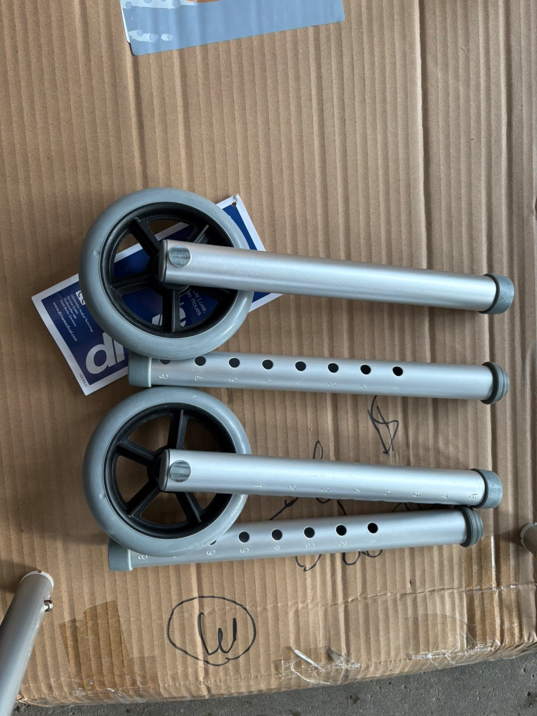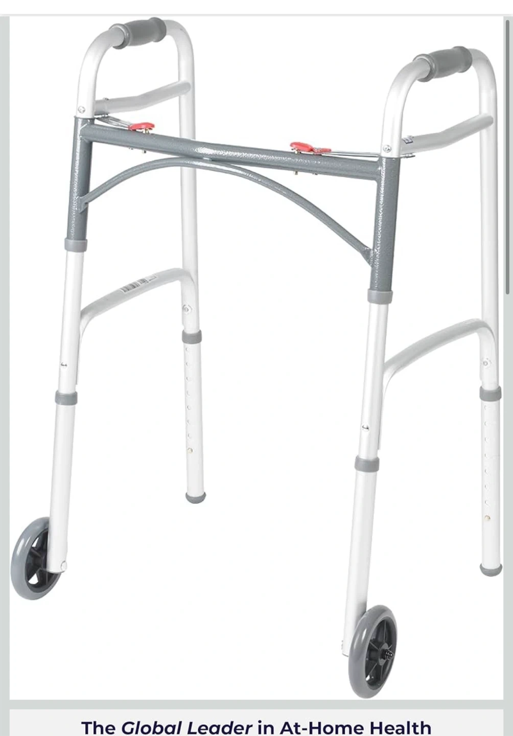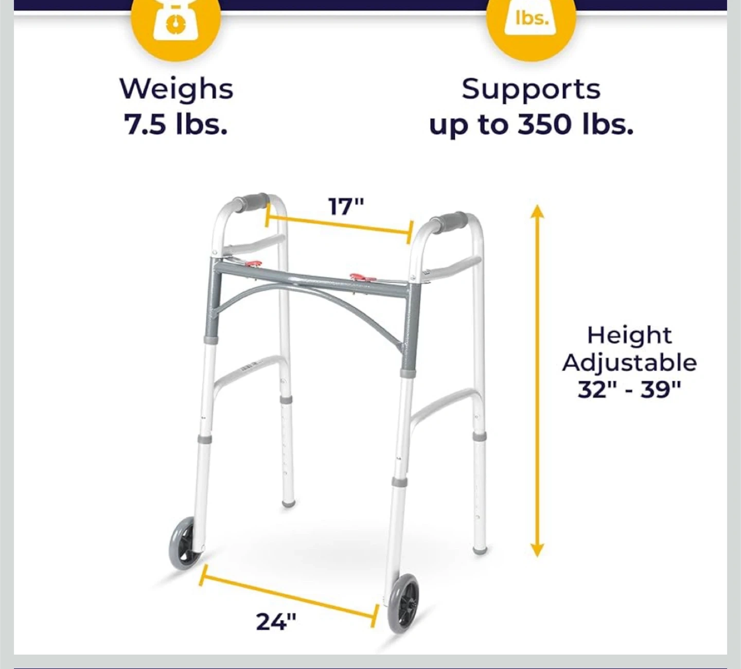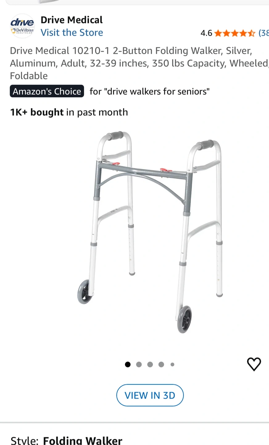 Selling a Drive Medical 10210-1 2-Button Folding Walker in silver. It's designed for adults, is wheeled, and foldable. The height is adjustable from 32 to 39 inches and it supports up to 350 lbs. It weighs 7.5 lbs. The width is 17" and the depth is 24".