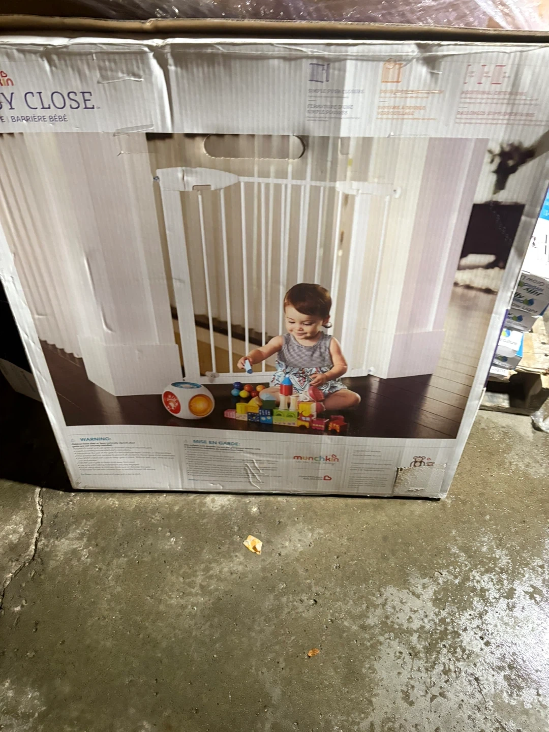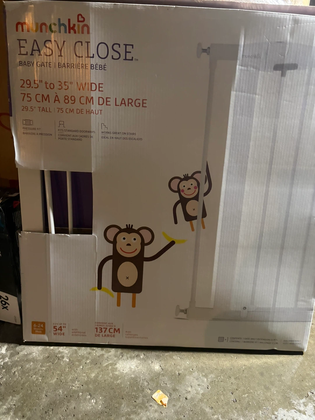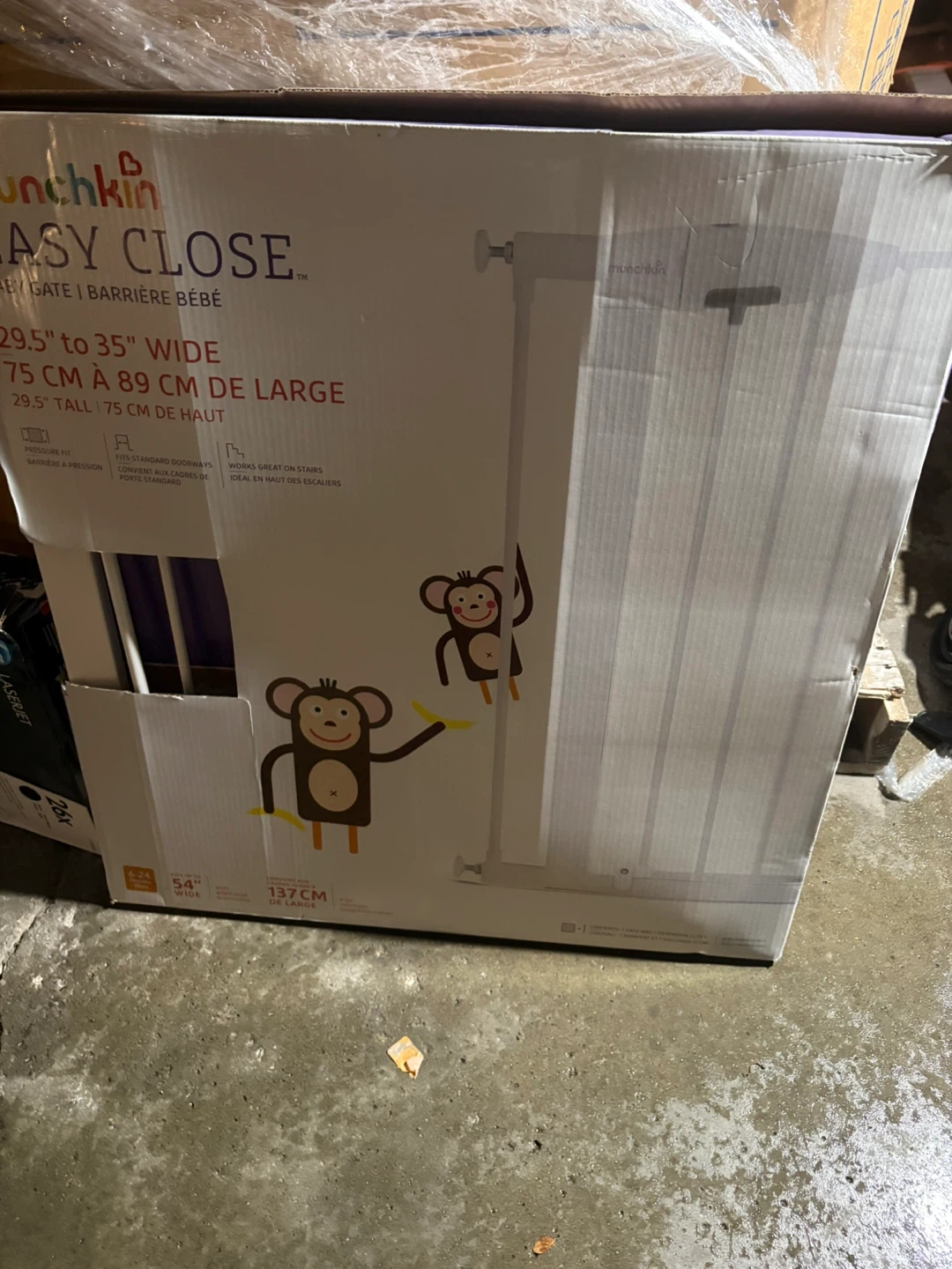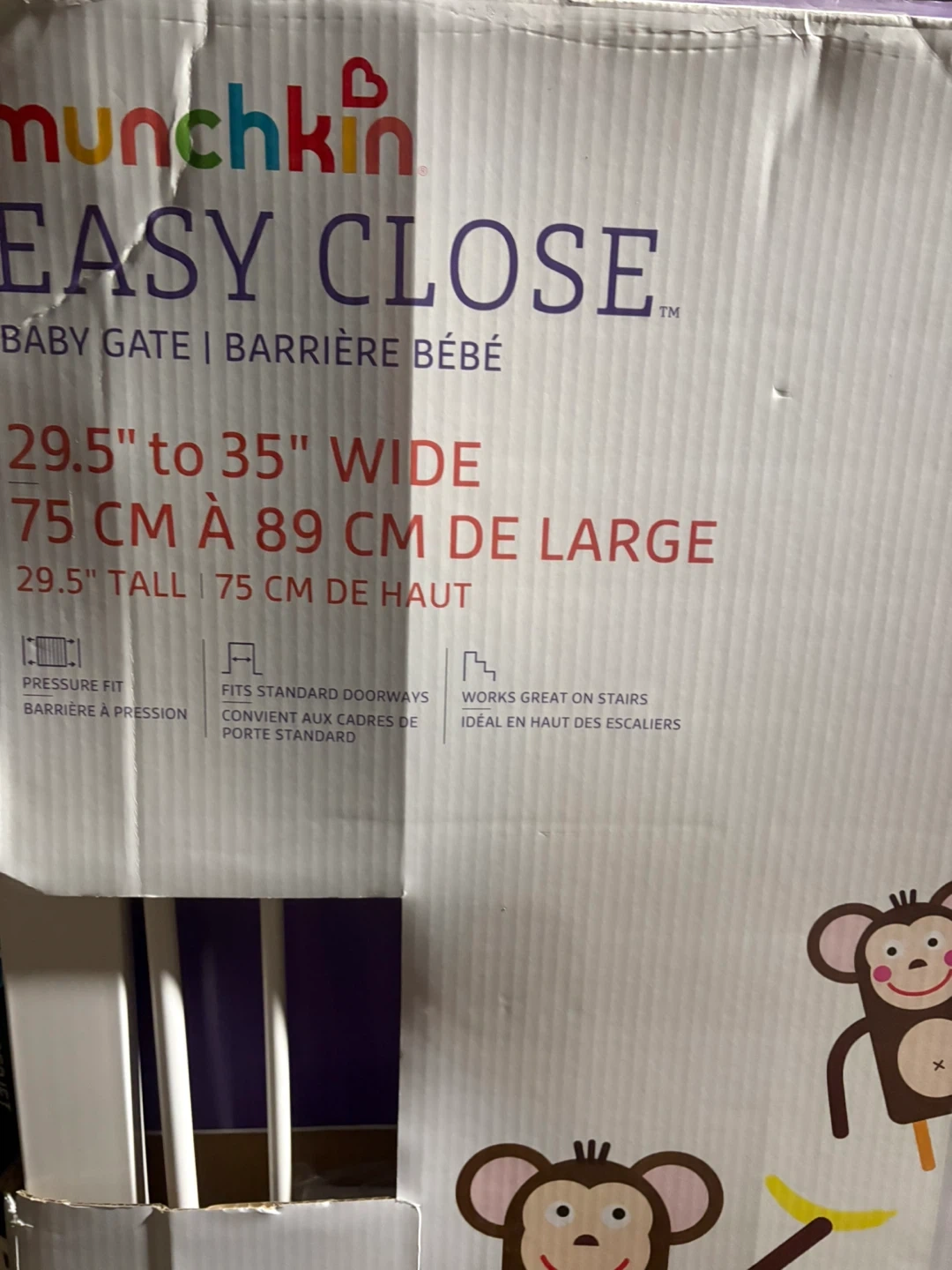 Selling a Munchkin Easy Close baby gate. It fits openings 29.5 to 35 inches wide (75 cm to 89 cm). It's 29.5 inches (75 cm) tall. Great for standard doorways and stairs. The box indicates it can expand to 54 inches (137cm) with included extensions. Perfect for keeping your little one safe!