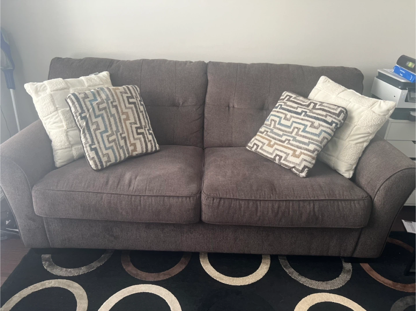 Selling a cozy brown 3 seater sofa! It comes with four decorative pillows, two with a geometric pattern and two white textured ones. The sofa is in good condition and ready for a new home.