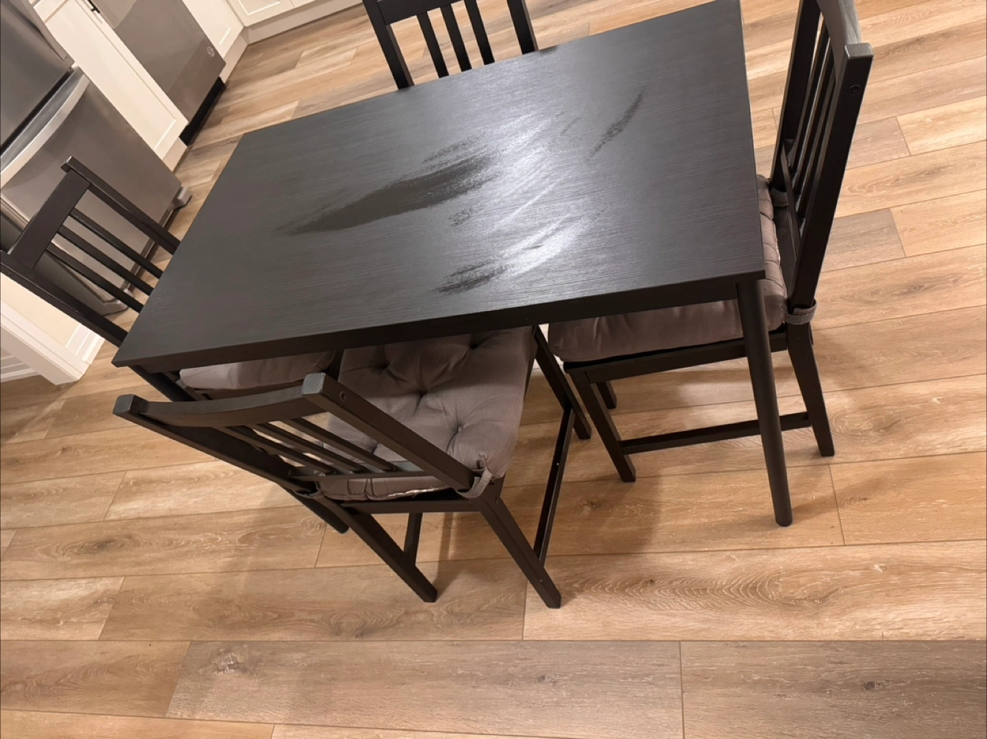 Selling a black dining table with four matching chairs. The chairs have grey cushions for added comfort. There are some visible signs of use on the table's surface, but overall it's in good condition for everyday use