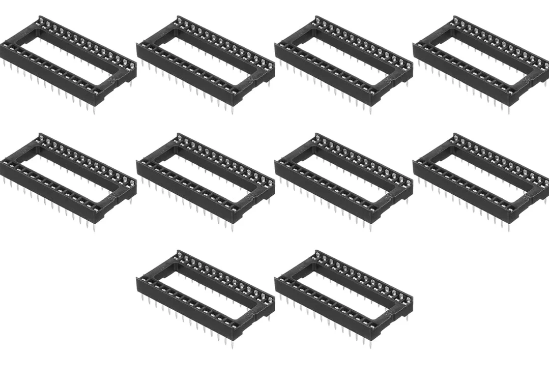 Selling a set of IC sockets, each with 28 pins in a DIP (Dual In-line Package) configuration. These sockets are black and have a pitch of 2.54mm (0.1 inch). The distance between pins is 15.2mm. Each socket measures approximately 35.5mm (1.39 inches) in length and 17.5mm (0.73 inches) in width, with a height of 8mm (0.31 inches). Perfect for your electronics projects!