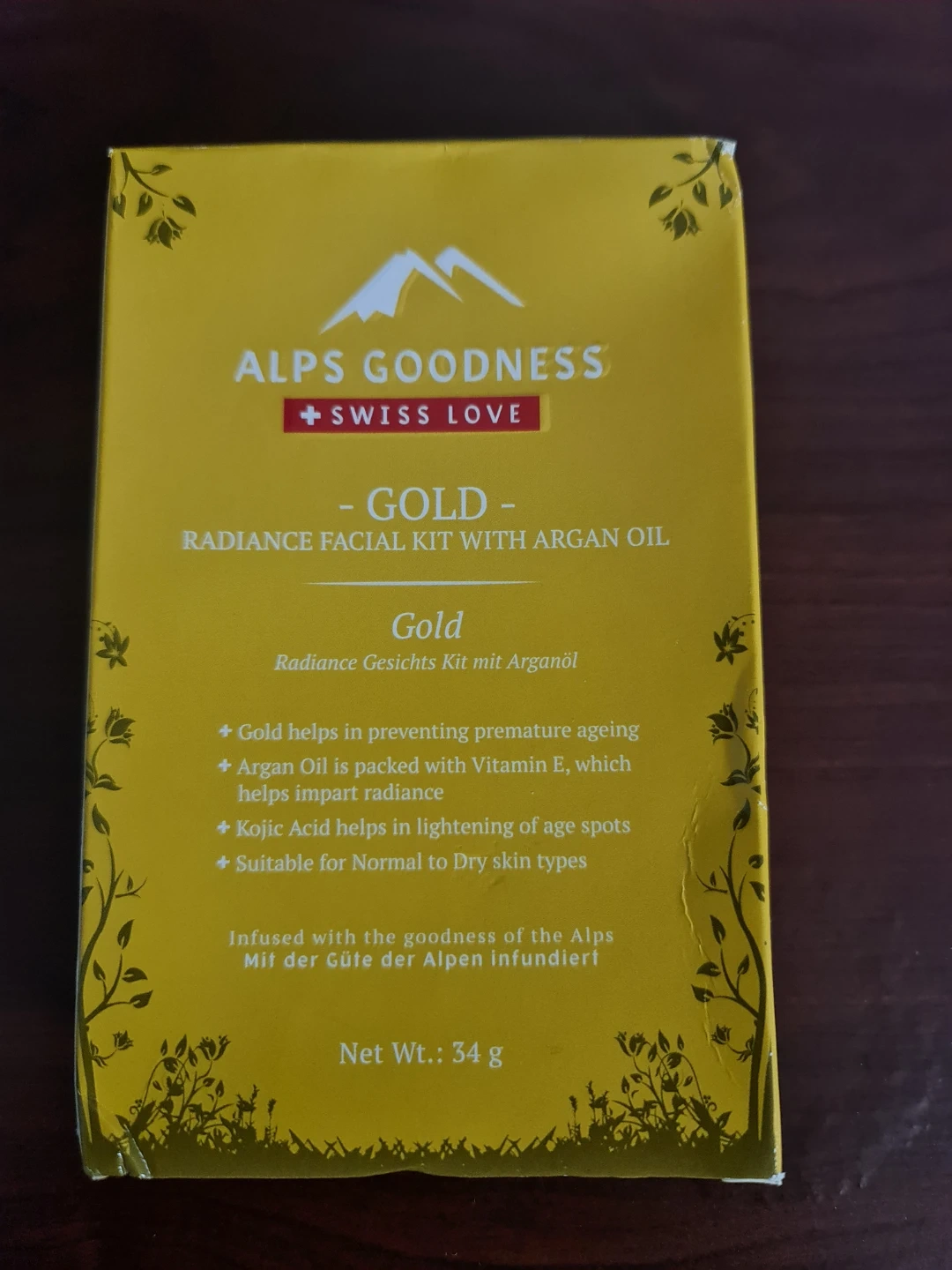 Selling an Alps Goodness Gold Radiance Facial Kit with Argan Oil. It helps in preventing premature aging and is suitable for normal to dry skin types. Argan Oil is packed with Vitamin E, which helps impart radiance, and Kojic Acid helps in lightening age spots. Net weight is 34 g