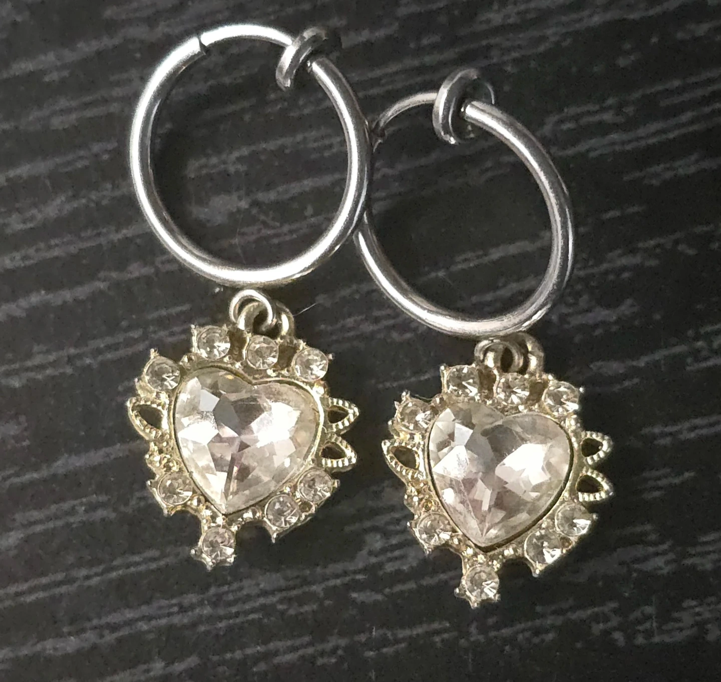 These are a pair of cute heart drop clip on earrings with silver-tone hoops and clear stone accents. They're perfect for adding a little sparkle to any outfit!