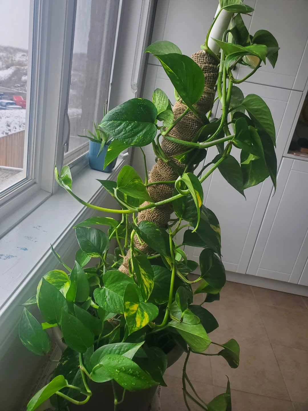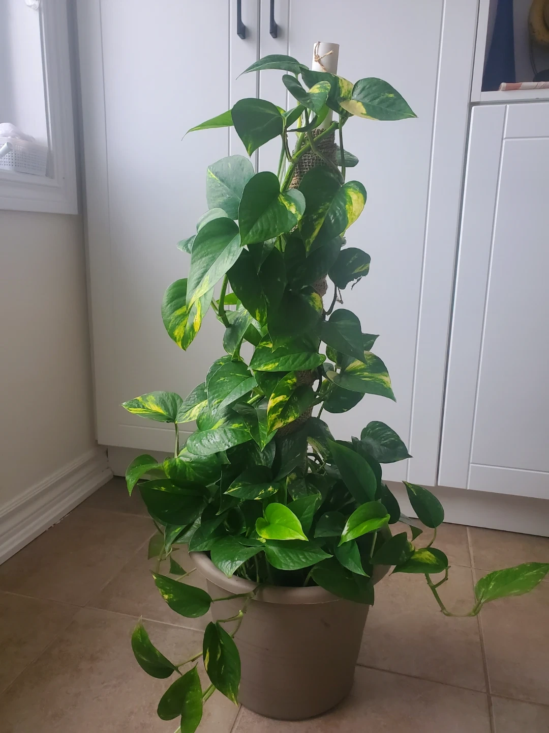 Selling a healthy pothos plant with a moss pole! It's a beautiful addition to any home and easy to care for. The moss pole helps the plant climb and grow taller, making it a lovely decorative piece