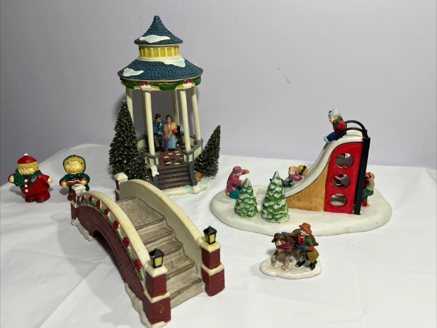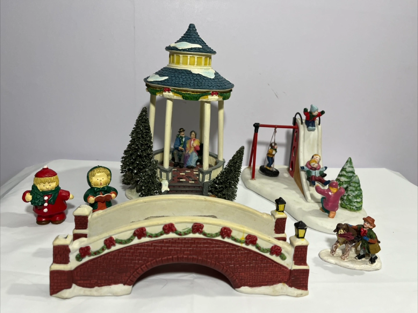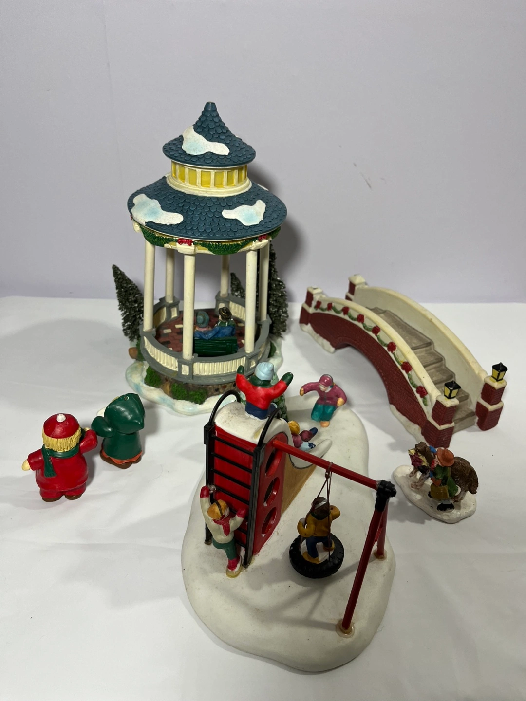 Selling a charming Christmas village decoration set. Includes a gazebo, a bridge, carolers, and a playground scene. Perfect for adding a festive touch to your holiday decor